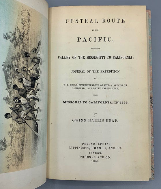 Central Route to the Valley of the Pacific, from the Valley of the Mississippi to California: Journal of the Expedition of E. F. Beale, Superintendent of Indian Affairs in California, and Gwinn Harris Heap, from Missouri to California, in 1853 Author: Heap, Gwinn Harris Title: Central Route to the Valley of the Pacific, from the Valley of the Mississippi to California: Journal of the Expedition of E. F. Beale, Superintendent of Indian Affairs in California, and Gwinn Harris Heap, from Missouri to California, in 1853 Publication: Philadelphia; London: Lippincott, Grambo, and Co.; Trübner and Co, 1854 Edition: First edition Description: Leather bound. 136; 16pp. Octavo [23 cm] in rebound red calf over marbled boards, with gilt spine title and raised spine bands, new endpapers. Occasional minor tide marks in the top margins, and light pencil marginalia. Very good +. "This book is one of the first detailed examinations of the "Central Route" from Missouri to the Pacific, and a basic piece of Western Americana"--Cowan, p.273. Flake 3934. Howes H365. Wagner-Camp 235. Wheat Transmississippi 808. With content pertaining to the Mormons and Utah. It is noted in Flake that the author witnesses the evacuation of Paragonah as ordered by Brigham Young during the Walker War, describes Parowan and Little Salt Lake, relates the Mormon custom of securing Indian babies, and discusses Mormon-Indian relations. Complete with 13 tinted lithographic plates. Several pages of advertisements and the uncommon folding map (tape repairs and some restoration; several fold splits not taped; a handful of notations and markings) at rear. The map spans from Van Buren (Fort Smith) and Independence on the east, and the Pacific Ocean, and from Lake Sevier (here not named) near "Massacre of Capt. Gunnison & Party," north to Pike's Peak, and through to San Bernardino Mt and Santa Fe to the south. The map highlights several significant routes- "Road from Independence to Santa Fe,' "Trail from California to Abiquiu New Mexico," and "Rev'd Mr. Brier's Route." It also includes details of the Rocky Mountain area. With regards to this important map, Wheat notes, "A Note on the map reads, 'The route from the mouth of the Huerfano R. to Las Vegas de Santa Clara is from notes kept by G. H. Heap during the Expedition of Superintendent Beale from Westport M-ri. to California in the year 1853. The remainder is from the surveys of J. C. Fremont and others.'" The copy that we offer is superior, as it is not usually seen with the map. Seller ID: 56335 Subject: Western Americana Ken Sanders Rare Books Ken Sanders Rare Books is a full-service antiquarian bookshop in downtown Salt Lake City. We have a vast inventory of used and rare books, a handful of new books, and an ever-changing selection of art, ephemera, maps, photographs, and postcards. We specialize in Utah & the Mormons and Western Americana, with emphases on the Grand Canyon and the Colorado River, Yellowstone, and other national parks. The literary West is well-represented here, with deep selections of Edward Abbey, Wallace Stegner, B. Traven, and more. We offer rare and collectible books in many subjects, including Literature, Art, Photography, Children's and Illustrated Books, and Wordless Novels. Proprietor Ken Sanders has been buying, selling and collecting books since childhood. He co-owned and ran the legendary Cosmic Aeroplane Bookstore in the 1970s and founded Dream Garden Press , our in-house publishing company, in 1980. Terms & Guarantee All orders ship within 1-3 business days after receiving payment. Standard mail is USPS Media Mail. Delivery typically takes 7-10 business days after shipment. Expedited and international shipping options are also available. All items are guaranteed to be as described or they may be returned within 30 days of receipt for a full refund (prior notice appreciated). We are members of the ABAA (Antiquarian Booksellers Association of America) and the Independent Online Booksellers Association (IOBA), and we adhere to these associations' strict ethical guidelines and conditions of sale. Feedback We leave feedback for buyers once they have posted feedback for us. If you are unhappy with any aspect of a transaction with us, please contact us immediately. We work hard to keep buyers happy and to resolve the rare problem promptly. This listing was created by Bibliopolis.