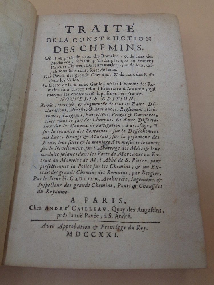 H. Gautier Treaty of the construction of paths Paris, 1721 Half Basane (20x13cm), 334 pages with frontispiece and portrait + 1 card & 6 plans Freeders if not good condition (complete collated) H. Gautier Treaty of the construction of paths Paris, 1721 Half Basane (20x13cm), 334 pages with frontispiece and portrait + 1 card & 6 plans Freeders if not good condition (complete collated)