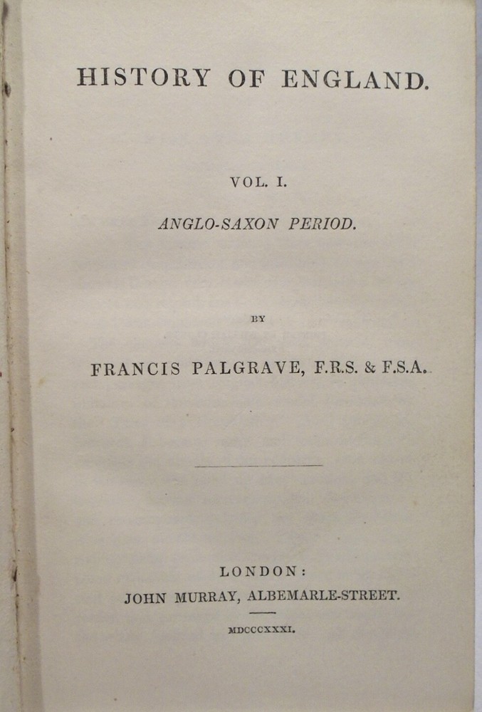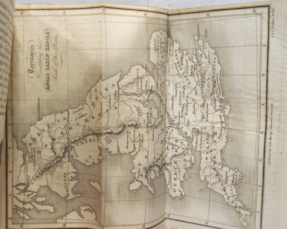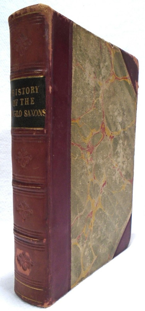 "History of England: Anglo-Saxon Period," by Francis Palgrave, F.R.S. & F.S.A. Volume I only. First Edition, 1831. With numerous engravings and four maps, including two fold-outs. Very Good. Three quarter leather over marbled boards, blind-stamped bands to front and rear leather, raised gilt bands and decorative blind-stamping to spine with gilt title. Rubbing to all four corners and to spine head and tail, rubbing to bottom quarter of spine, moderate wear and fading to front and rear boards and edges. Hinges cracked but attached. Light age-toning to text block but otherwise clean. Binding tight.
