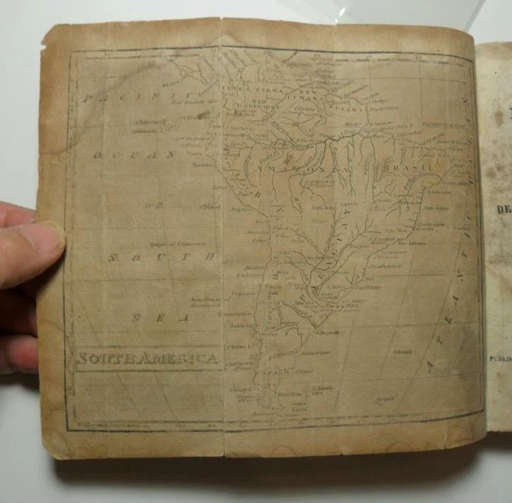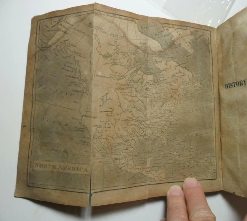 THE HISTORY OF NORTH AND SOUTH AMERICA FROM ITS DISCOVERY TO THE DEATH OF GEN WASHINGTON BY RICHARD SNOWDEN AND PUBLISHED BY BENJAMIN WARNER PHILADELPHIA IN 1819 TWO VOLUMES IN ONE WITH TWO FOLD OUT MAPS; ONE OF NORTH AMERICA AND THE OTHER OF SOUTH AMERICA. SMALL BOOK (7.5" X 4.5") CONTAINS 157 PAGES IN VOL 1 AND 132 PAGES IN VOL 2. FOLD OUT MAPS ARE APPROX 7.5" X 7.5" IN SIZE: MAP OF SOUTH AMERICA CONTAINS DAMP STAIN UPPER EDGE AND SMALL 2" TEAR LOWER FOLD, MAP OF NORTH AMERICA CONTAINS DAMP STAIN UPPER EDGE AND SMALL 2" TEAR LOWER FOLD. BOOK IS IN FAIR GOOD CONDITION WITH CHIP OFF UPPER SPINE, SPINE ENDS AND EDGES RUBBED, CORNER TORN OFF FRONT FREE ENDPAPER, WRITING AND SCRIBBLING ON INSIDE COVERS AND ENDPAPERS, PAGES DARKENING WITH SIGNIFICANT FOXING. POSTAGE $3.50 IN THE UNITED STATES AND BY ARRANGEMENT OVERSEAS. I COMBINE ORDERS TO SAVE ON POSTAGE. PAYPAL ACCEPTED....GOOD LUCK! Pictures sell! Auctiva offers Free Image Hosting and Editing. The complete eBay Selling Solution. Track Page Views With Auctiva's FREE Counter