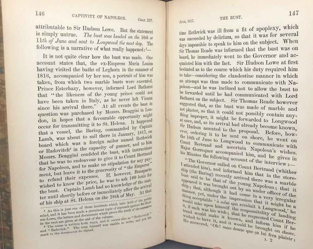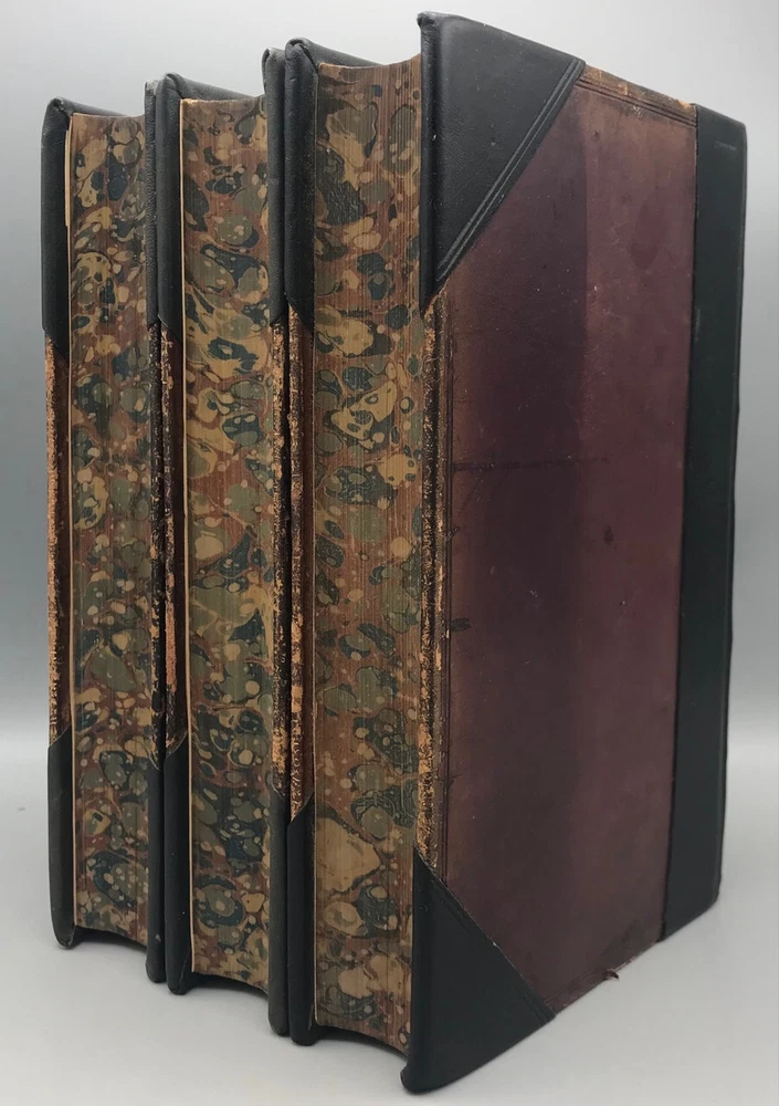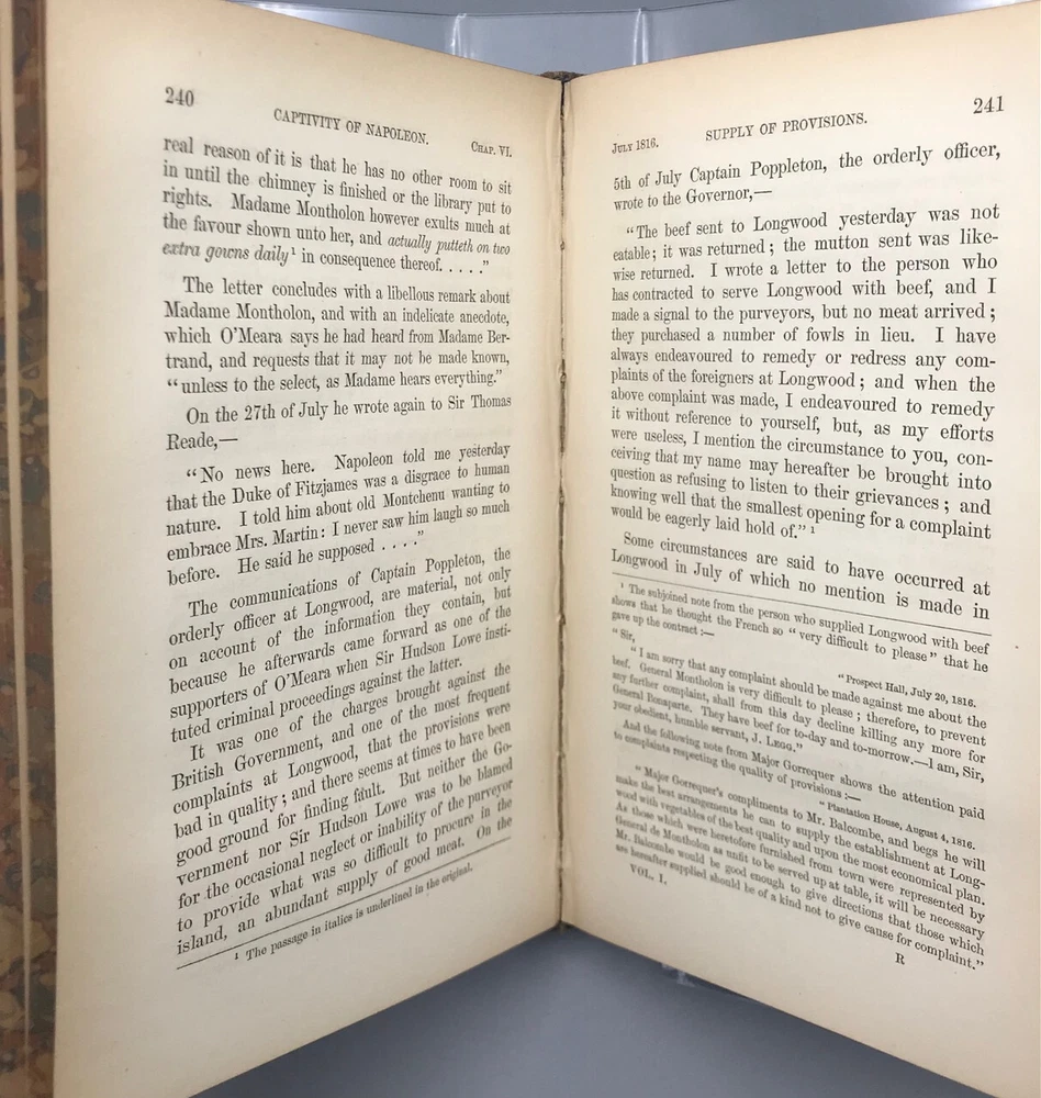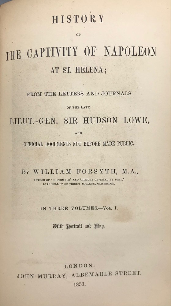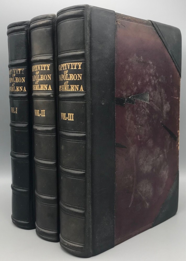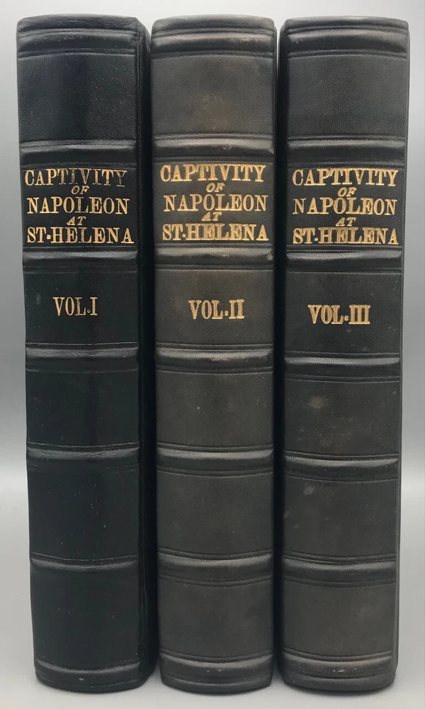 HISTORY OF THE CAPTIVITY OF NAPOLEON AT ST. HELENA, by William Forsyth - 1853 HISTORY OF THE CAPTIVITY OF NAPOLEON AT ST. HELENA, by William Forsyth - 1853 History of the Captivity of Napoleon at St. Helena; from the letters and journals of the late Lieut.-Gen. Sir Hudson Lowe, and official documents not before made public. 3 volumes by William Forsyth First edition, three volumes. London: John Murray, 1853 Hardback set is overall in VERY GOOD condition. Cordovan calf covers, three-quarter wrapped in black calf, have tooled borders, raised bands on spines with gilt titles. Boards show some smudges, bumps, sunning, dings, stains, edgewear. Corners are bumped. See photos. Spines has gilt text and are a little sunned, with bumped ends. Bindings are firm; some cracking as at vol. 1, page 240. See photos. Pastedowns and feps have a few marks. Frontispieces are present; V. 1 is portrait of Sir Hudson Lowe, V. 2 is a view of Longwood, V. 3 also a view of Longwood has small closed tear at front edge. See photos. Foldout map at back of Vol. 1 has a long closed tear at lower left edge where it is bound in. See photos. Interior is gently age-toned. Inside pages are free of writing and intentional marks. Text block edges are marbled to coordinate with bindings. PS2023.1011 495 + 490 + 529 pages. 5.25 x 8.5 inches Complete in three volumes. Important account of Napoleon's exile based on the letters and journals of Sir Hudson Lowe (1769-1844). The author, William Forsyth (1812-1899), sought to prove that neither the British government nor Sir Hudson Lowe was at fault as regards the treatment of Napoleon at St. Helena. With engraved portrait of Hudson Lowe, two wood engraved views of Longwood, the residence built for Napoleon. Folding map of St. Helena opens to 20x24 inches. First edition. Printed by W. Clowes and Sons, Stamford Street. AS IS! Please see photos. More photos available upon request. International first class shipping includes a handling charge to cover insurance. Domestic orders over $250 include a handling charge to cover signature confirmation. #panoplybooks #rarebooks #bookboutique #collectiblebooks #antiquebooks #vintagebooks #bookstore We invite you to view our Shipping & Returns policies , or to contact us with any questions.