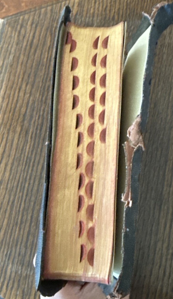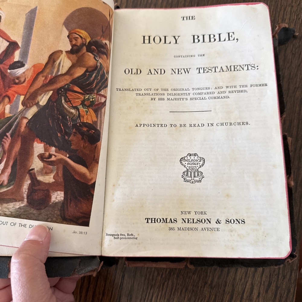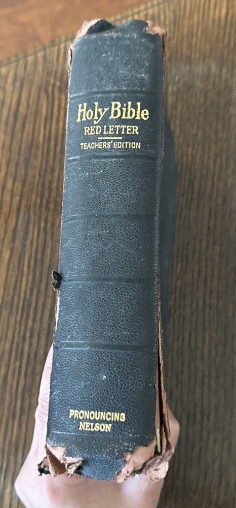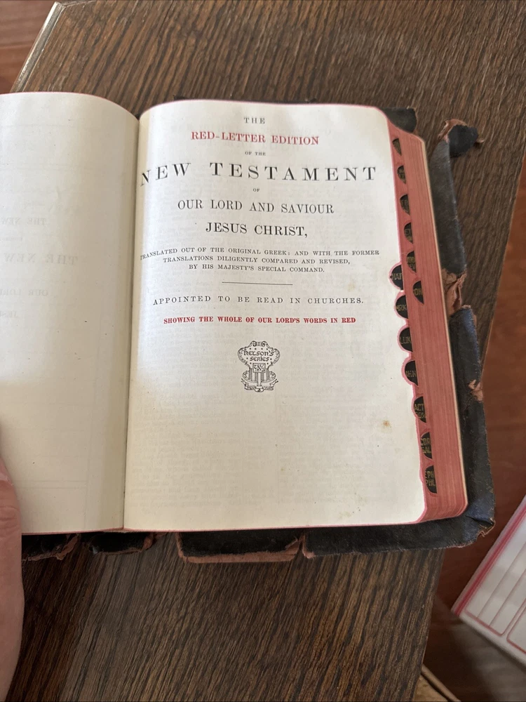 This is a vintage 1900 Holy Bible Teacher's Edition published by Thomas Nelson & Sons. It features red letter text for the words of Jesus, maps, illustrations, and gilded edges. The leather-bound softcover includes both Old and New Testaments in English. The leather cover is worn. Writing in the middle pages. See pics for details.