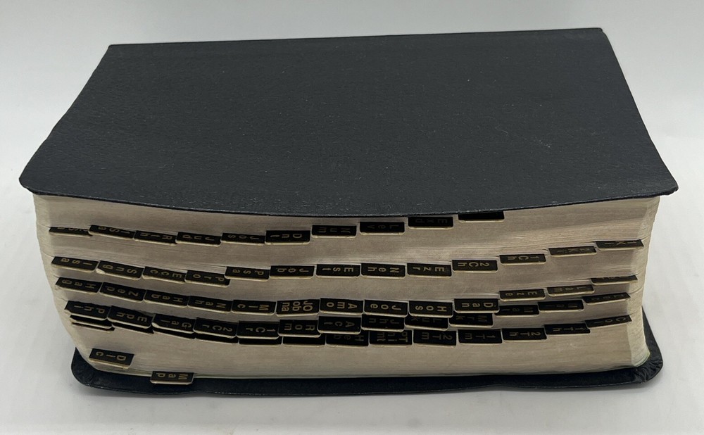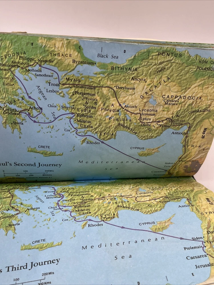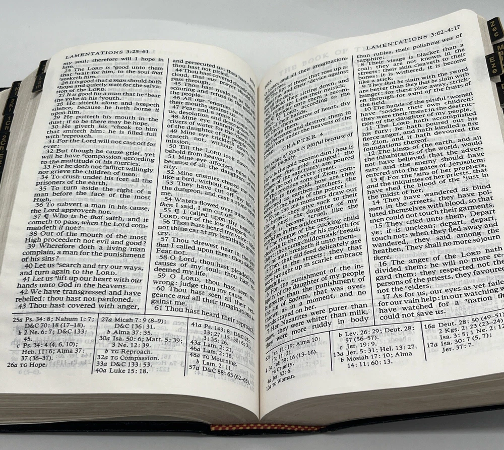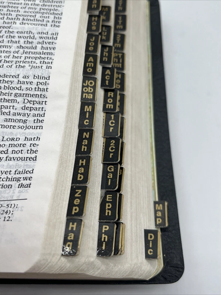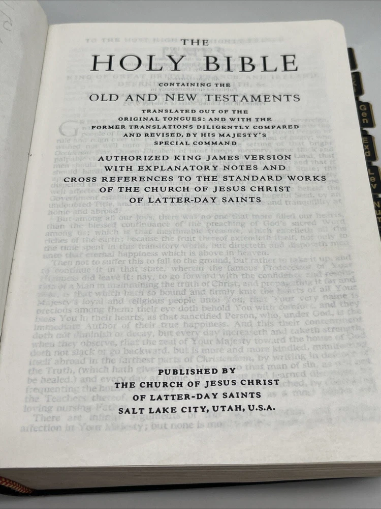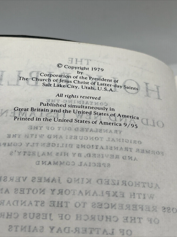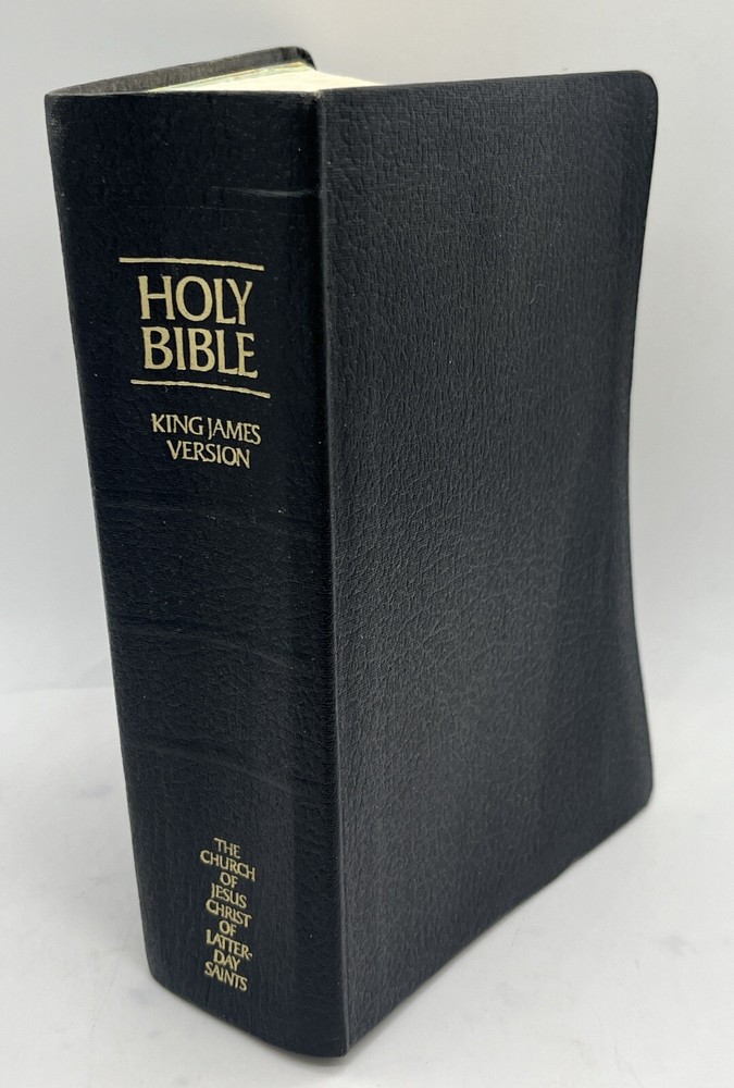 HOLY BIBLE King James Version The Church Of Jesus Christ of LATTER-DAY SAINTS. 1979. This is in overalll nice condition. There is writing on the first two pages. I do not see any other writing or highlighting inside. There are index tabs. The last pages of the book are slighly warped but open smoothly. The book measures 7.25" x 5.25" x 2" thick. Ships with USPS Media Mail. (AQ)