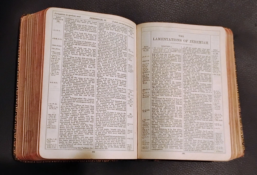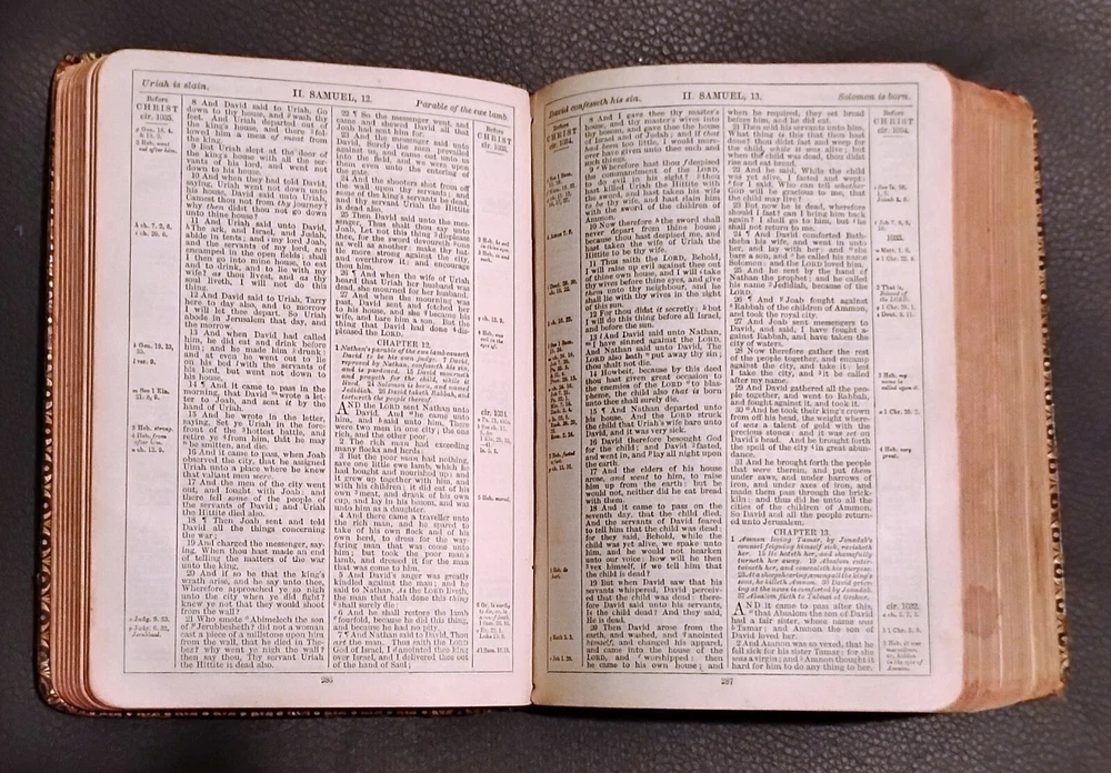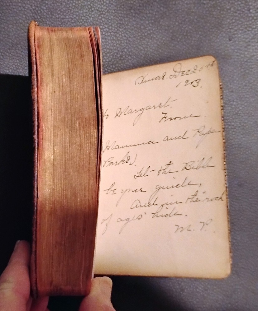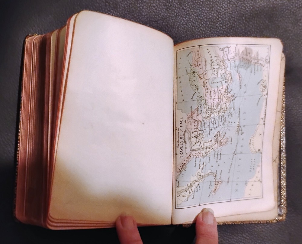 This is a beautiful antique Bible, printed by the Oxford University Press. It is undated, but it was a gift to a young woman and there is an inscription on the back endpaper dated 1913. The book could be older. The owner signed and dated the front endpaper 1914. It is 1000 pages, beginning with the Epistle Dedicatory to King James. At the end, there are 14 pages of maps, printed in color, of Egypt, Jerusalem, Travels of St. Paul etc. The book is 4" x 5 1/2", bound in soft black leather of the finest quality. Each page is rimmed in gold and there is gold on the front and spine. There are no loose or missing pages; it has a few marks and spots here and there and the expected wear to the spine, but it is in superb condition. For more, go to my Ebay Store at https://www.ebay.ca/str/starcanadianseller Please note: I do not accept returns. All sales are final. Also please note that, for the stated delivery price, I only ship to Canada and the continental USA. If you are outside of these areas, please request a shipping quote BEFORE purchasing. If you buy more than one item, I am happy to combine shipping.