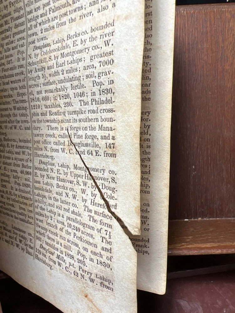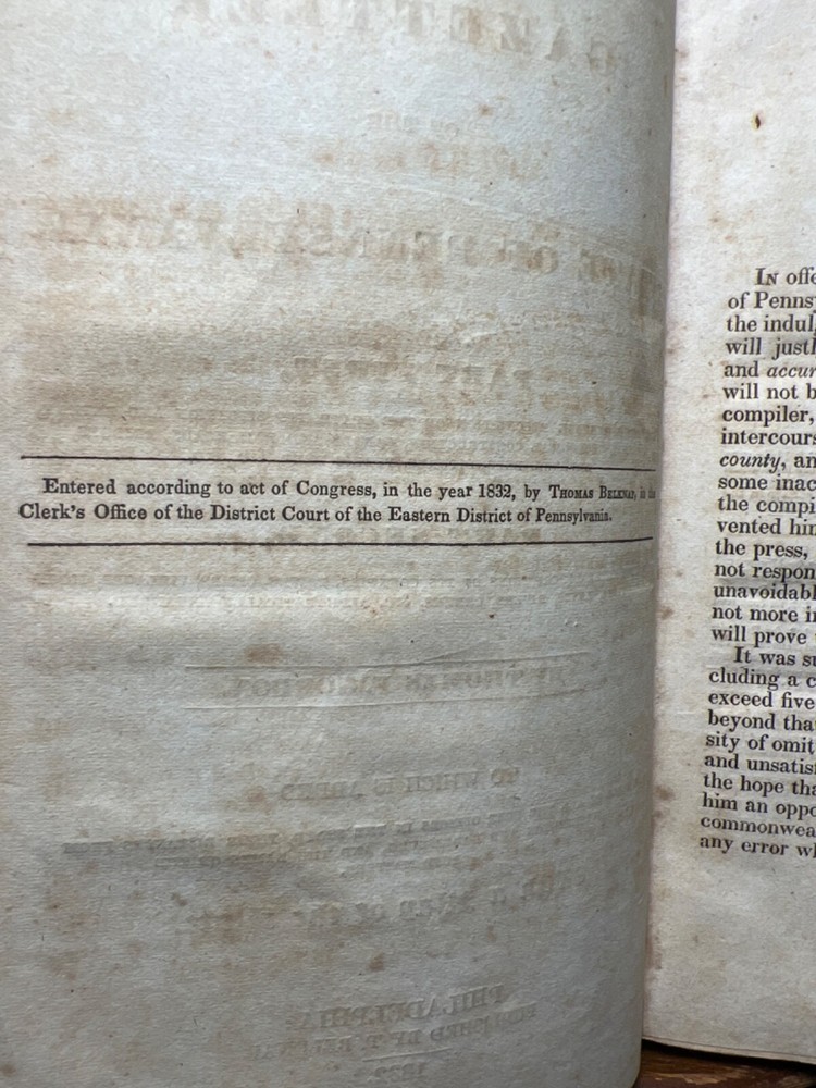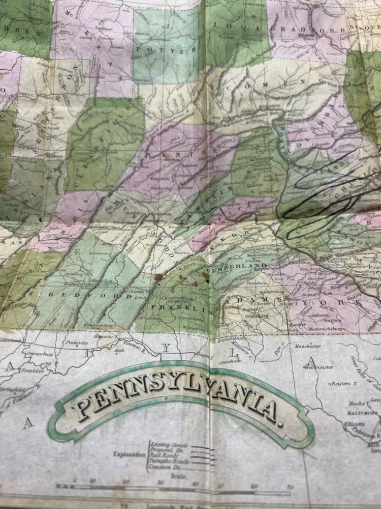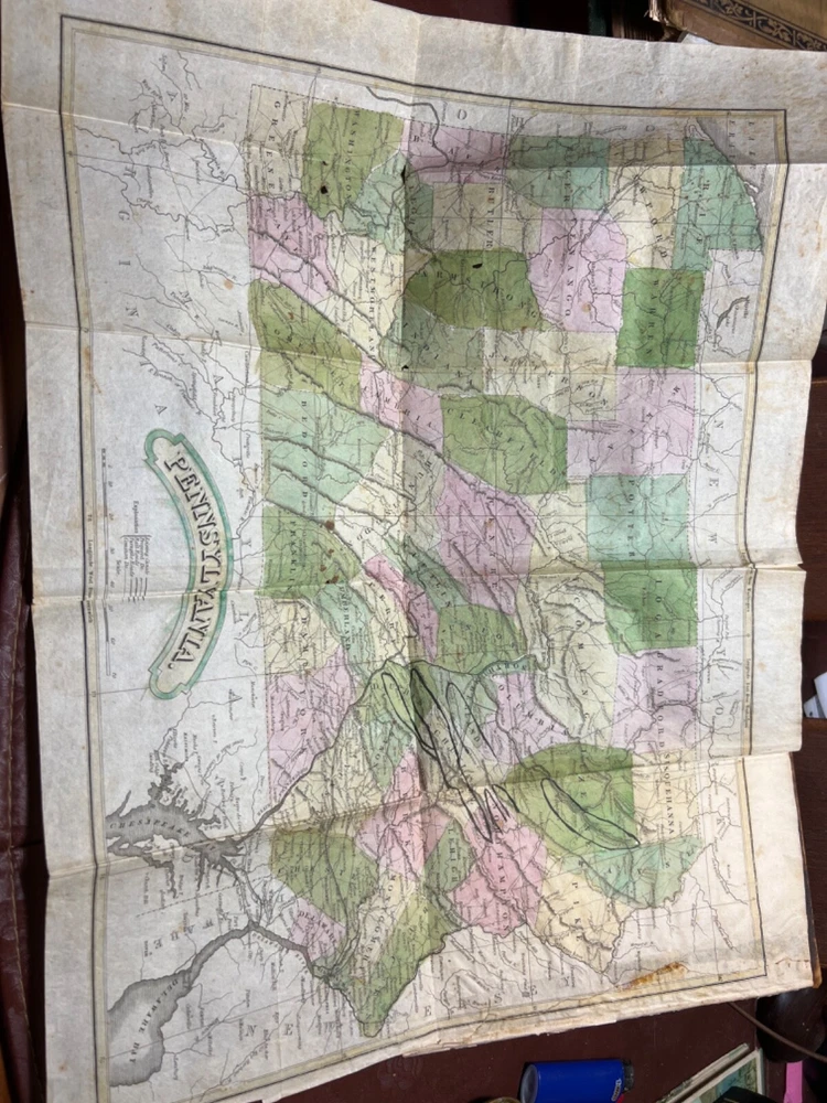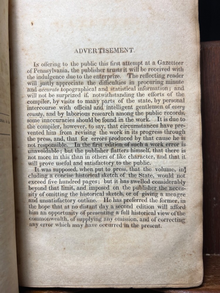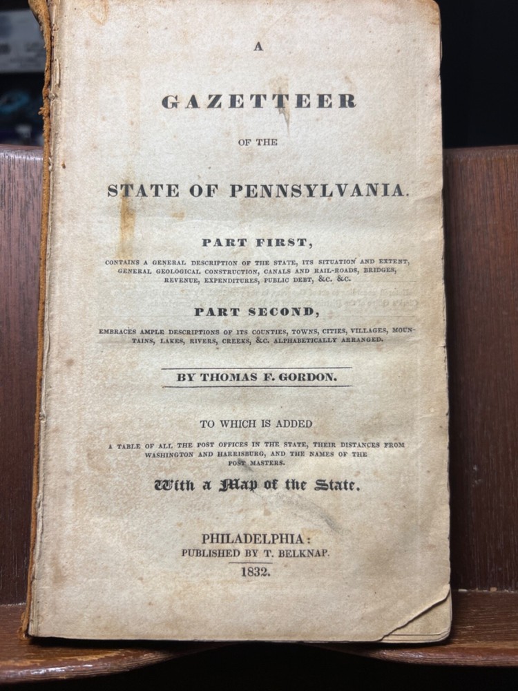 What a fantastic find for the Collector. A wonderful gift idea. General Description of the State… Geological Construction, Canals and Rail-Roads, Bridges, Revenue, Expenditures, Public Debt, &c. Part Second… Counties, Towns, Cities, Villages, Mountains, Lakes, Rivers, Creeks, &c., Alphabetically Arranged. Purported by the publisher to be the first gazetteer of Pennsylvania, compiled from "minute and accurate topographical and statistical information… by visits to many parts of the state, by personal intercourse with official and intelligent gentlemen of every county, and by laborious research among the public records." Historian Thomas Gordon also published a History of Pennsylvania (1829), and gazetteers for both New Jersey and New York. Sabin 27998. A quick internet search will suggest the few 1st Edition copies with the map available via the internet start at $1000.00.