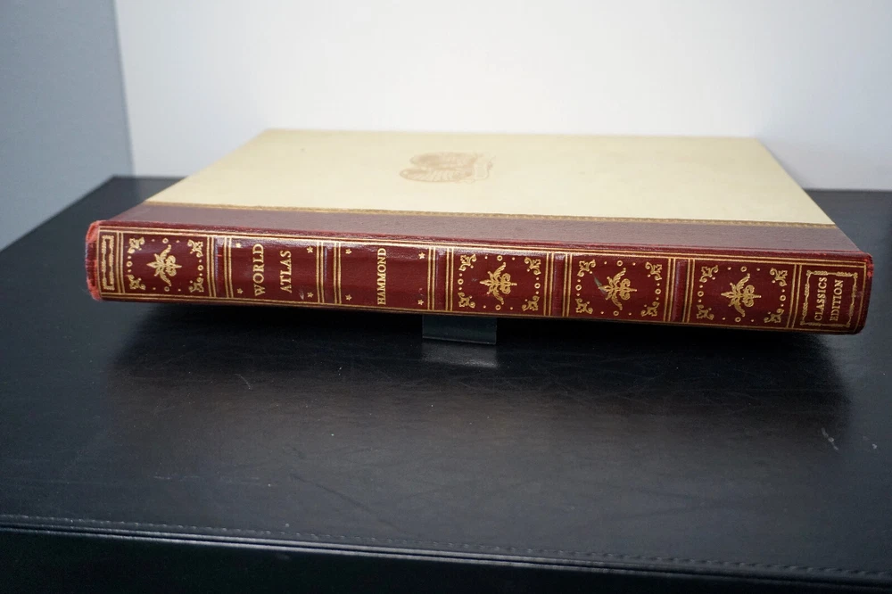 Hammond's World Atlas Classics Edition Leather Bound 1953 Gazeteer Maroon-Gold 280 Pages: Size - 12.5 Inches x 9.5 Inches x 1.2 Inches SHIPPING: Our listed shipping charge is for the USA. We always ship USPS: either Media, Standard or Priority. The fees include the cost of shipping material, handling, shipping or priority mail and insurance if desired. If you receive a damaged item from us, contact us within three days, save all the packing and cooperate with the insurance company. PACKAGING: We take packaging very seriously. The time and expense to double-wrap each piece utilizing, bubble wrap, foam and peanuts to ensure that you receive your item just as we shipped it. RETURNS: If the item received from us is substantially different from our description in the auction listing we will honor a return as well as a refund of your payment. It is important that you e-mail us with the issue of the incorrect item. You must get authorization from us before you return the item. When you get authorization to return the item, then it must be sent back in the same condition that we shipped it to you, in the original packaging. Once we receive the item back, we will open up a case with Ebay to receive a sales credit. Since we accept returns, it is important that you are purchasing the item you want but remember, each item is sold as-is. So, be certain that what we offer is what you want. Of course, we want you to have a great experience purchasing from us and hope that the communication, excellent customer service and the item as described will earn positive feedback from you. We will leave positive feedback for you and hope and expect that you will reciprocate. Thank you in advance.