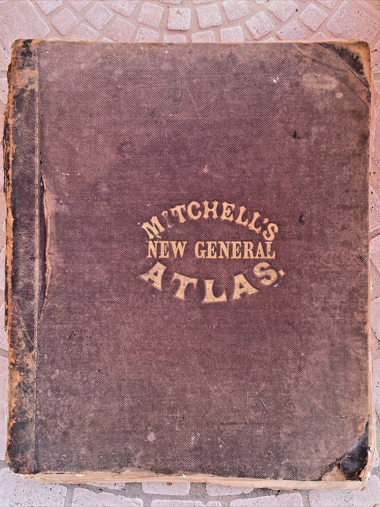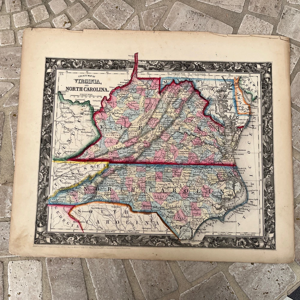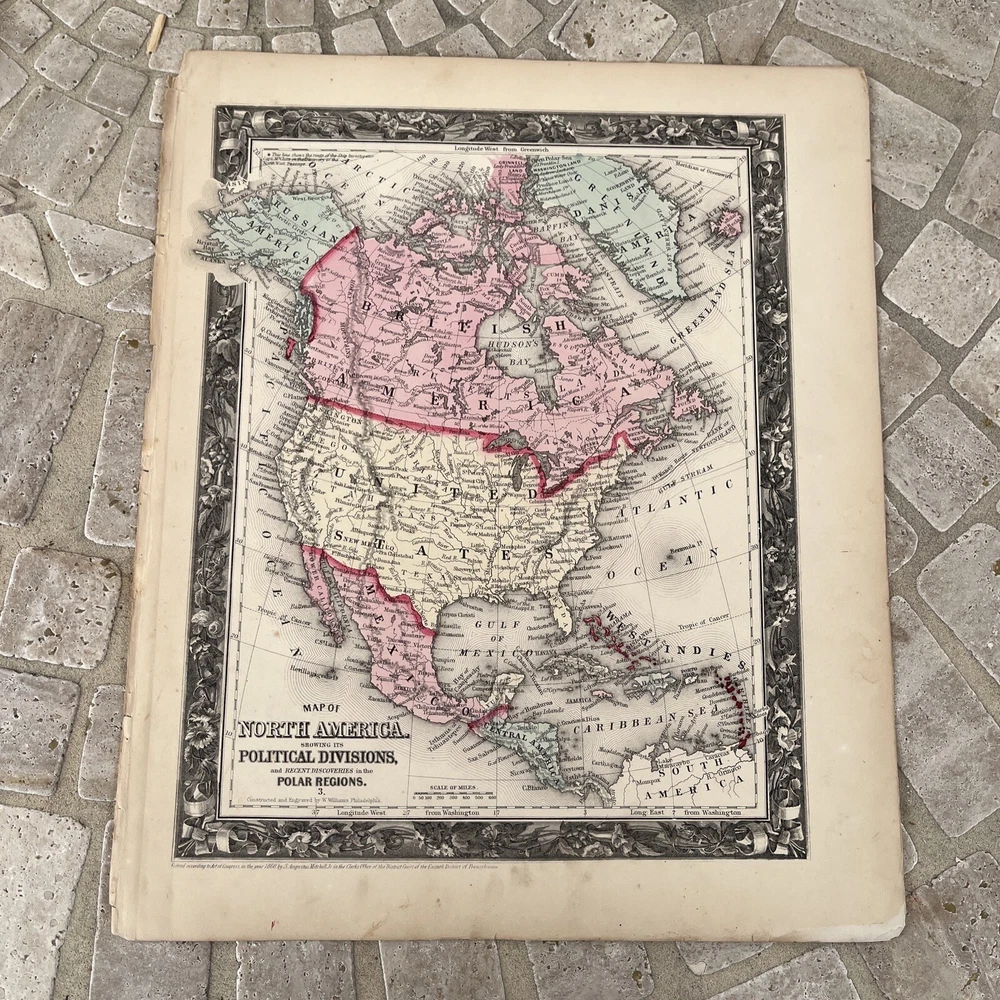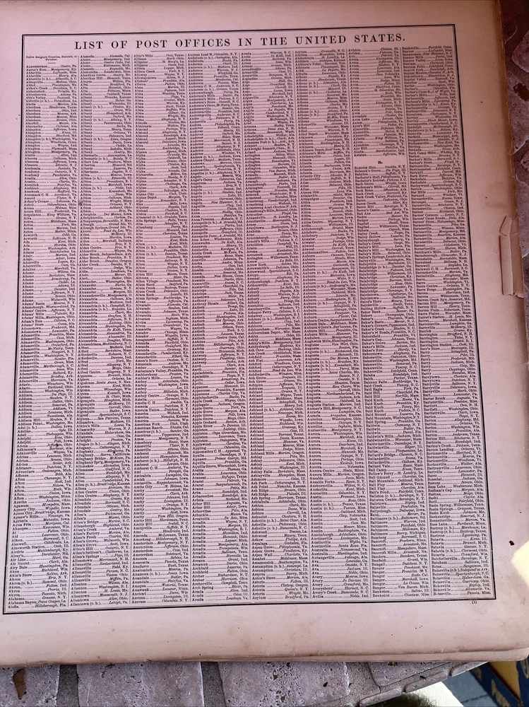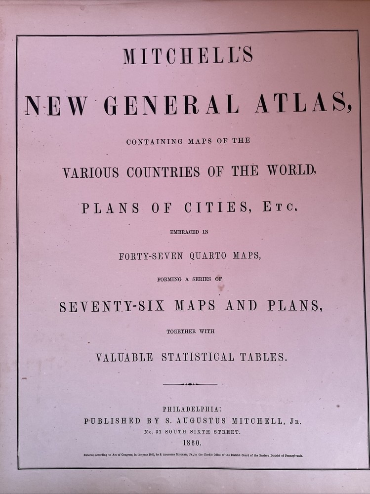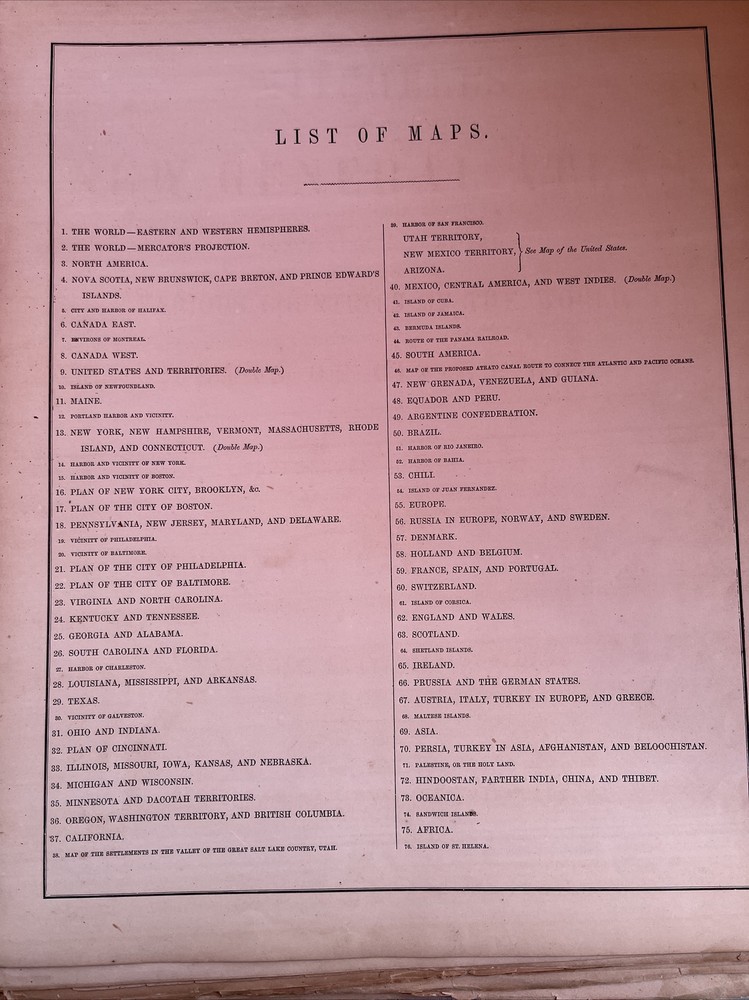 Hand-Coloring Mitchell's New General Atlas S. Augustus Mitchell, Jr. 1860 Fantastic book with amazing maps. Is rough and all pages are detached, but the maps themselves are in great condition except for the edges. Would make a great collection for someones wall art. Size 13" x 16" x 1" Incomplete Atlas Map Numbers are: 3,4,5,6,7,8,11,12,18,19,20,22,23,24,28,29,30,32,33,34,36,40,41,42,43,44,45,46,47,48,49, 50,51,52,53,54,55,56,57,58,62,63,64,65,66,67,68,69,70,71,72,73,74, Some maps are small and are on same pages as bigger maps Also has 22 pages of US post office A to Z