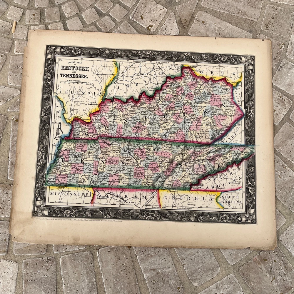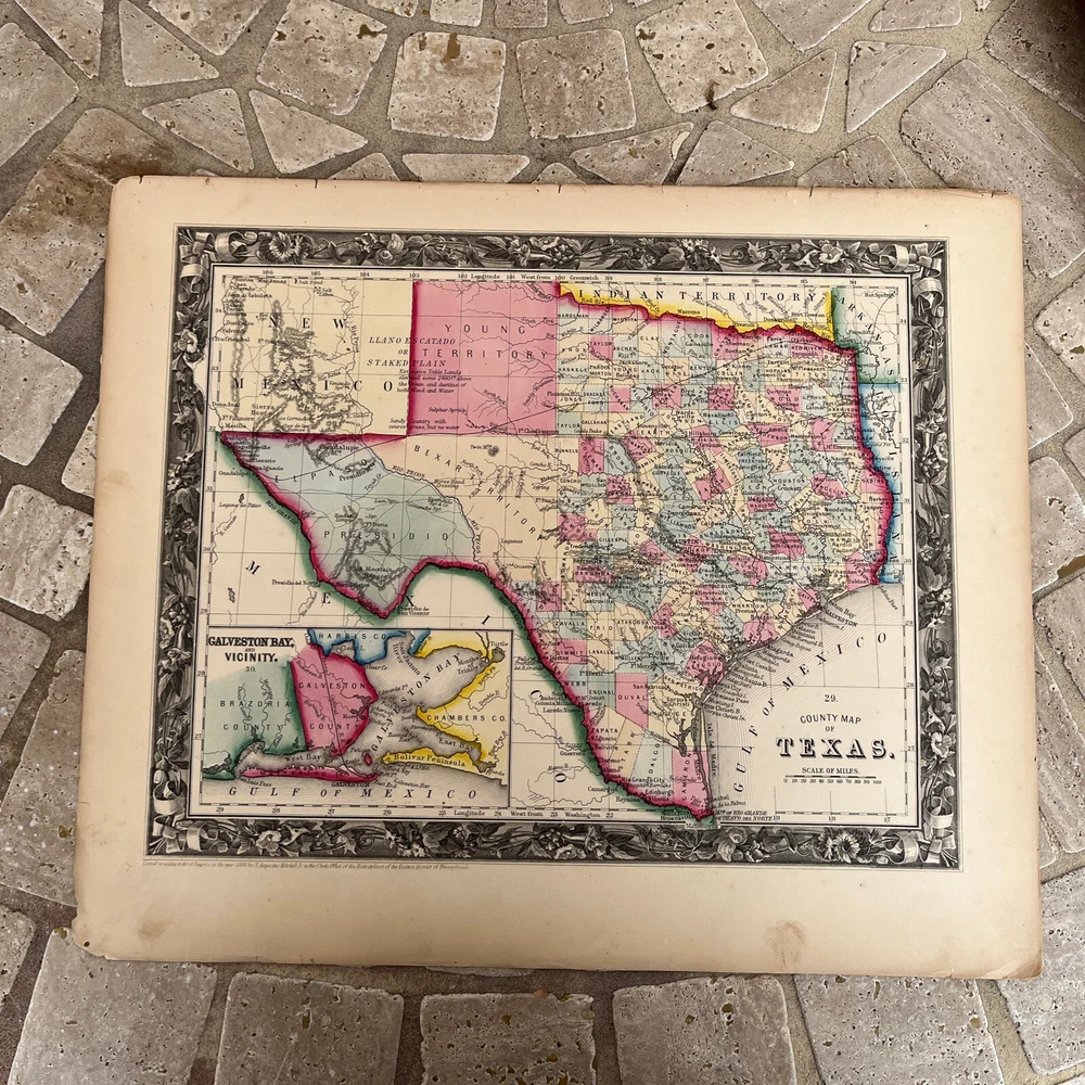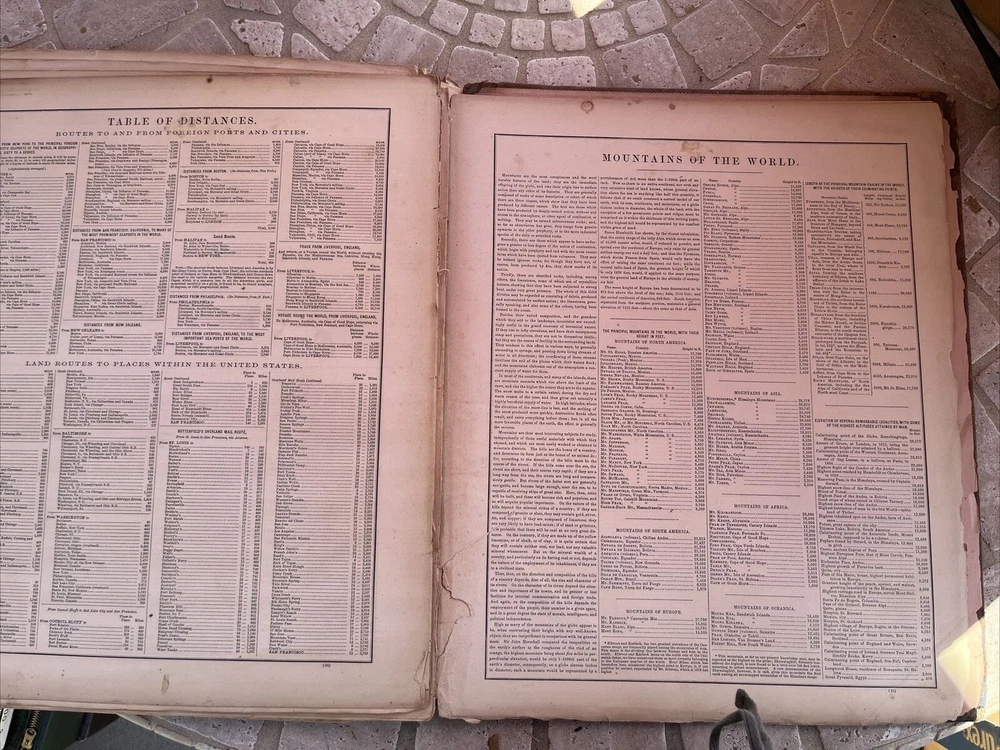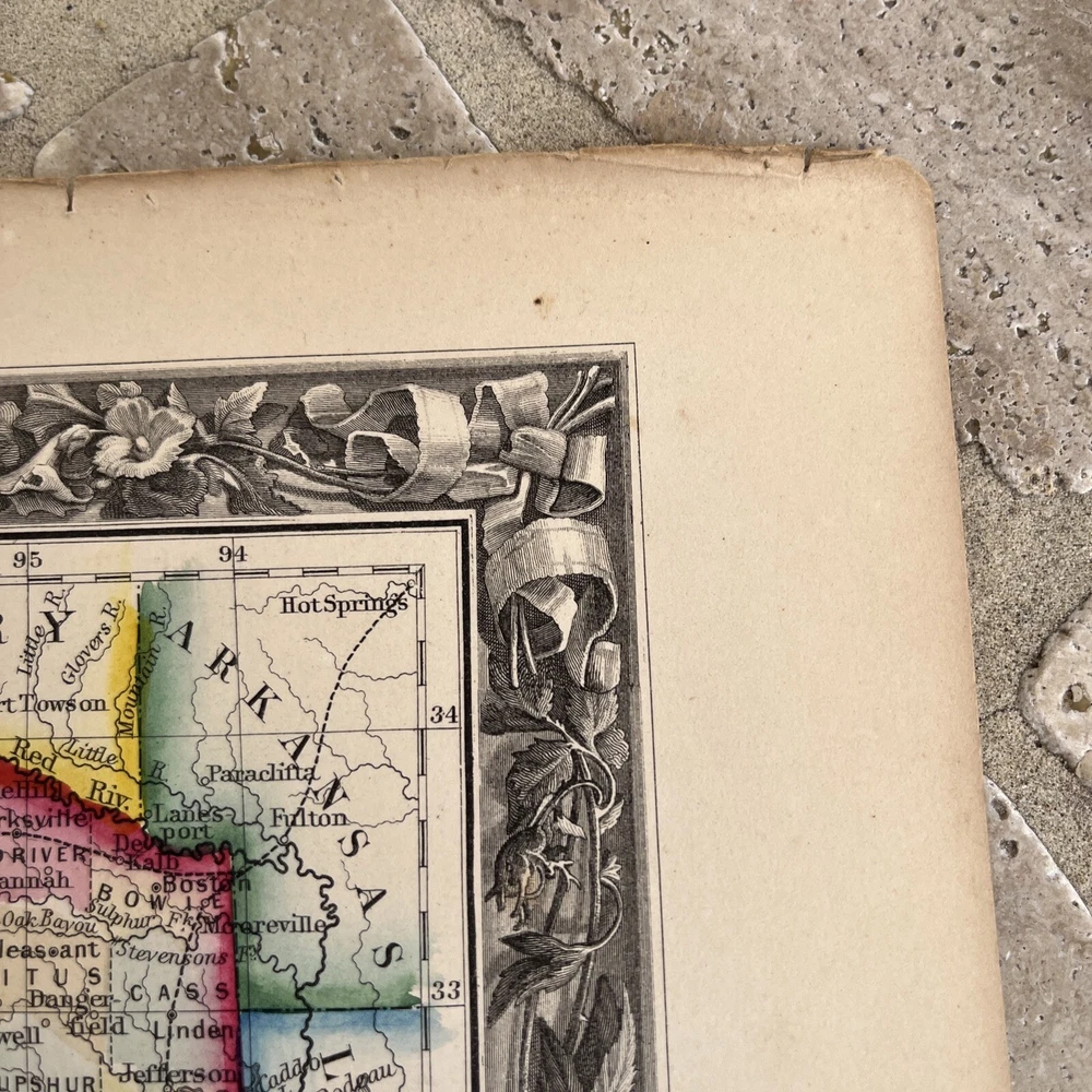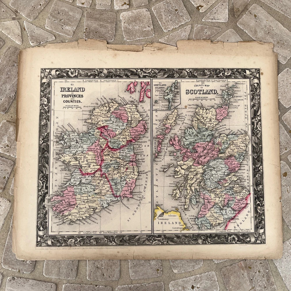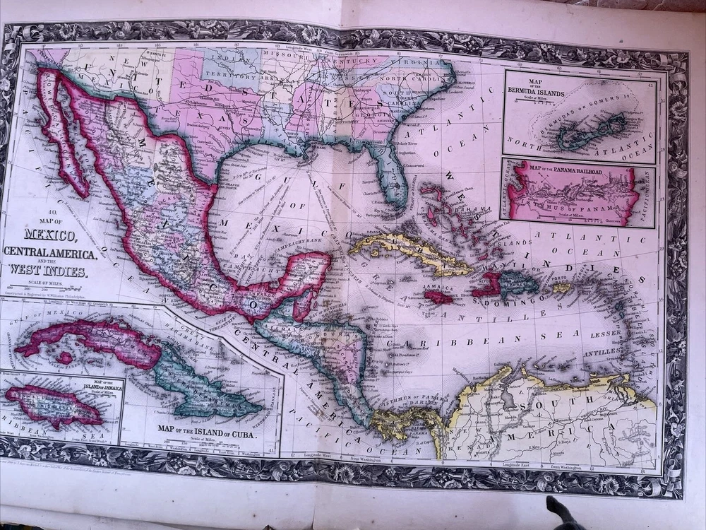 Hand-Coloring Mitchell's New General Atlas S. Augustus Mitchell, Jr. 1860 Fantastic book with amazing maps. Is rough and all pages are detached, but the maps themselves are in great condition except for the edges. Would make a great collection for someones wall art. Size 13" x 16" x 1" Incomplete Atlas Map Numbers are: 3,4,5,6,7,8,11,12,18,19,20,22,23,24,28,29,30,32,33,34,36,40,41,42,43,44,45,46,47,48,49, 50,51,52,53,54,55,56,57,58,62,63,64,65,66,67,68,69,70,71,72,73,74, Some maps are small and are on same pages as bigger maps Also has 22 pages of US post office A to Z