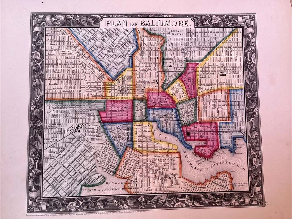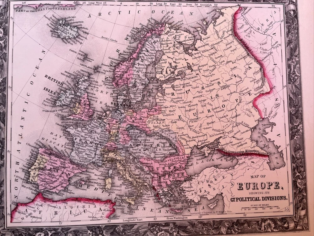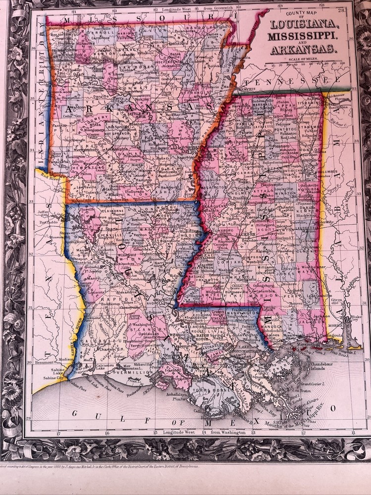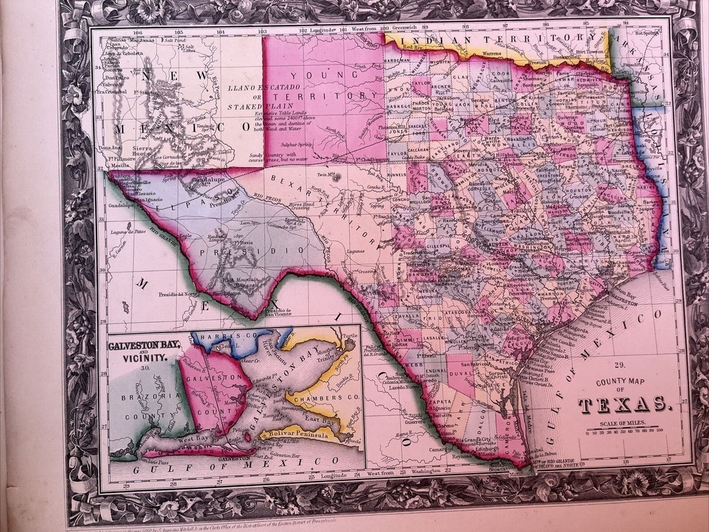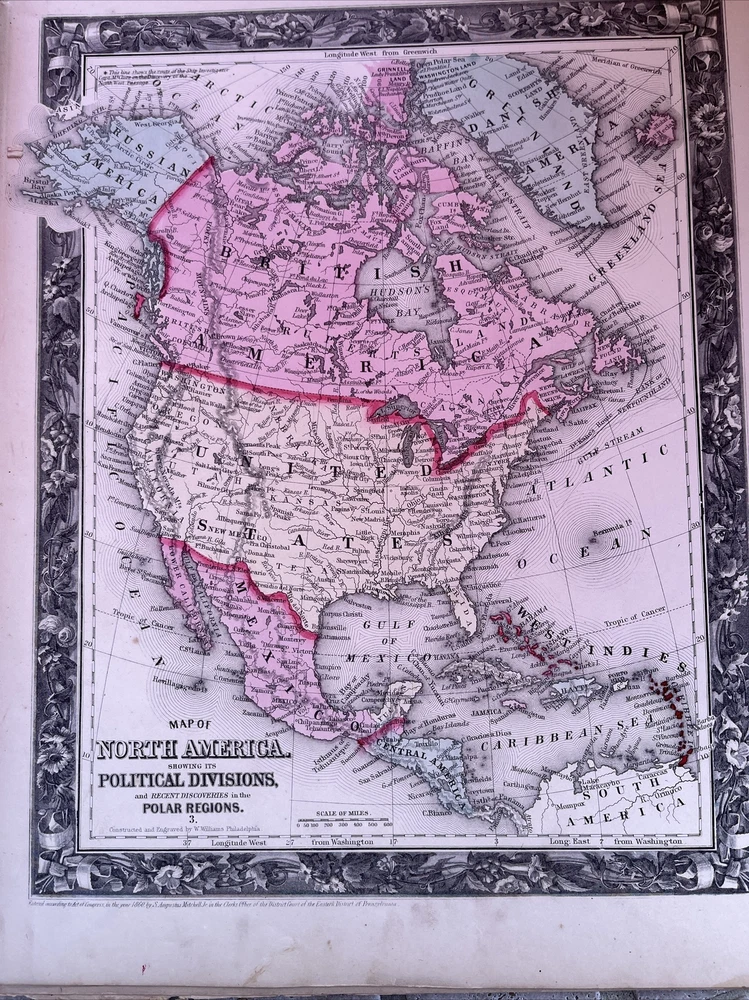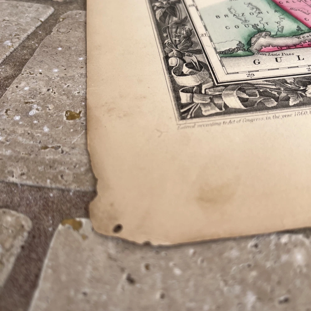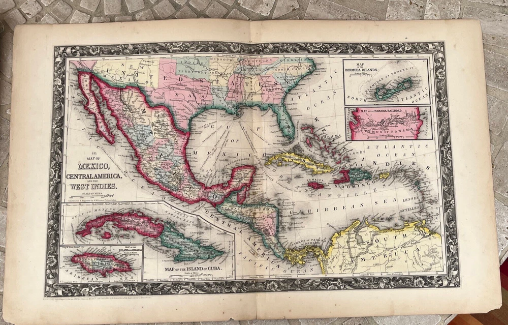 Hand-Coloring Mitchell's New General Atlas S. Augustus Mitchell, Jr. 1860 Fantastic book with amazing maps. Is rough and all pages are detached, but the maps themselves are in great condition except for the edges. Would make a great collection for someones wall art. Size 13" x 16" x 1" Incomplete Atlas Map Numbers are: 3,4,5,6,7,8,11,12,18,19,20,22,23,24,28,29,30,32,33,34,36,40,41,42,43,44,45,46,47,48,49, 50,51,52,53,54,55,56,57,58,62,63,64,65,66,67,68,69,70,71,72,73,74, Some maps are small and are on same pages as bigger maps Also has 22 pages of US post office A to Z
