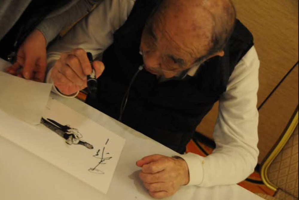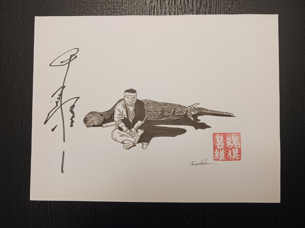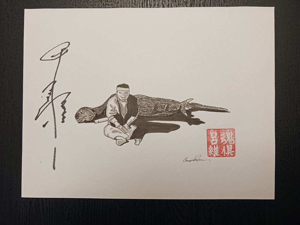Haruo Nakajima Godzilla himself signed this beautiful hand drawn art by artist Congroy * Rare One of One * On acid free 8" 3/8 x 10" 7/8 loft paper, sketch of Haruo Nakajima taking a cigarette break during filming with godzilla suit behind him. Comes with a photo of Haruo Nakajima signing this art piece. Thank you for looking:)