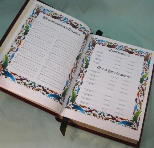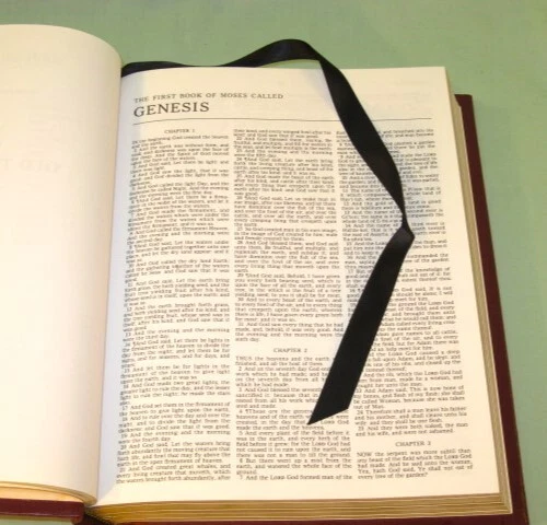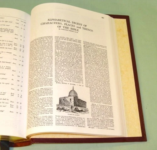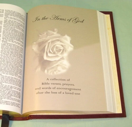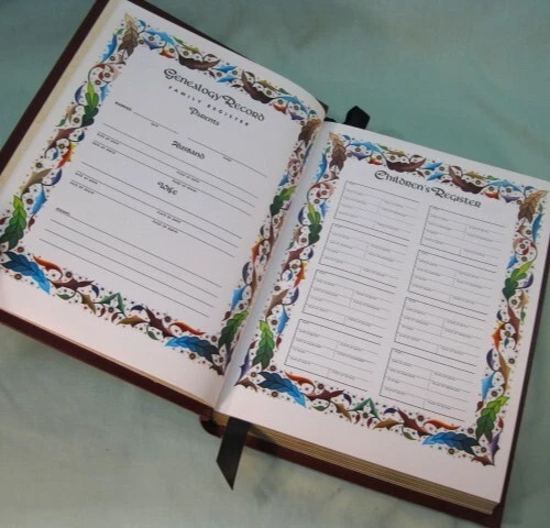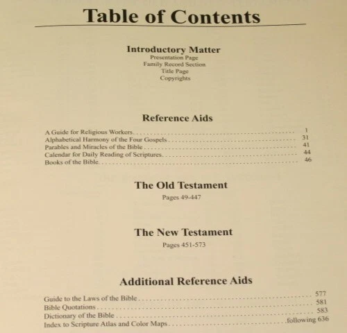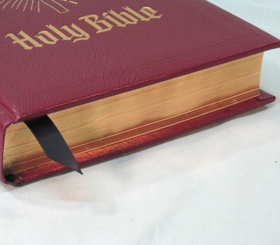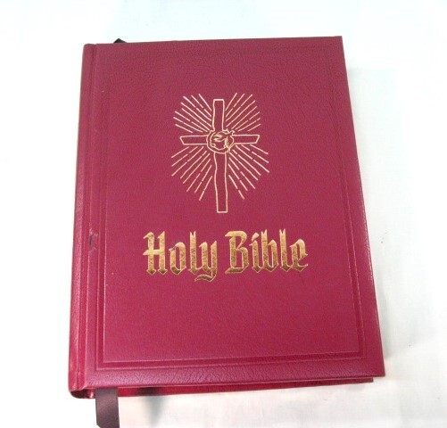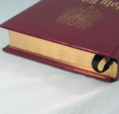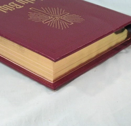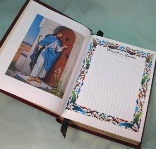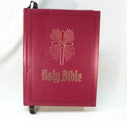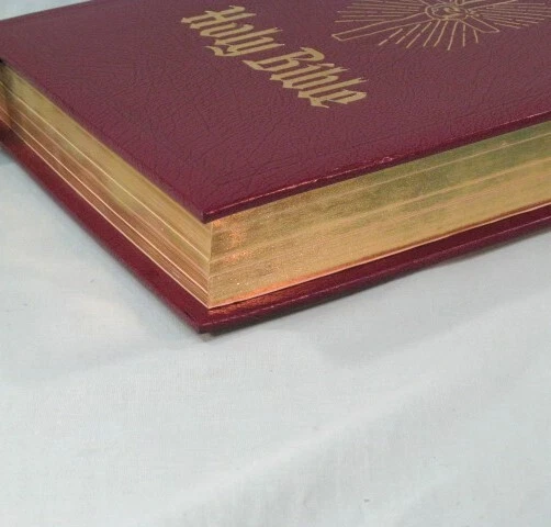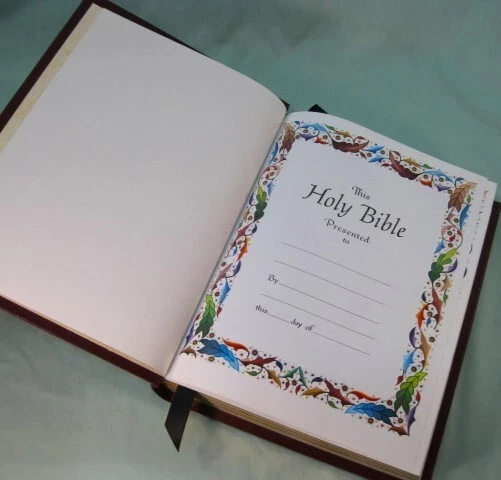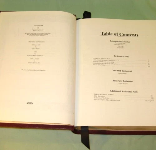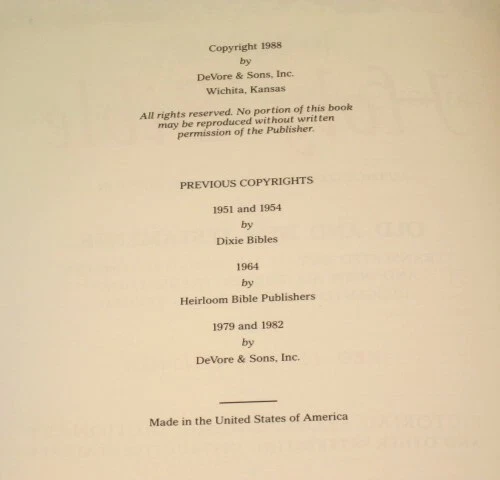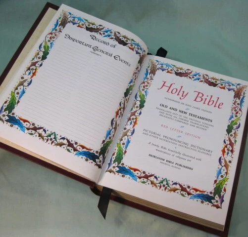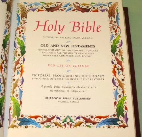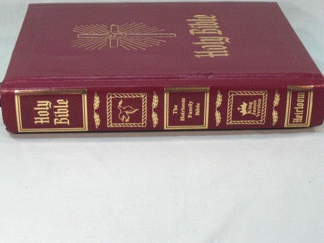 Thank you for shopping Offered for sale is this Heirloom Family Bible Heirloom Family Bible by DeVore & Sons of Wichita, Kansas (c)1988 From the copyright page, DeVore & Sons has been publishing Bibles since at least the 1950's Features a beautiful mahogany red faux leather cover with gold-gilded title, gold-gilded page edges, sharp-looking ribbon bookmark King James Version with both Old and New Testaments plus additional materials Red-letter edition - The words of Jesus are printed in red Large size, measures 12" x 9" x 3" Text is medium sized font, larger than most smaller Bibles but not technically "large print." If you wear reading glasses you'll likely need them for this Bible. In the front of this Bible are personalization pages for the owner to add family notes. Included are a genealogy record, registers for children, grandchildren and so on all the way up to great great grandparents. There's also an important events page to note things like family members serving in the military, first home purchases or whatever you like. Reference aids include a guide for religious workers, alphabetical harmony of the four Gospels, parable and miracles of the Bible, a calendar for daily reading, a guide to the laws of the Bible, Bible quotations, a Biblical Dictionary, and an index to the Scriptures plus color maps. Nice sections with Biblical quotations for family events such as weddings and funerals. Overall a very complete Bible Disclosure: On the cover is a small ding about 1/2" long that looks as if something scraped it (please refer to photos). This flaw is noticeable but not glaring and does not go through the cover, just appears as damage to the outer cover. No other damage. All pages intact, no tears or creases, no writing. If not for the flaw I described I'd be listing this as "like new." Overall, this Bible is in wonderful condition and would make a great gift for a loved one, or just to have to start making notes about the family.
