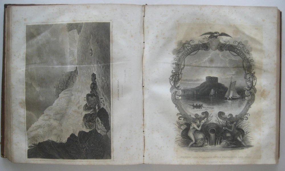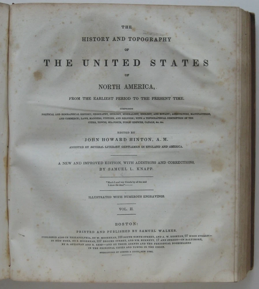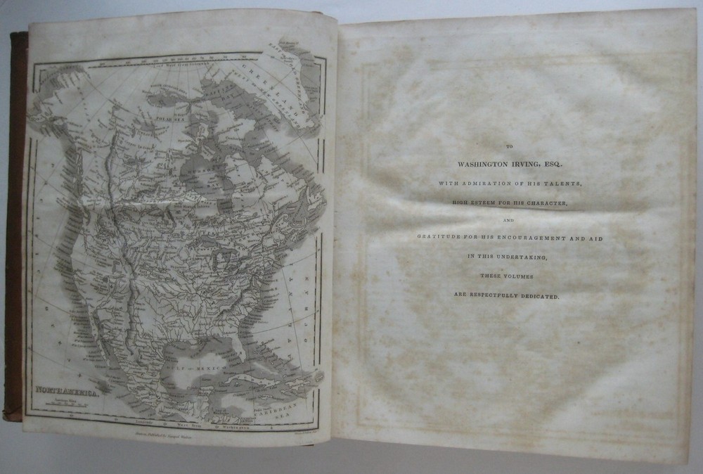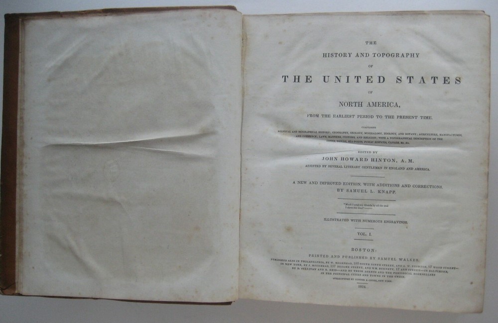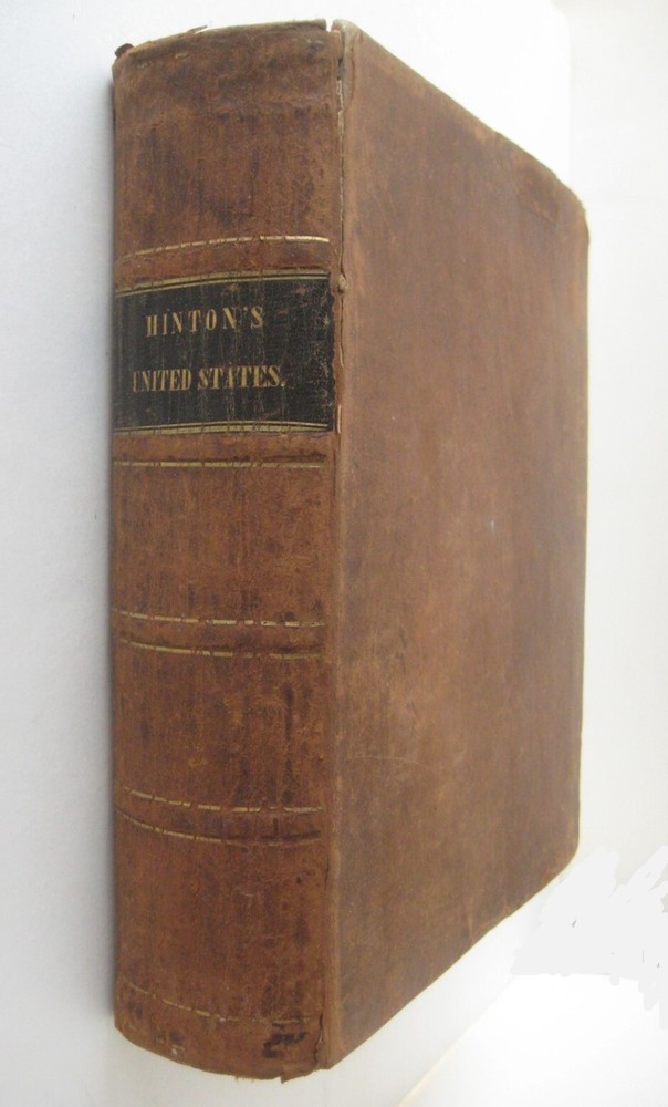 Original, leatherbound 1834 first U.S. edition of The History & Topography of the United States of North America, From the Earliest Period to the Present Time , by John Howard Hinton. Two volumes bound as one, in full leather with ribbed spine and gilt-embossed lettering. It measures 11" x 9¾" x 3" thick, with 936 pages (428 + 508), plus a map of North America and 35 full-page engraved plates depicting American cities, landmarks, and significant events, as well as an engraved frontispiece and title page in each volume. The title pages were drawn by William Croome, and each is inscribed "...Sold by Periodical Booksellers." The book was published in Boston by Samuel Walker, with additions and corrections by Samuel Lorenzo Knapp. The map locates cities, towns, forts, trading posts, and Indians, as well as rivers and lake. Lake Trimpanogos is labeled "doubtful." The southwestern U.S. is part of Mexico, and present-day Alaska is labeled Russian Territory. The engravings are by various artists and engravers, and include a wide range of views, including "Capitol of Richmond, Virginia," where Hinton was pastor of the First Baptist Church until his views on slavery made him unpopular, and he moved to Chicago. Among the other engravings are Thomas Cole's "Lake George," Alexander Jackson Davis' "Harvard University," and John Trumbull's "Battle at Bunker's Hill." (The full list of engravings is in "Directions for the Binder," on the last page of the book, shown in the scans.) Condition: The book is in very good condition, complete and intact. The cover boards show some wear, the corners are bumped, and there's a short break on the upper edge of the spine. There's scattered foxing on many of the inside pages and a pronounced horizontal crease or dent across the center. A previous owner's name is written on the first title page: "E.K. Browning." Please see the scans and feel free to ask any questions. This is an original , antiquarian book, published in 1834. It is fully guaranteed to be genuine and authentic in all respects. It is dedicated to Washington Irving, Esq. "with admiration of his talents, high esteem for his character, and gratitude for his encouragement and aid in this undertaking." Later works by John Howard Hinton include History of Baptism (1841) and Lectures on the Prophecies (1843). He died in New Orleans, during the yellow-fever epidemic of 1847. Buy with confidence! We are always happy to combine shipping on the purchase of multiple items — just make sure to pay for everything at one time, not individually. Powered by SixBit's eCommerce Solution