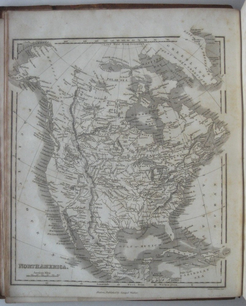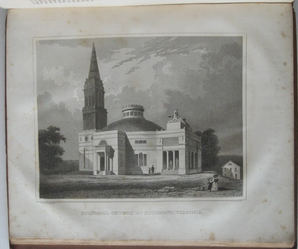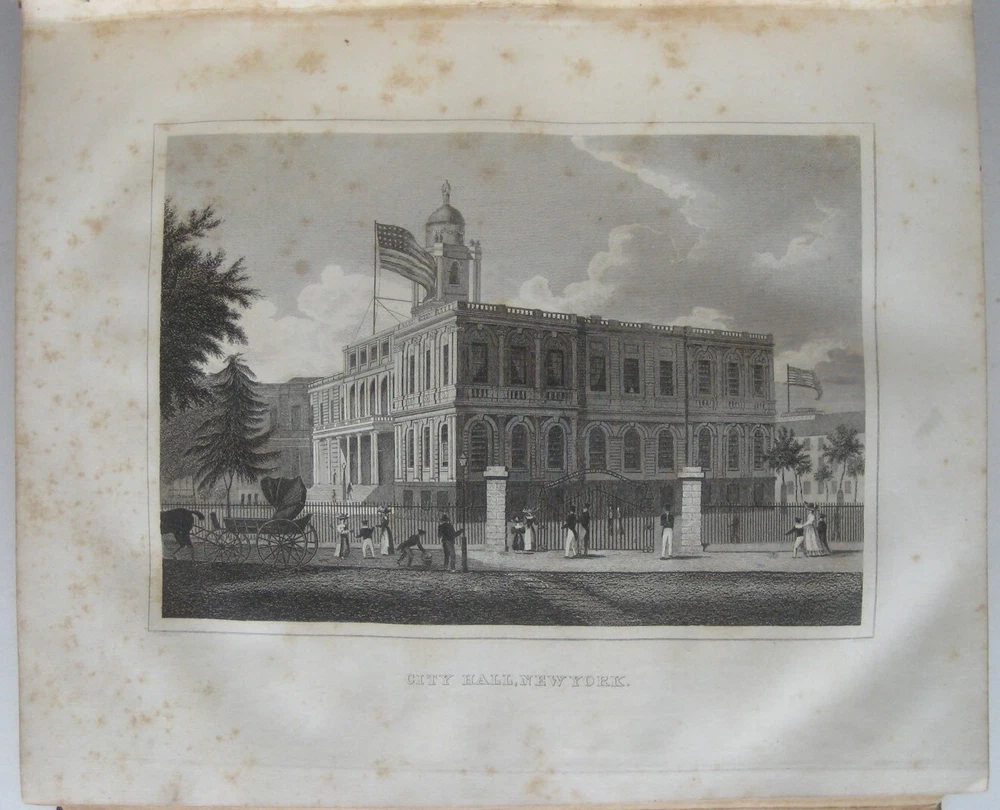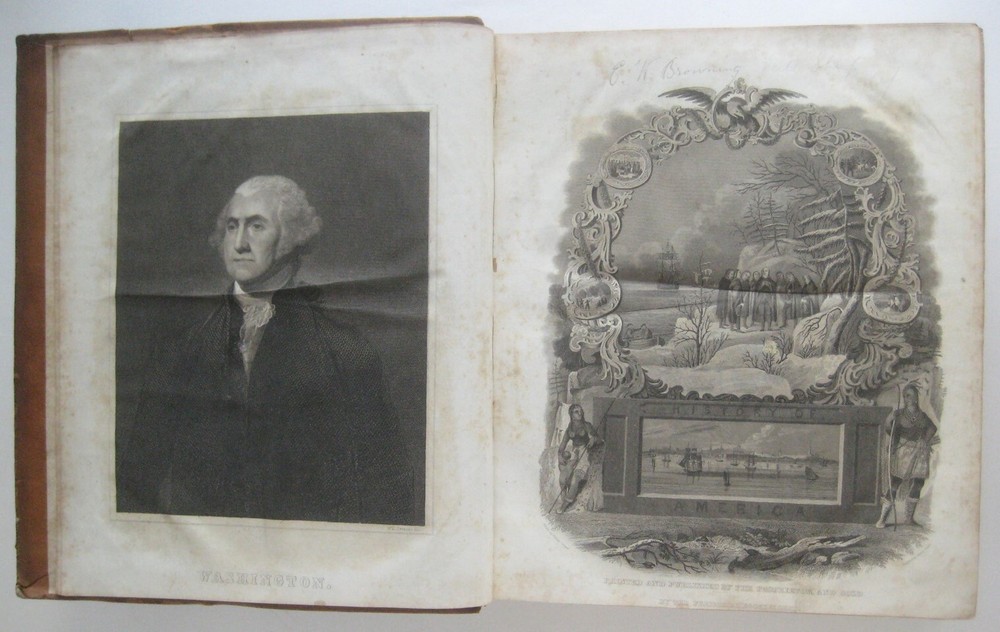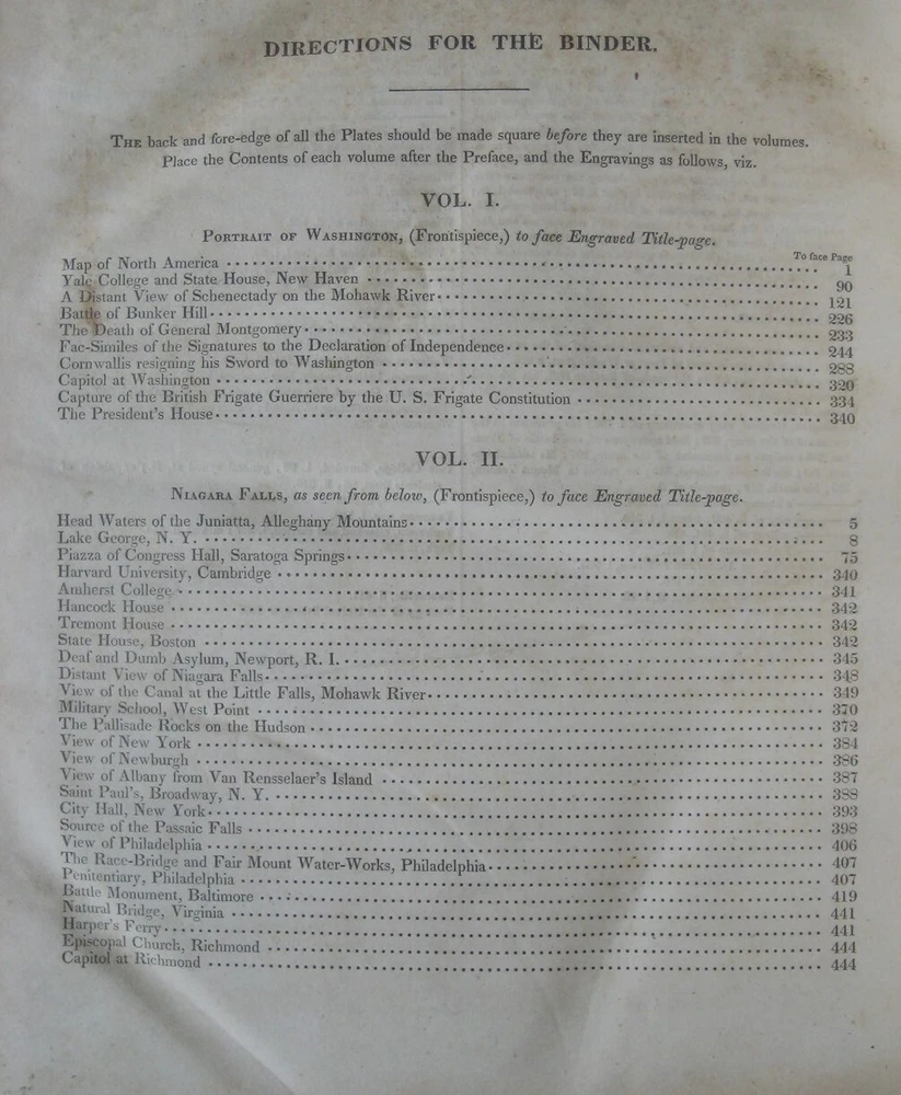 Original, leatherbound 1834 first U.S. edition of The History & Topography of the United States of North America, From the Earliest Period to the Present Time , by John Howard Hinton. Two volumes bound as one, in full leather with ribbed spine and gilt-embossed lettering. It measures 11" x 9¾" x 3" thick, with 936 pages (428 + 508), plus a map of North America and 35 full-page engraved plates depicting American cities, landmarks, and significant events, as well as an engraved frontispiece and title page in each volume. The title pages were drawn by William Croome, and each is inscribed "...Sold by Periodical Booksellers." The book was published in Boston by Samuel Walker, with additions and corrections by Samuel Lorenzo Knapp. The map locates cities, towns, forts, trading posts, and Indians, as well as rivers and lake. Lake Trimpanogos is labeled "doubtful." The southwestern U.S. is part of Mexico, and present-day Alaska is labeled Russian Territory. The engravings are by various artists and engravers, and include a wide range of views, including "Capitol of Richmond, Virginia," where Hinton was pastor of the First Baptist Church until his views on slavery made him unpopular, and he moved to Chicago. Among the other engravings are Thomas Cole's "Lake George," Alexander Jackson Davis' "Harvard University," and John Trumbull's "Battle at Bunker's Hill." (The full list of engravings is in "Directions for the Binder," on the last page of the book, shown in the scans.) Condition: The book is in very good condition, complete and intact. The cover boards show some wear, the corners are bumped, and there's a short break on the upper edge of the spine. There's scattered foxing on many of the inside pages and a pronounced horizontal crease or dent across the center. A previous owner's name is written on the first title page: "E.K. Browning." Please see the scans and feel free to ask any questions. This is an original , antiquarian book, published in 1834. It is fully guaranteed to be genuine and authentic in all respects. It is dedicated to Washington Irving, Esq. "with admiration of his talents, high esteem for his character, and gratitude for his encouragement and aid in this undertaking." Later works by John Howard Hinton include History of Baptism (1841) and Lectures on the Prophecies (1843). He died in New Orleans, during the yellow-fever epidemic of 1847. Buy with confidence! We are always happy to combine shipping on the purchase of multiple items — just make sure to pay for everything at one time, not individually. Powered by SixBit's eCommerce Solution