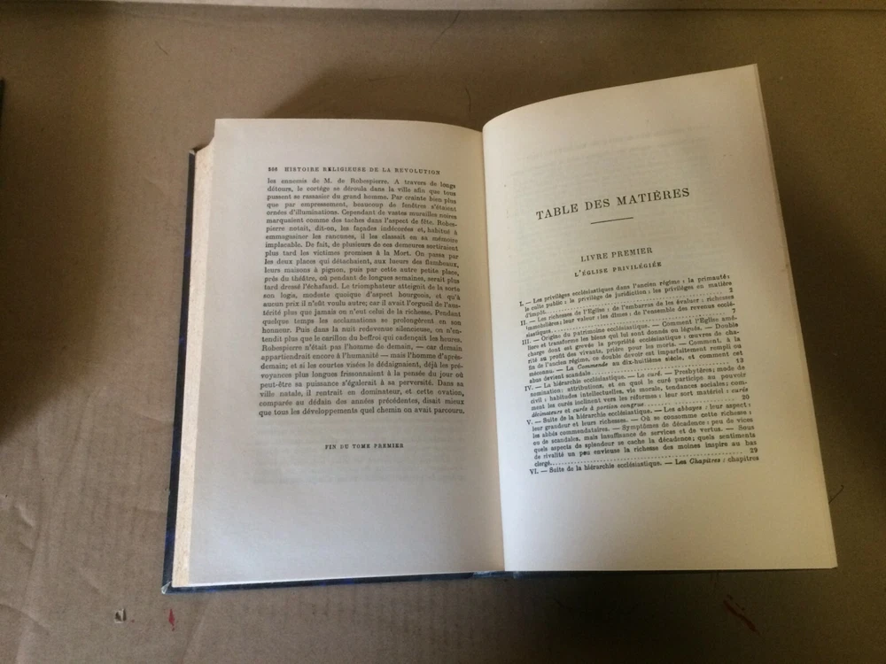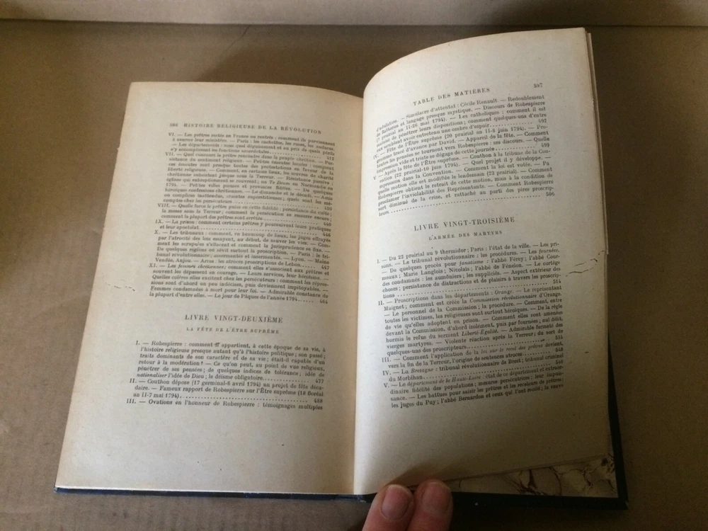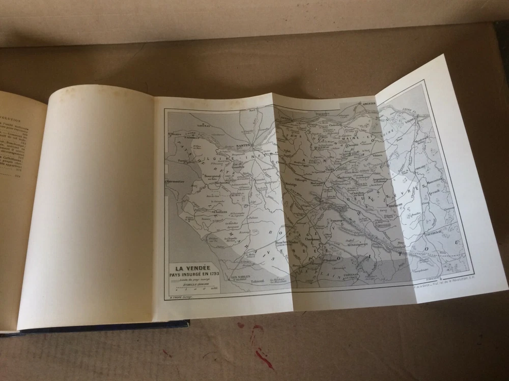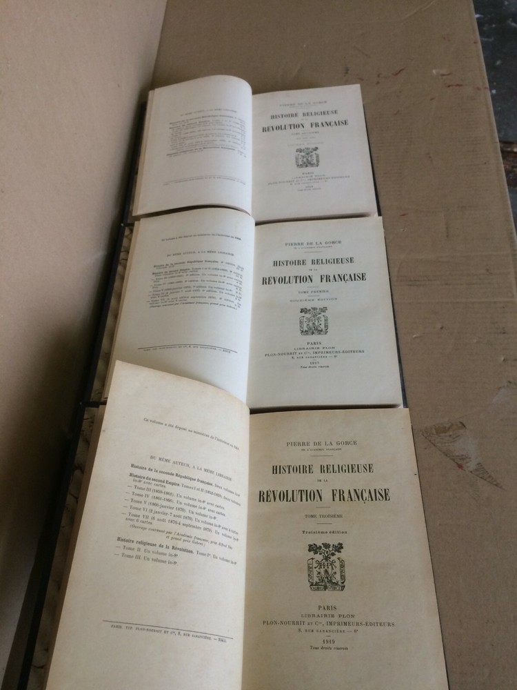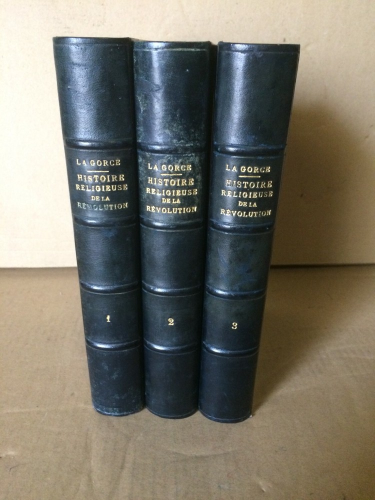 Religious History of the French Revolution By Pierre de La Gorce at Plon Nourrit 3 volumes bound in-8 (22 cm X 14.5 cm) leather spine with gilded author, title and volume number, marbled covers, Ex-Libris of Baron de Cougny on all volumes. - Volume I 1917 VI + 515 pages The Privileged Church The destruction of privileges Secularization The civil constitution of the clergy Pope, King, Sanction The two churches -Volume II 1912 538 pages and 1 fold-out map (The Vendée country insurgent in 1793) The first law of proscription The first royal veto The second law of proscription The second royal veto and the day of June 20 From internment to massacre The September Massacres From deportation to death laws The Vendee The Catholic and Royal Army - Volume III 1919 598 pages and 2 folding maps The Constitutional Clergy from Favor to Persecution The feast of reason Victories and defeats of the Catholic army The end of the Catholic and royal army Terror Apostates and confessors The Feast of the Supreme Being The Army of Martyrs Religious History of the French Revolution 3 volumes bound in-8 (22 cm X 14.5 cm) leather spine with gilded author, title and volume number, marbled covers, Ex-Libris of Baron de Cougny on all volumes. The destruction of privileges The civil constitution of the clergy -Volume II 1912 538 pages and 1 fold-out map (The Vendée country insurgent in 1793) The first law of proscription The second law of proscription The second royal veto and the day of June 20 From internment to massacre From deportation to death laws The Catholic and Royal Army - Volume III 1919 598 pages and 2 folding maps The Constitutional Clergy from Favor to Persecution Victories and defeats of the Catholic army The end of the Catholic and royal army The Feast