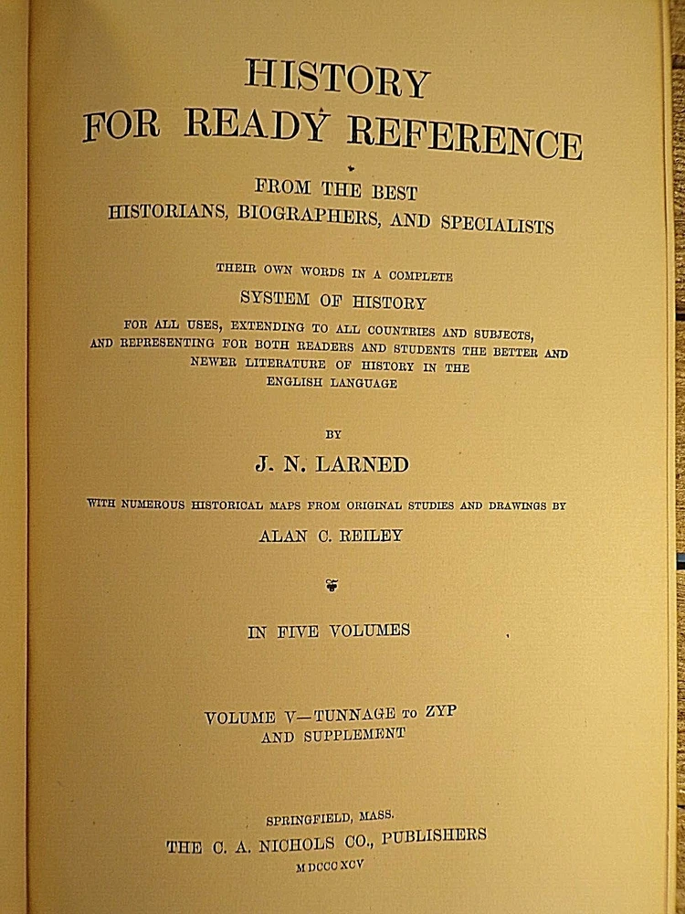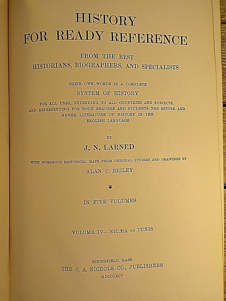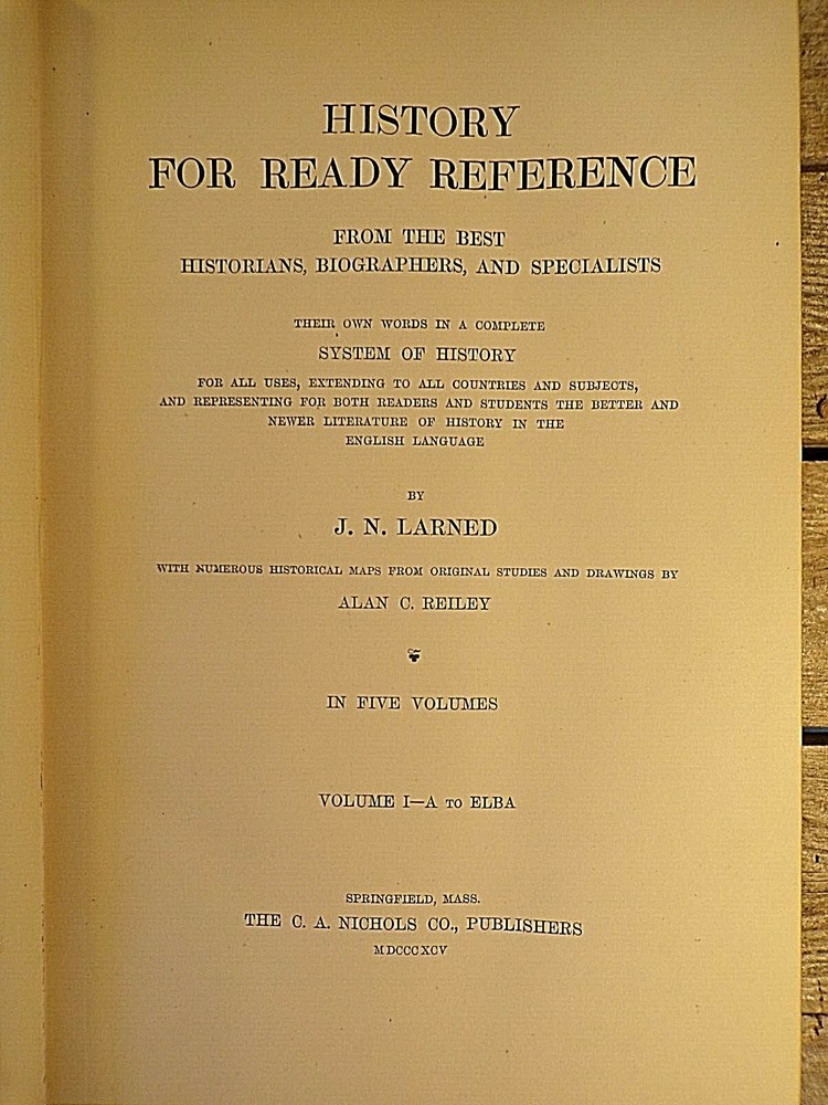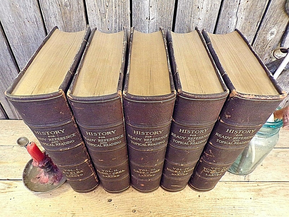 History for Ready Reference and Topical Reading Complete in Five Volumes by J.N Larned Published by C.A. Nichols Co (1895) - Hardcover, no Dustjacket, as issued 1st Edition, 1st Printing Volume I was published in 1893, Volumes II-IV were published in 1894, and the final volume was published in 1895. Half leather with pebbled cloth, with gold trim and gold titles one spine. Gold top, fore, and bottom page edges. Comes with questions pamphlet All five volumes are in very good condition, with wear and scuffing to the covers, especially to the corners, edges, and spine.