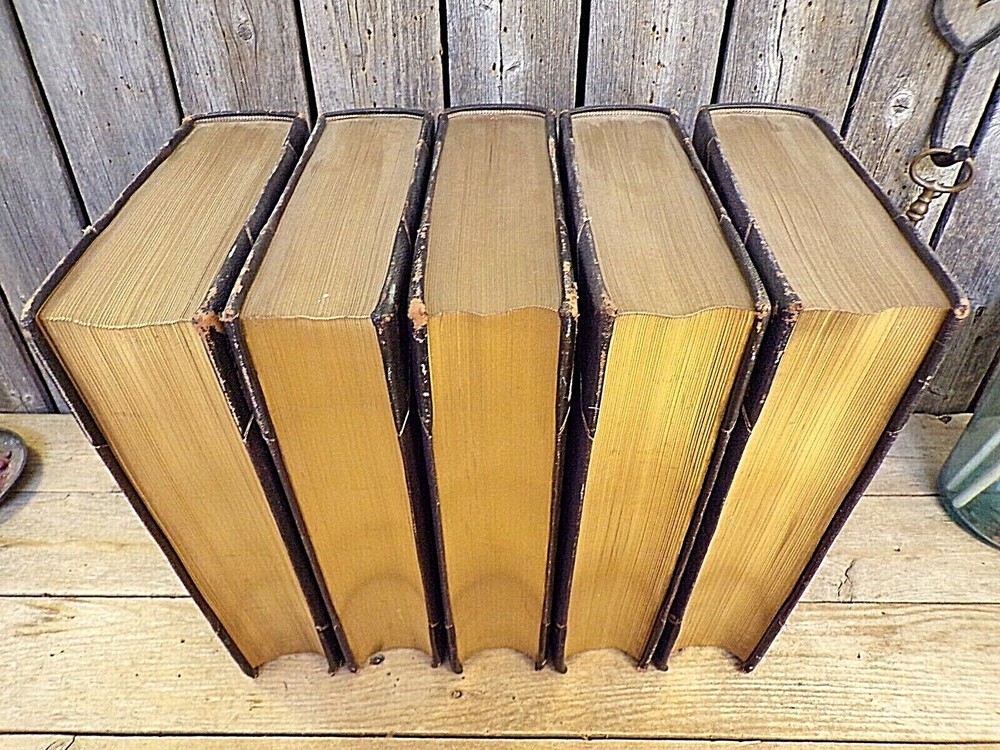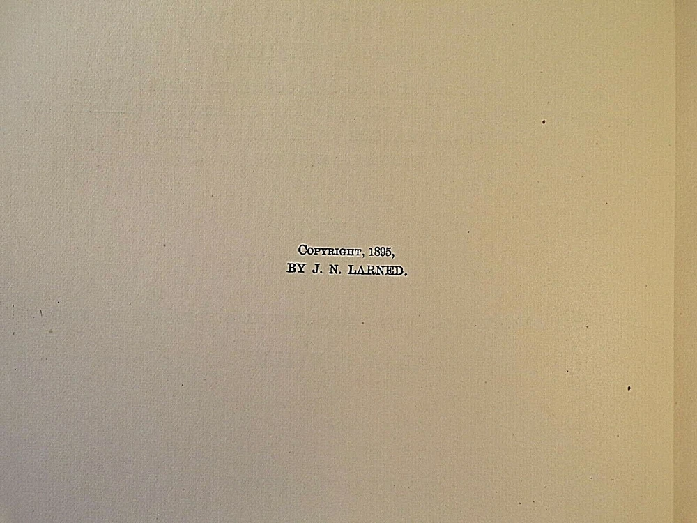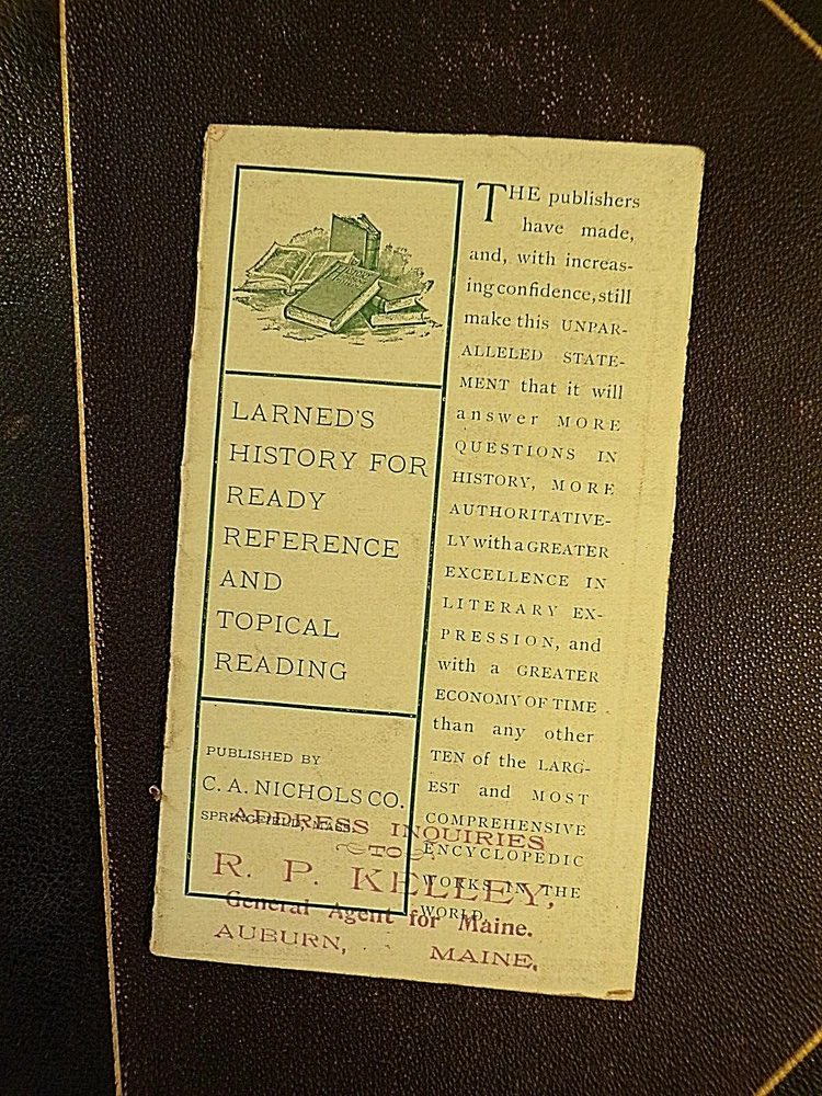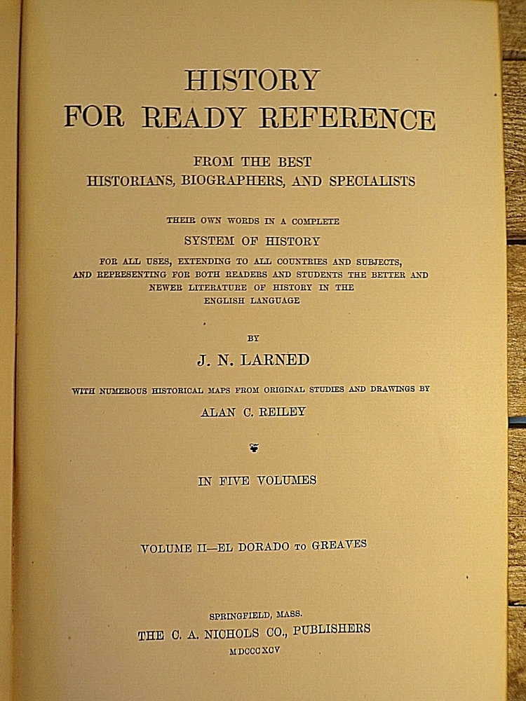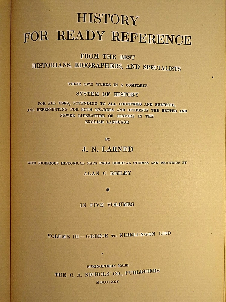 History for Ready Reference and Topical Reading Complete in Five Volumes by J.N Larned Published by C.A. Nichols Co (1895) - Hardcover, no Dustjacket, as issued 1st Edition, 1st Printing Volume I was published in 1893, Volumes II-IV were published in 1894, and the final volume was published in 1895. Half leather with pebbled cloth, with gold trim and gold titles one spine. Gold top, fore, and bottom page edges. Comes with questions pamphlet All five volumes are in very good condition, with wear and scuffing to the covers, especially to the corners, edges, and spine.