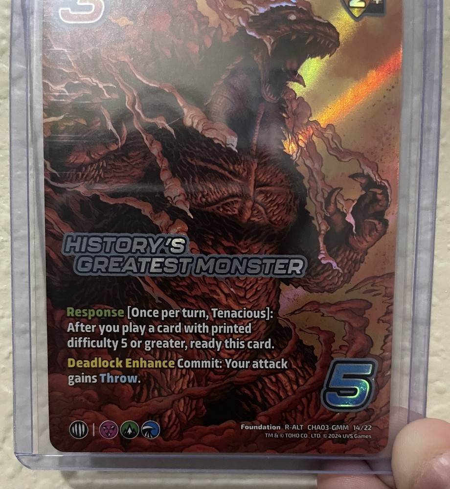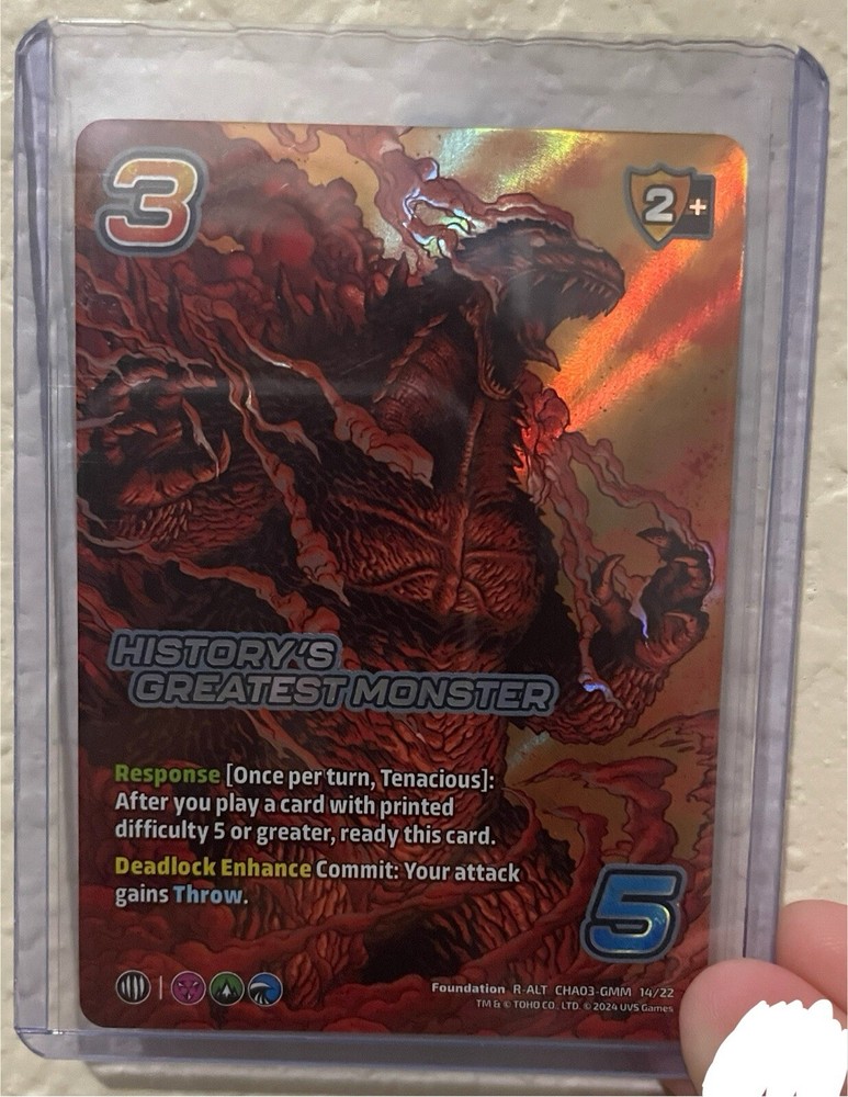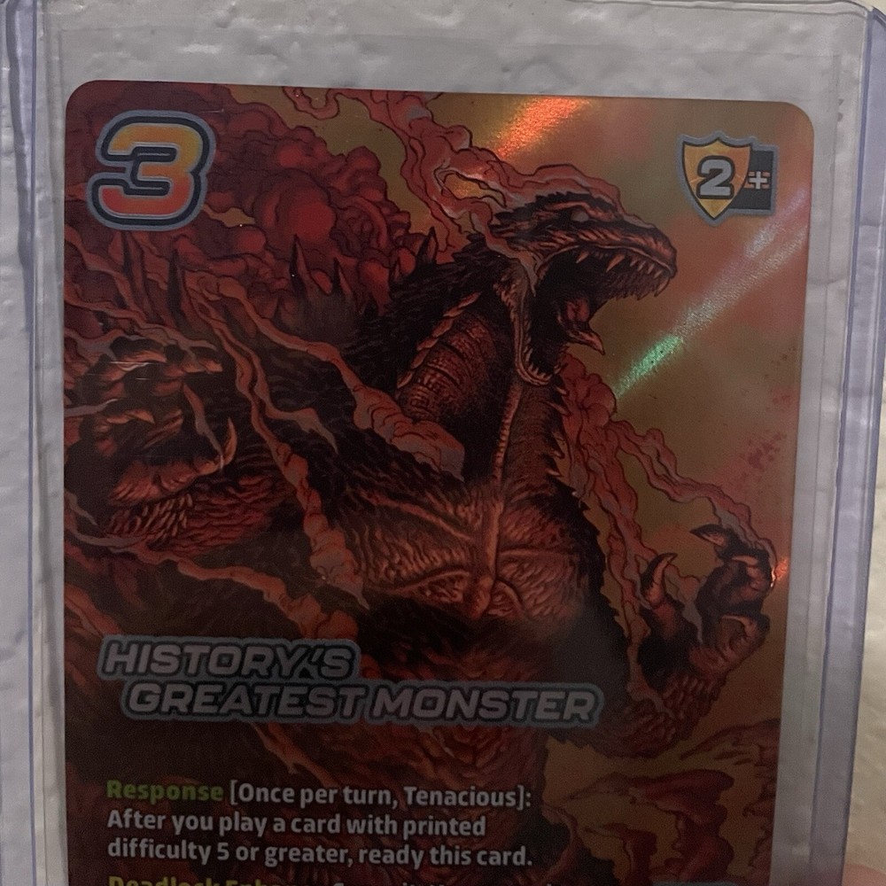 The product is a non-sport trading card featuring an alternate art design of Godzilla, known as "History's Greatest Monster". Part of the Challenger Series, this card showcases Godzilla, a famous monster in pop culture history. With a focus on the franchise of Godzilla, this collectible trading card appeals to fans of the iconic creature and highlights its historical significance within the entertainment world.