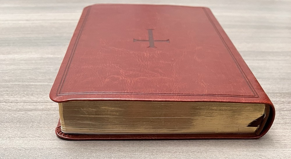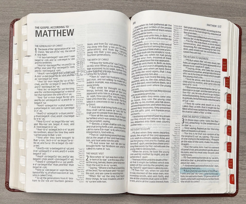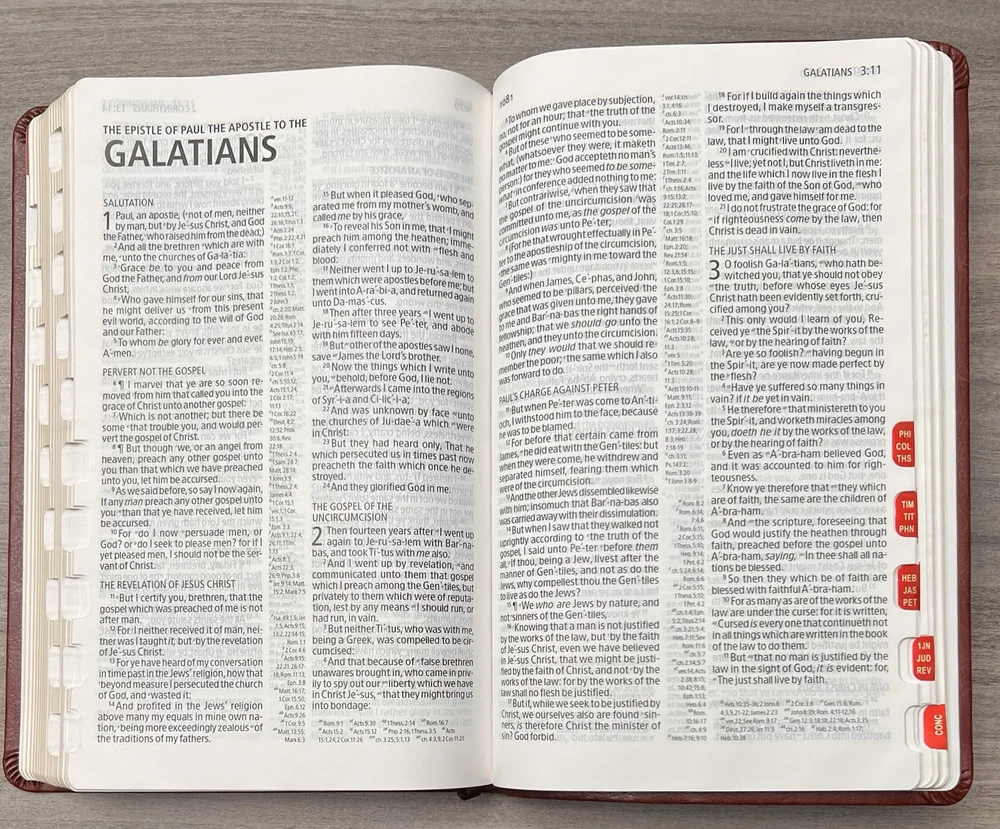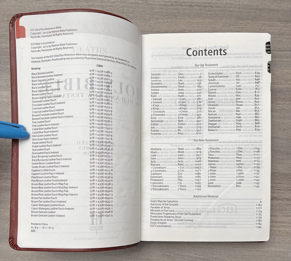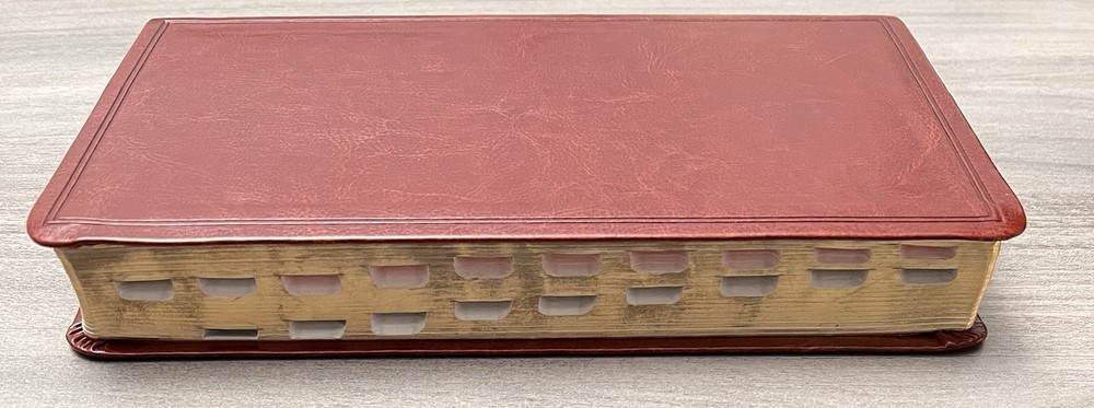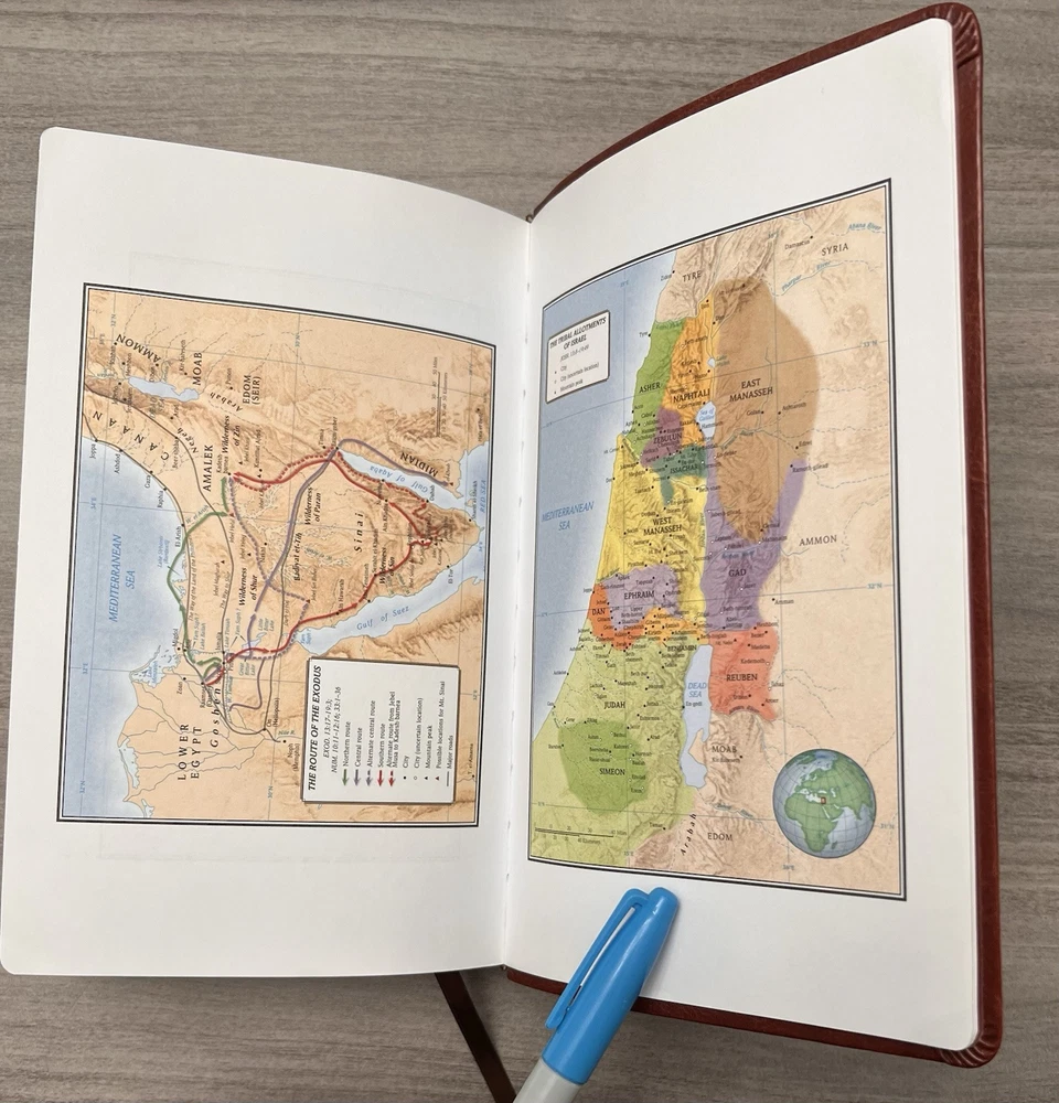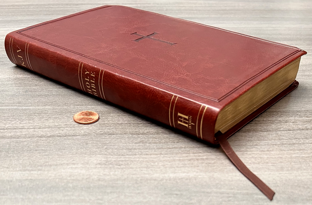 Holman KJV Ultrathin Reference Bible - Red Letter Brown LeatherTouch - Center Column References Thumb Tabs - Ribbon Marker - Concordance - Bible Helps - Color Maps Notes: I rated this Bible in acceptable condition. General aging, shelf and usage wear. Presentation page and family pages unfilled. A few locations with underlining/marks. Numerous chapters with neat, minimal, highlighting; exception is First Peter (see photos). No written comments. Extremely nice covers. Solid binding. Please view the photos for examples of content and condition. Thanks! Publisher: Holman Bible Publishers Copyright: 1998 Dimensions : ~8.40" x ~5.75"; width = ~1.38" Pages: Pre-Genesis pages + 1242 + 8 Color Maps Visit our Ebay Store for more books like this one. Our books are sold as-is. Please email any questions prior to purchasing. Thanks!