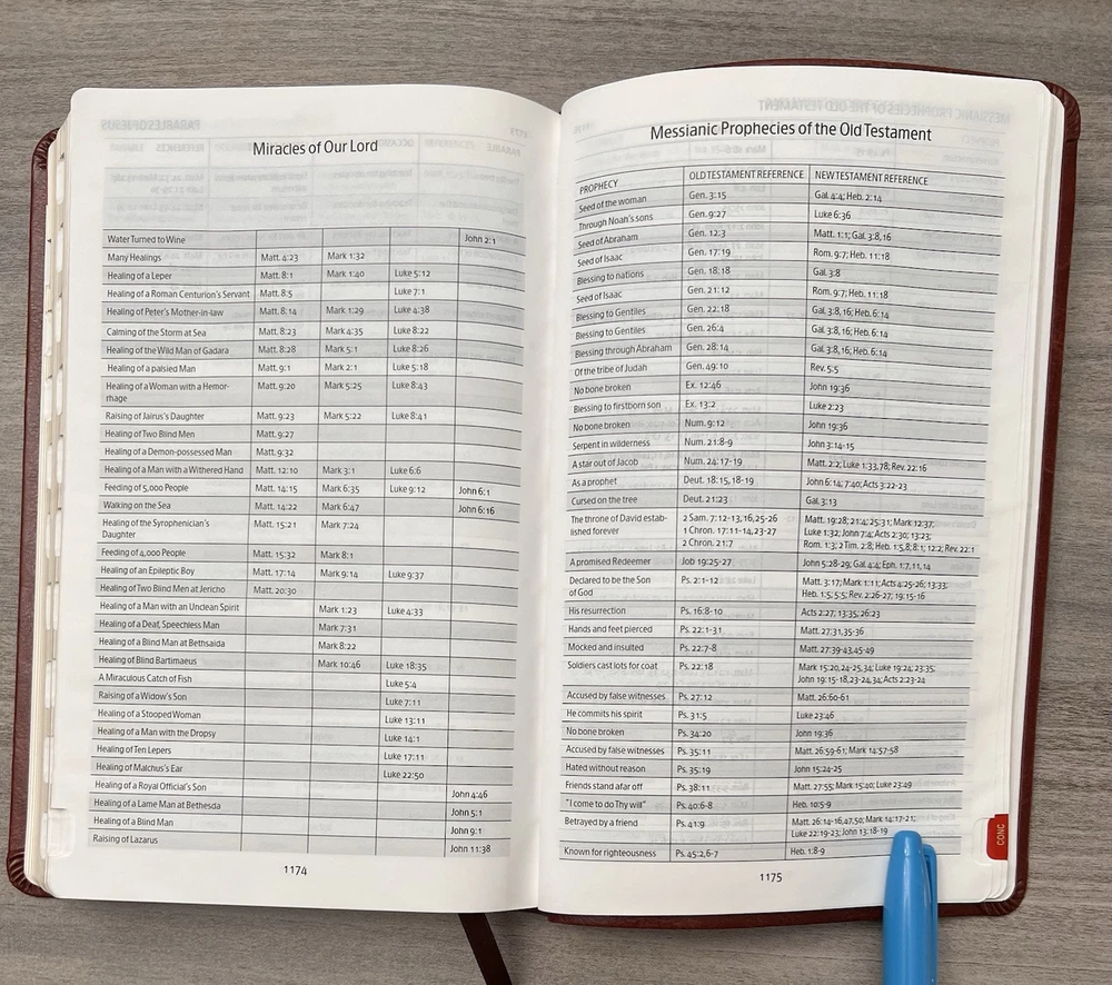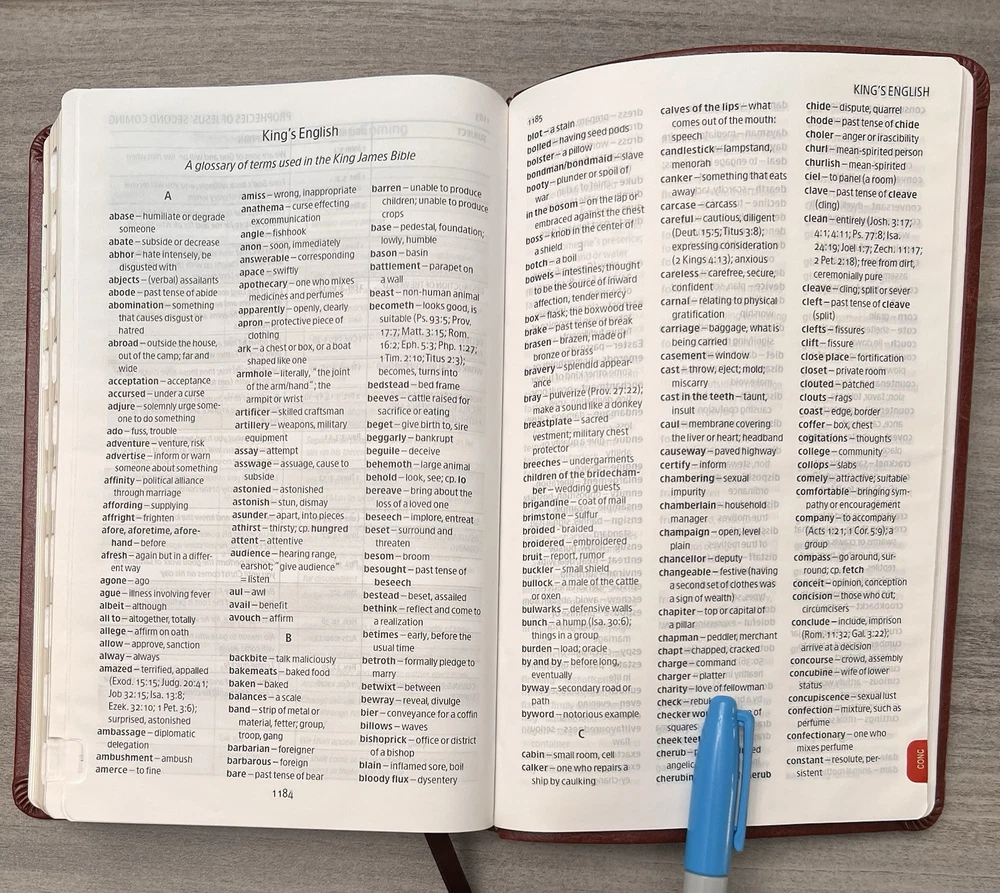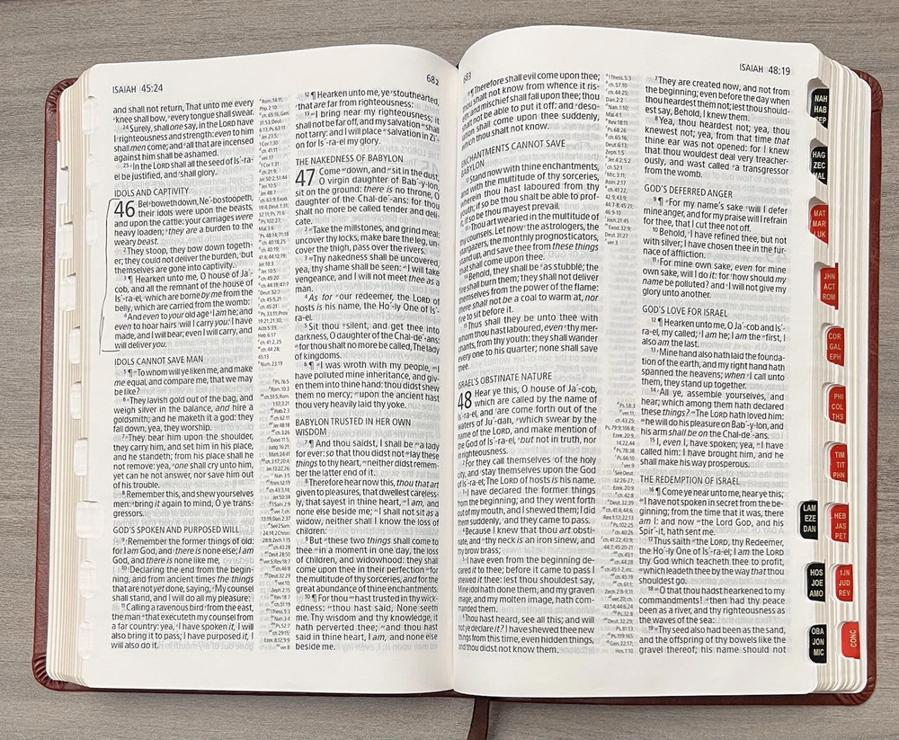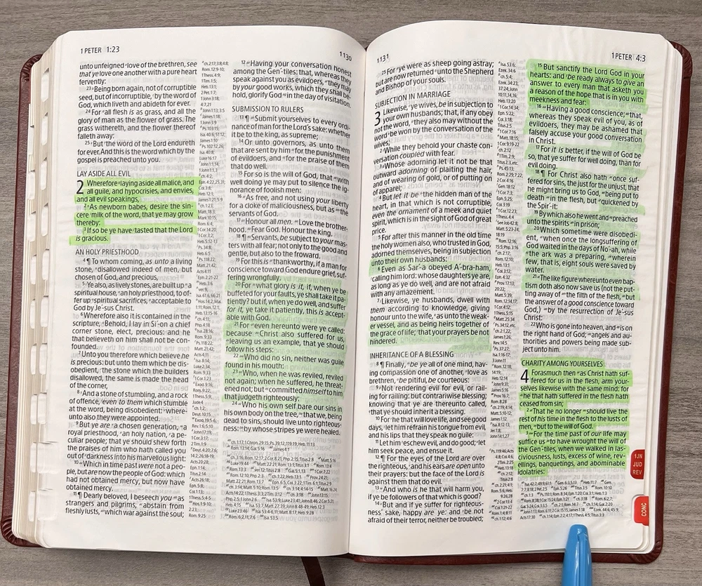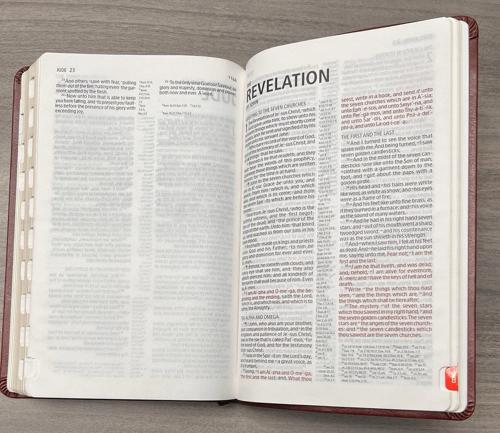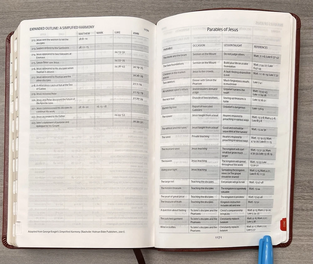 Holman KJV Ultrathin Reference Bible - Red Letter Brown LeatherTouch - Center Column References Thumb Tabs - Ribbon Marker - Concordance - Bible Helps - Color Maps Notes: I rated this Bible in acceptable condition. General aging, shelf and usage wear. Presentation page and family pages unfilled. A few locations with underlining/marks. Numerous chapters with neat, minimal, highlighting; exception is First Peter (see photos). No written comments. Extremely nice covers. Solid binding. Please view the photos for examples of content and condition. Thanks! Publisher: Holman Bible Publishers Copyright: 1998 Dimensions : ~8.40" x ~5.75"; width = ~1.38" Pages: Pre-Genesis pages + 1242 + 8 Color Maps Visit our Ebay Store for more books like this one. Our books are sold as-is. Please email any questions prior to purchasing. Thanks!