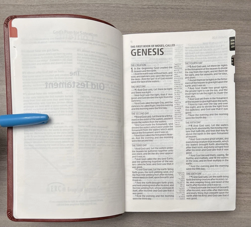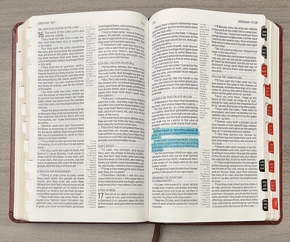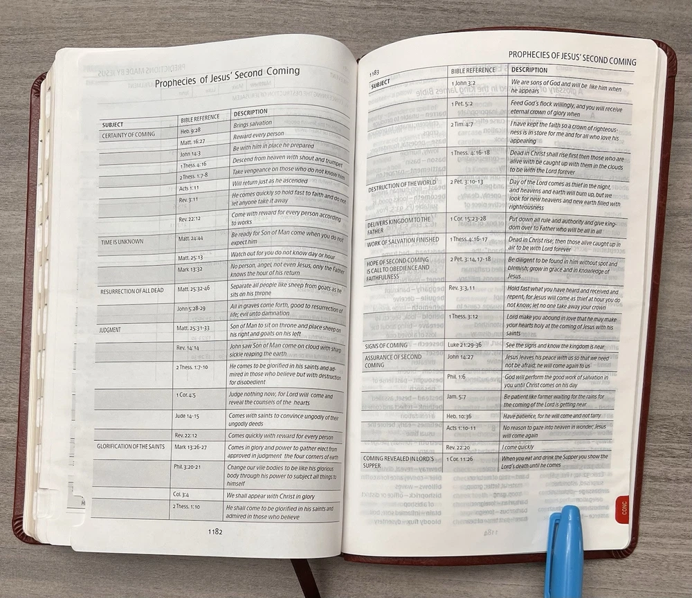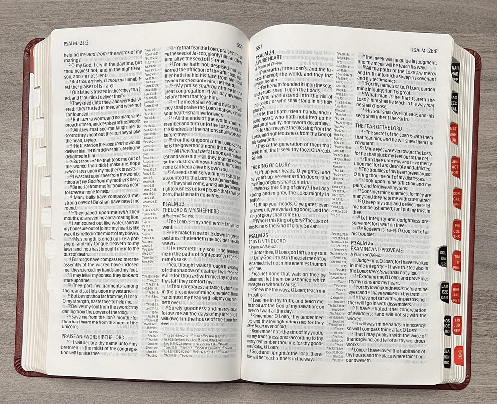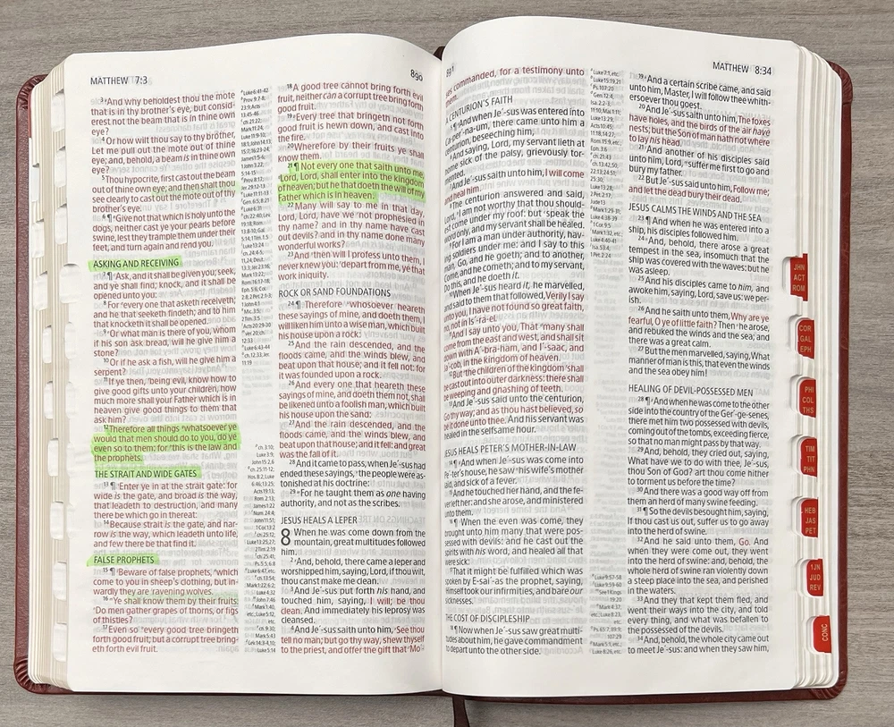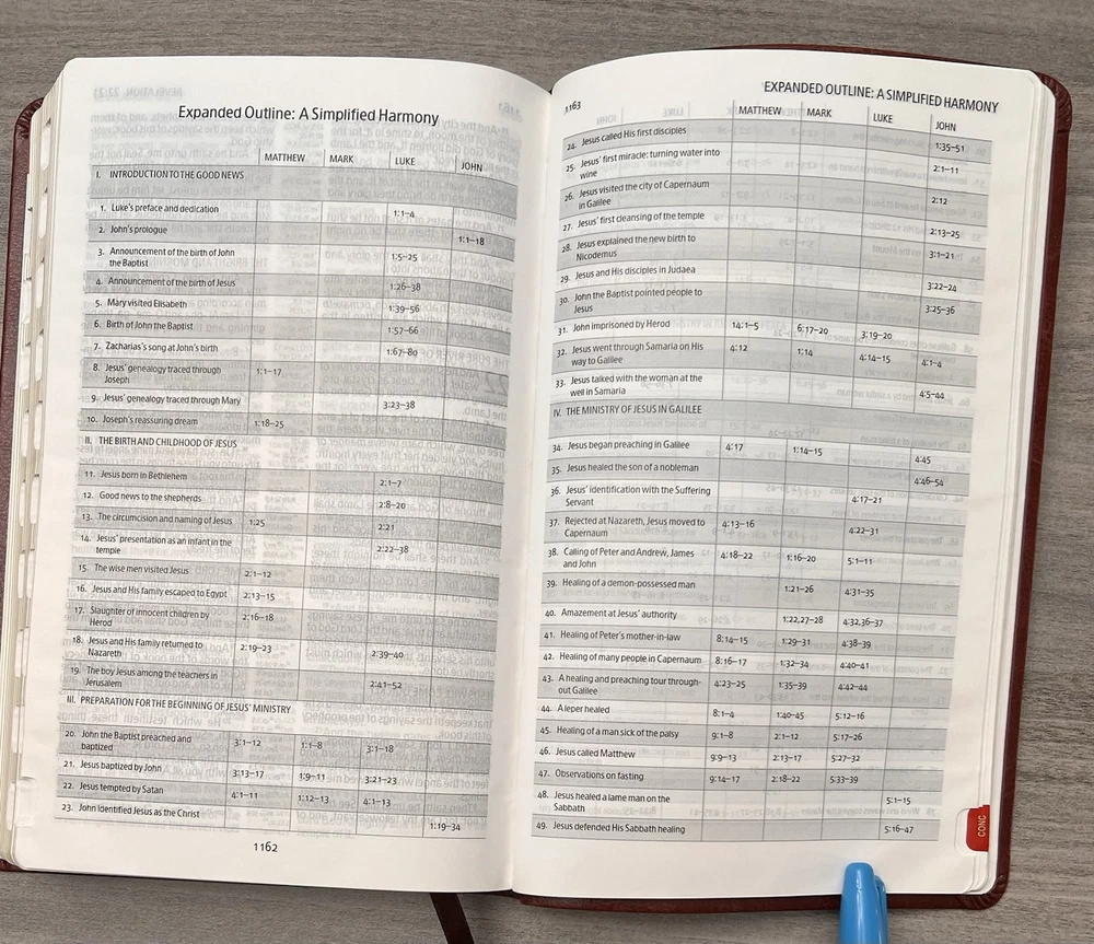 Holman KJV Ultrathin Reference Bible - Red Letter Brown LeatherTouch - Center Column References Thumb Tabs - Ribbon Marker - Concordance - Bible Helps - Color Maps Notes: I rated this Bible in acceptable condition. General aging, shelf and usage wear. Presentation page and family pages unfilled. A few locations with underlining/marks. Numerous chapters with neat, minimal, highlighting; exception is First Peter (see photos). No written comments. Extremely nice covers. Solid binding. Please view the photos for examples of content and condition. Thanks! Publisher: Holman Bible Publishers Copyright: 1998 Dimensions : ~8.40" x ~5.75"; width = ~1.38" Pages: Pre-Genesis pages + 1242 + 8 Color Maps Visit our Ebay Store for more books like this one. Our books are sold as-is. Please email any questions prior to purchasing. Thanks!