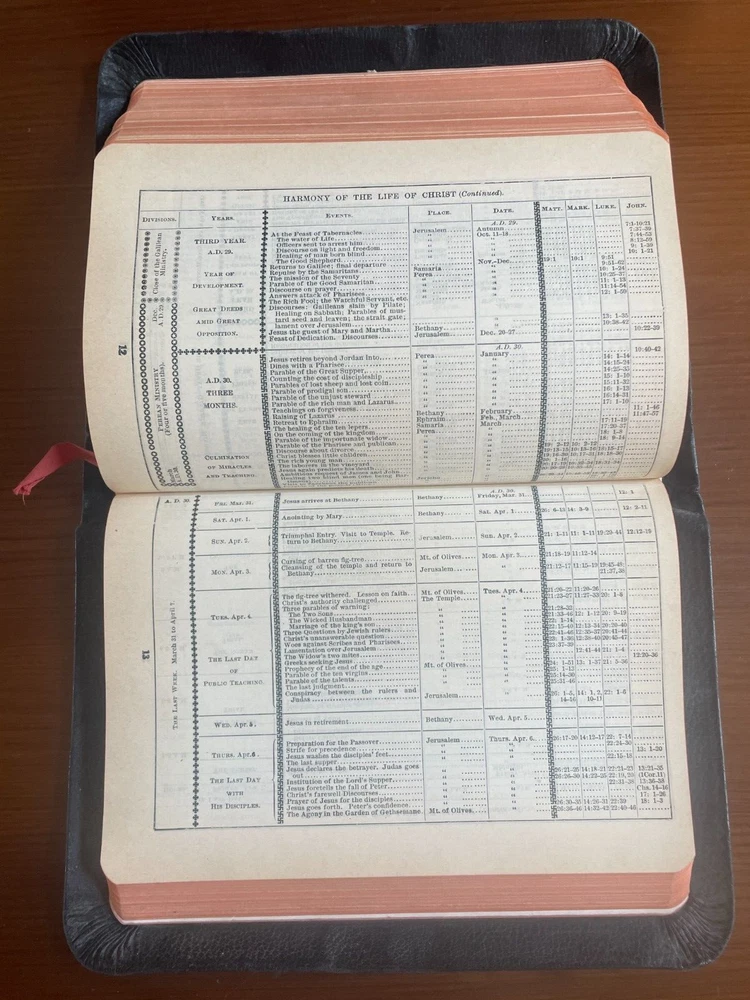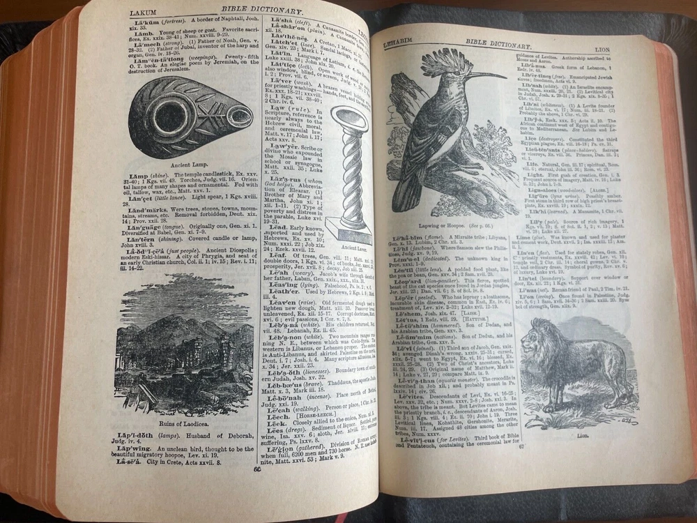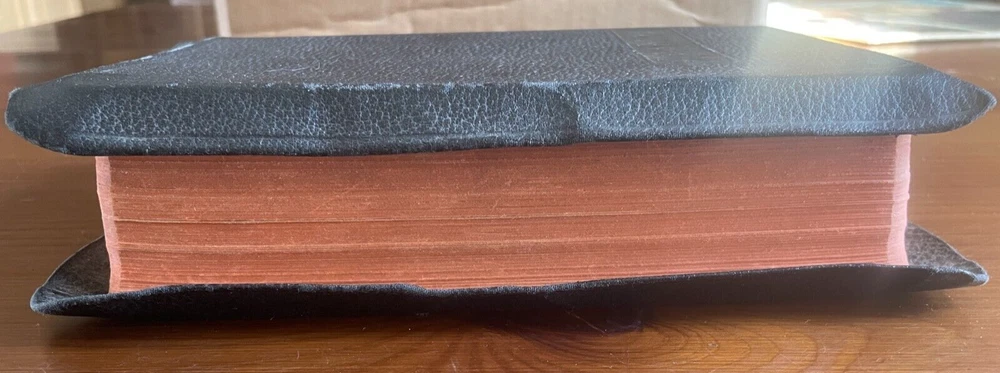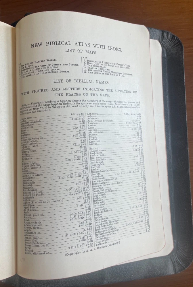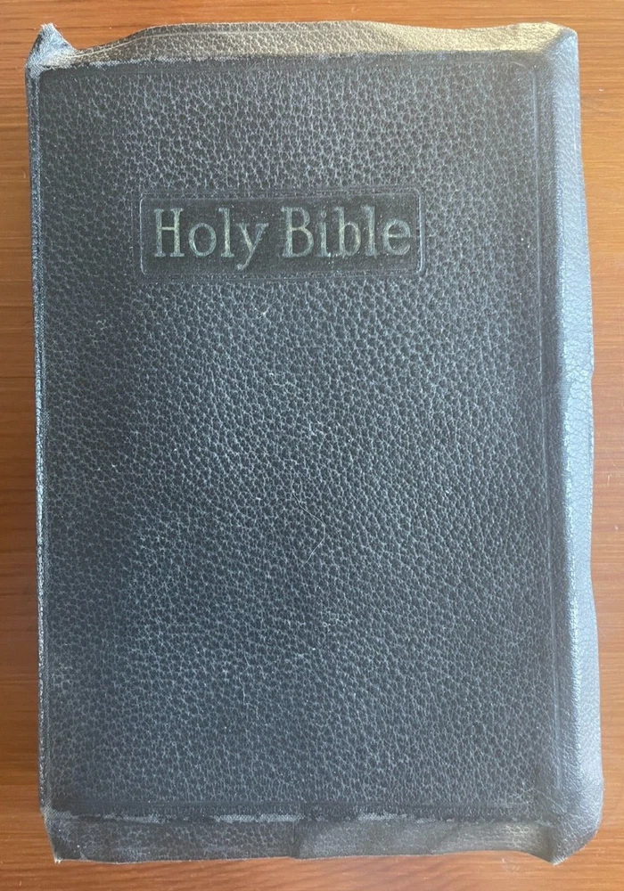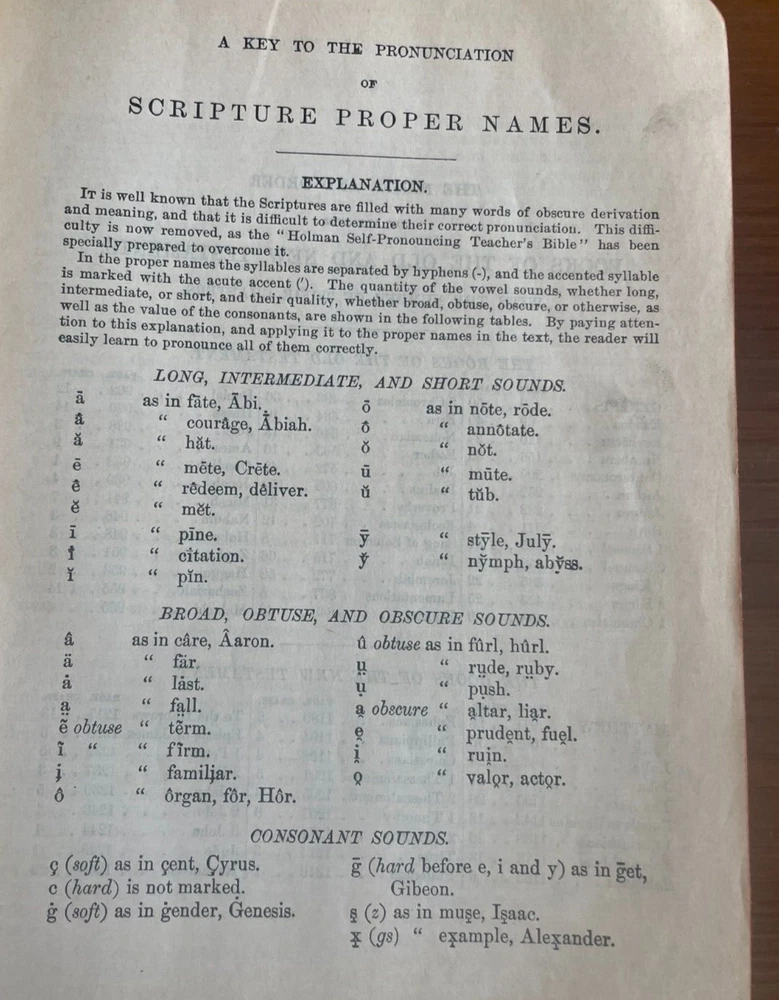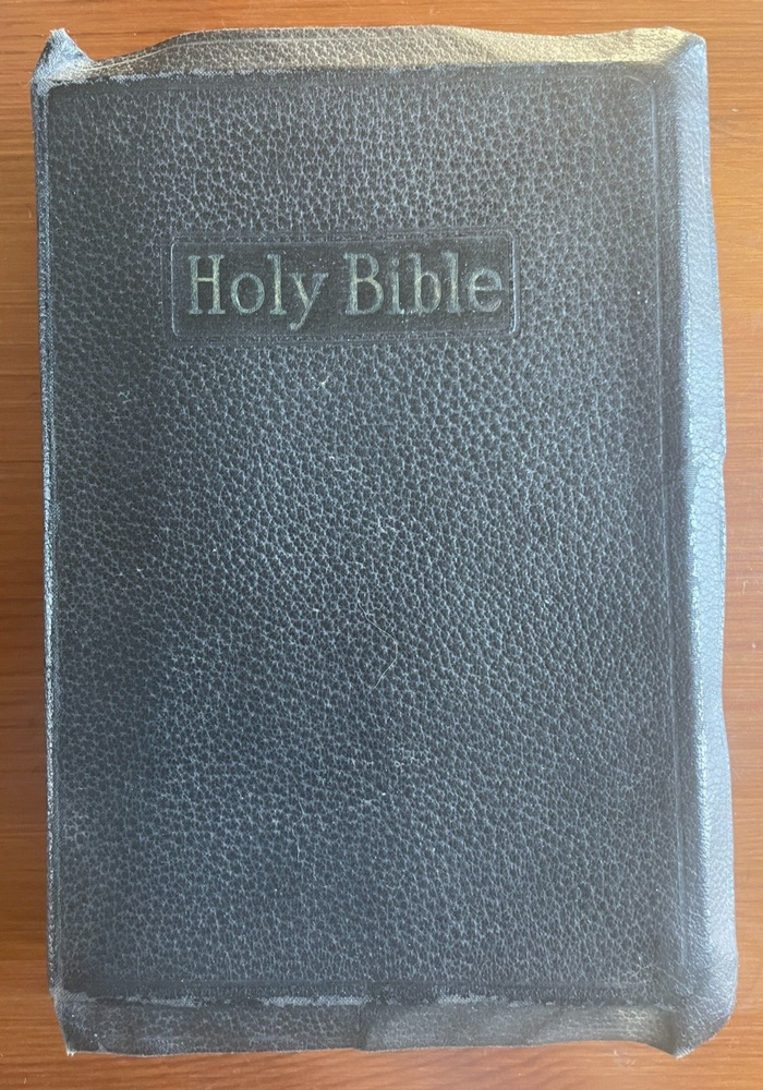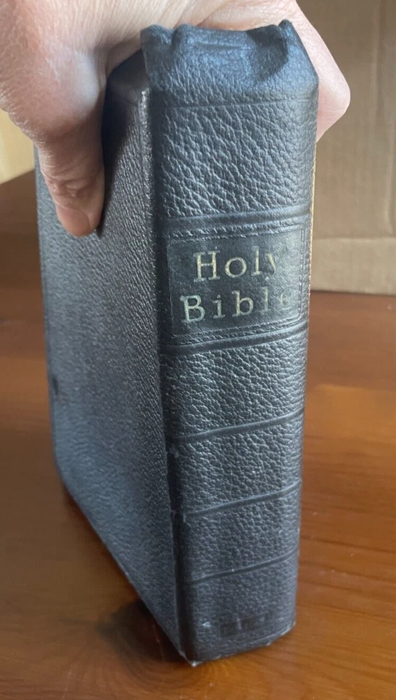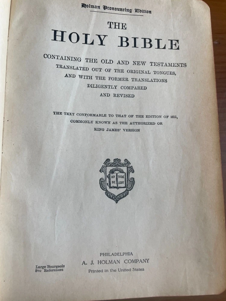 This antique King James version of the Holy Bible by Holman is in very good condition No writing or marks inside--no names, dedication, or underlining for example No year of publication is stated, but the Bible is very old It has an illustrated Bible dictionary and other academic helps included, including colored illustrated maps Red matte edges (see photos) Red cloth bookmark (wrinkled and twisted, see photos) Book stays open when sitting on flat surface MEASURES : 9.5 x 6.5 x 2 1/8 inches WEIGHS : 2 pounds, 10 ounces If you have questions, just ask