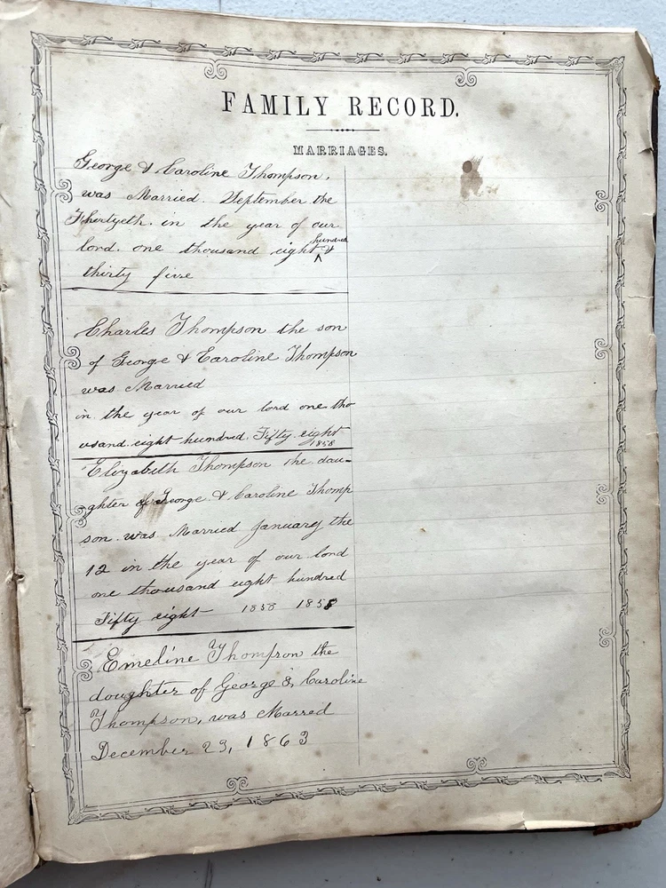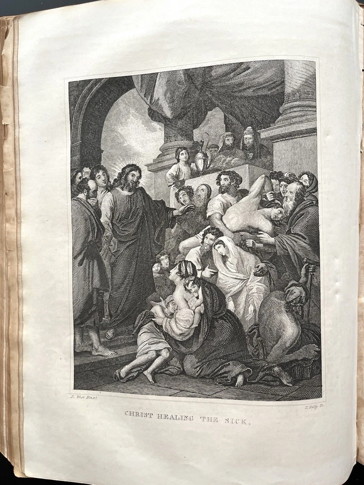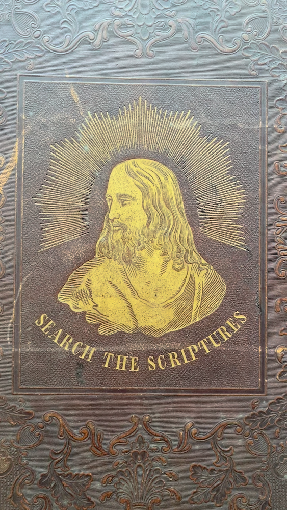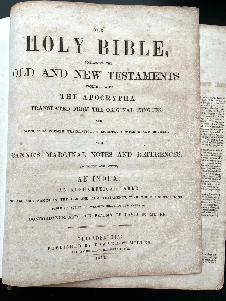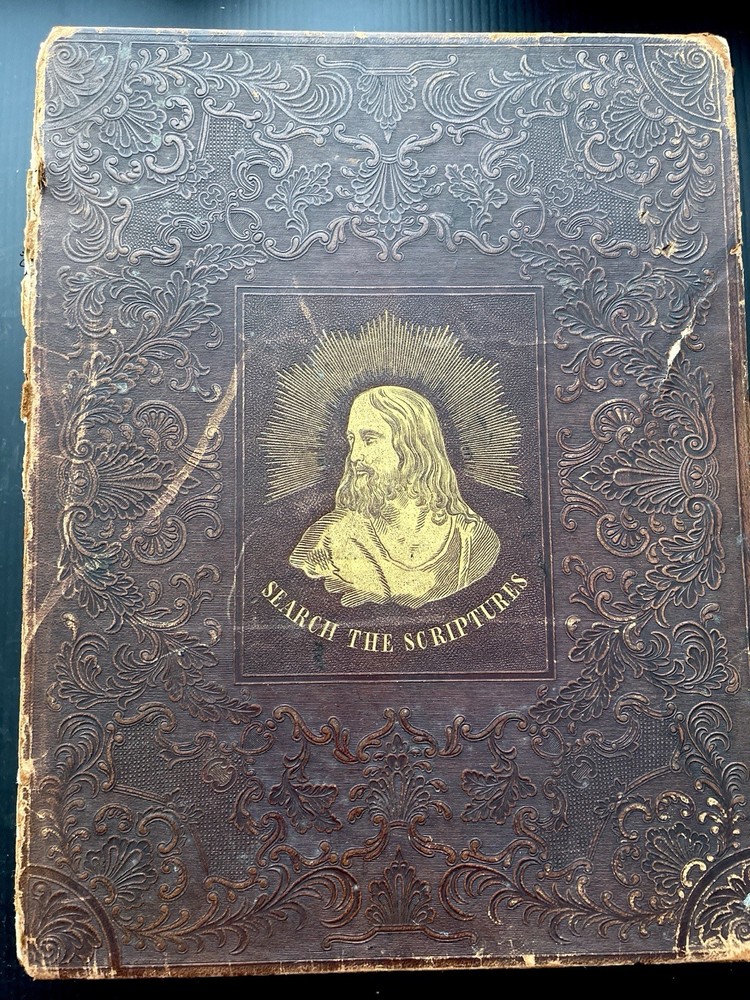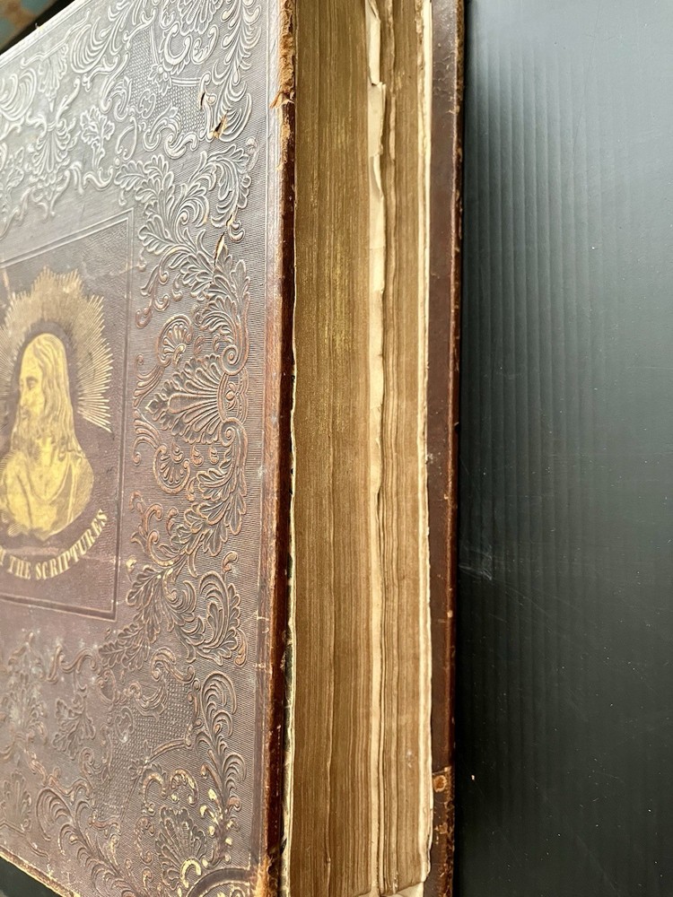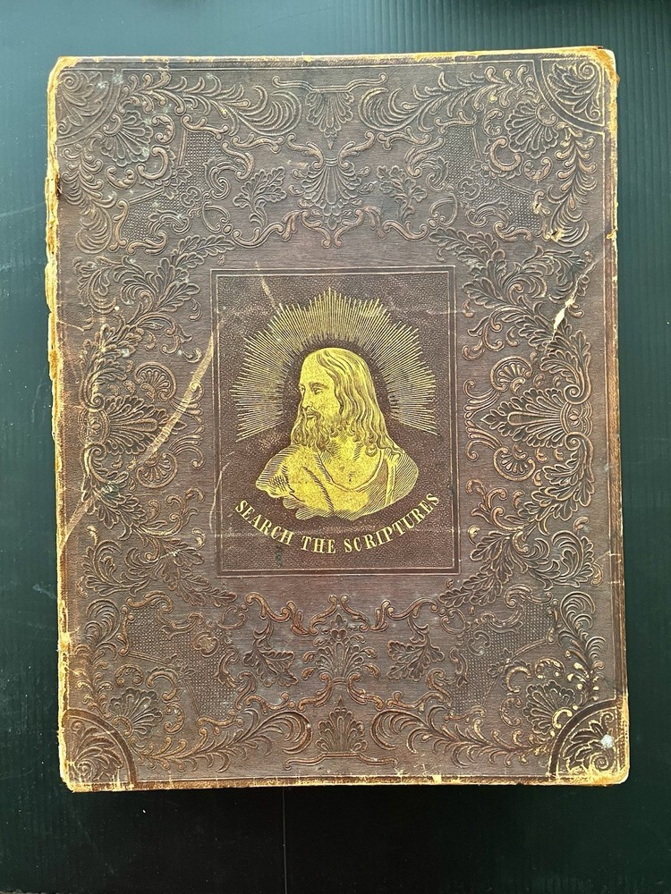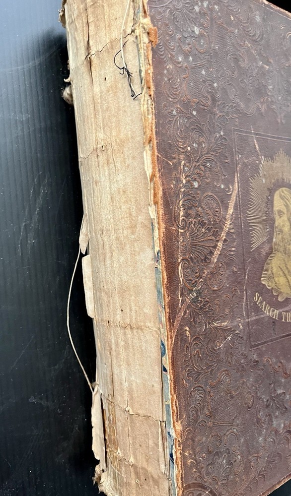 The is a rare 1851 Holy Bible printed in Philadelphia by Edward W. Miller. It features beautiful decorated leather covers and wonderful ENGRAVINGS. It also includes the Apocrypha. There are many inserts related to genealogy. Plus it includes more inserts of poems and beautiful advertising cards—as pictured. There is also a full genealogical listing of all the THOMPSON FAMILY from New Jersey—showing births, marriages, and deaths. This was a very prominent family on the East Coast. The Bible has condition with the front cover detached and some yellowing of pages, but it is complete. This is a rare gem to own.