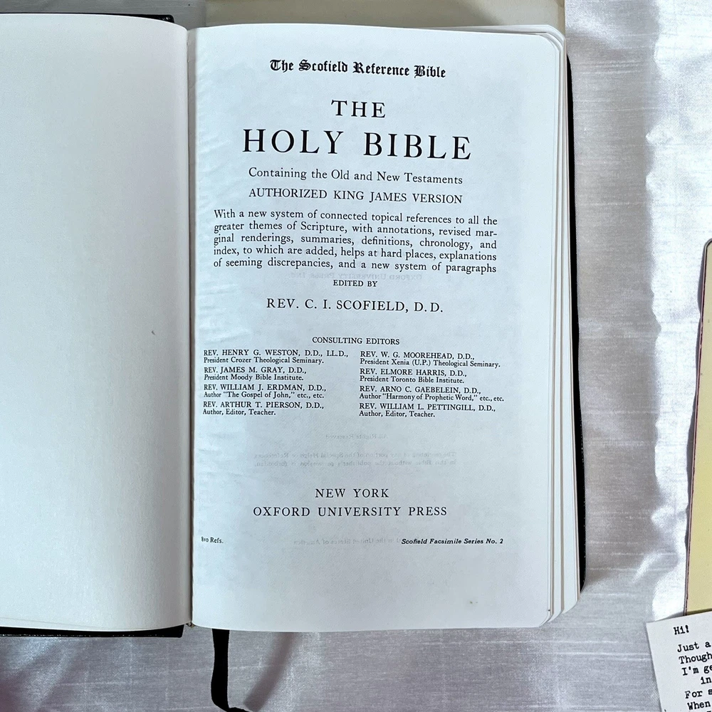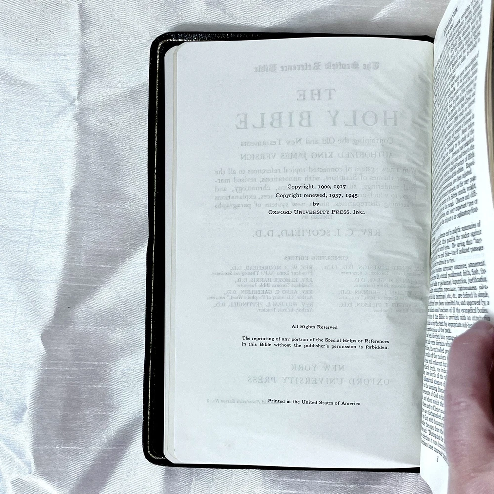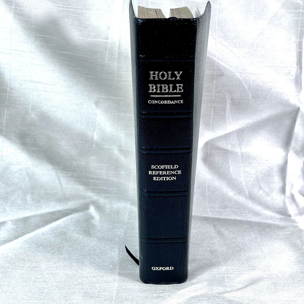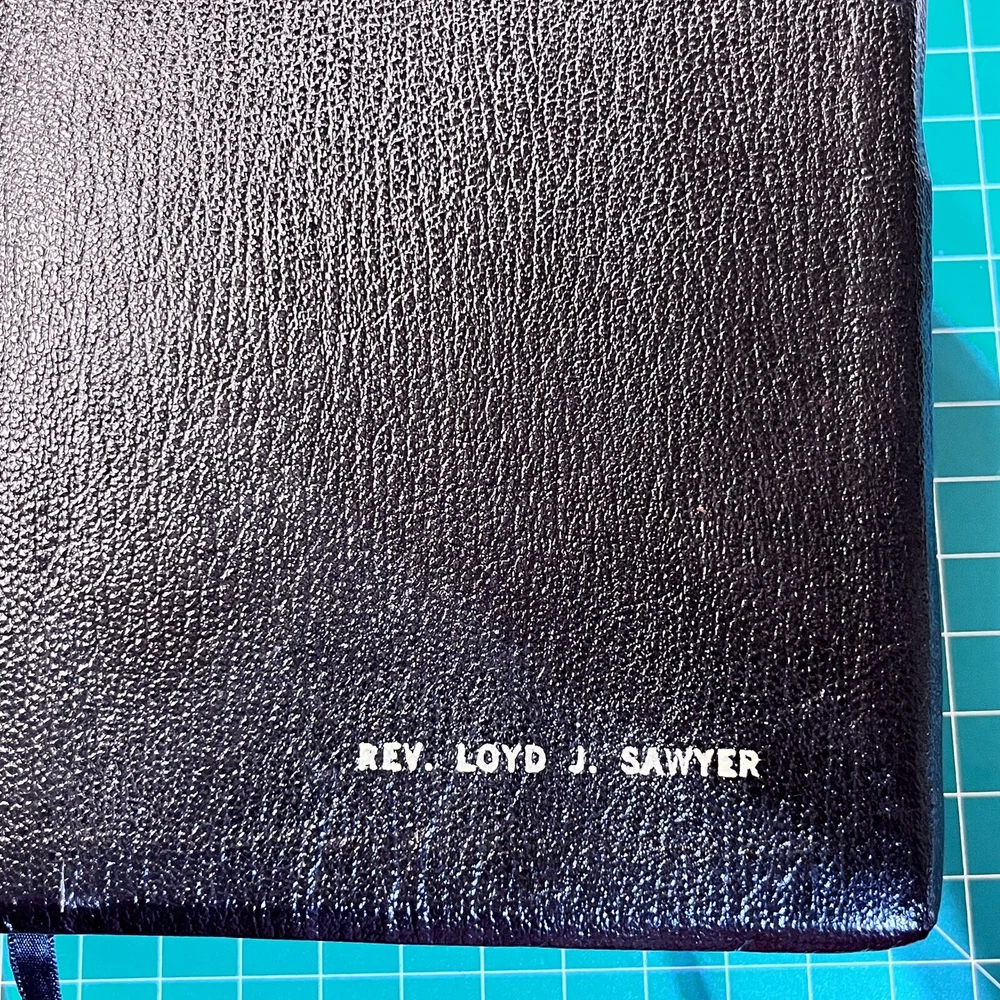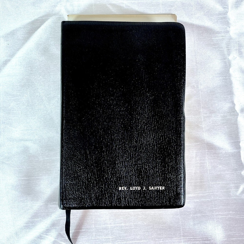1945 The Scofield Reference Holy Bible Concordance, black leather. Owned by Rev. Loyd J. Sawyer. Schofield Facsimile Series No. 2. Contains the Old and New Testaments, authorized King James Version. Features new system of annotations, revised marginal renderings, summaries, definitions, chronology and index. Features maps of early Christian places of interest. Oxford University Press, New York publisher. Rev. Sawyer’s name is inscribed in gold on the cover of the Bible. An inside page has been written on, “To Loyd From Dorothy Father’s Day June 16, 1985.” There are some papers & notes from the pastor included. This Bible is in very good condition—the exception is some pages have passages struck through with red pencil or ink. See photos for condition details. Sold As Is.