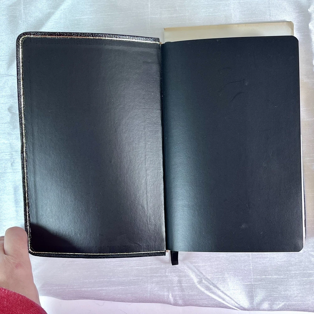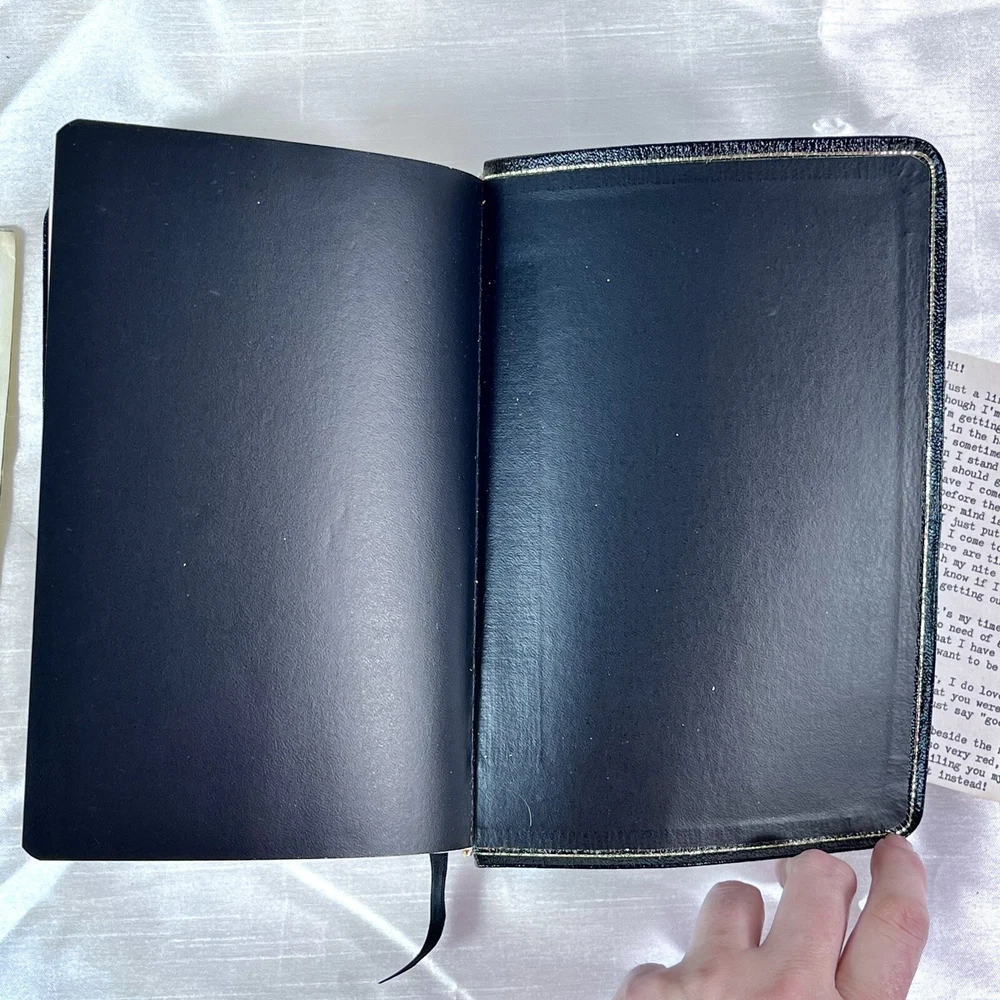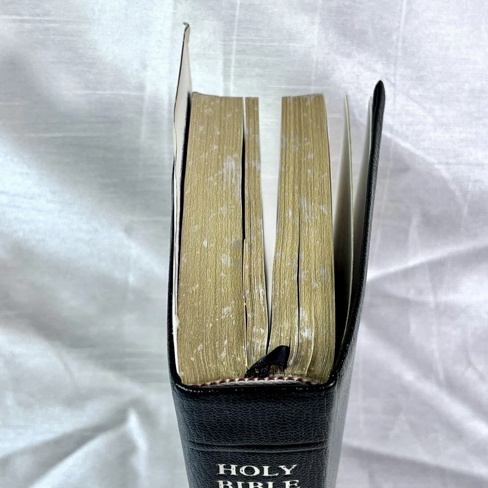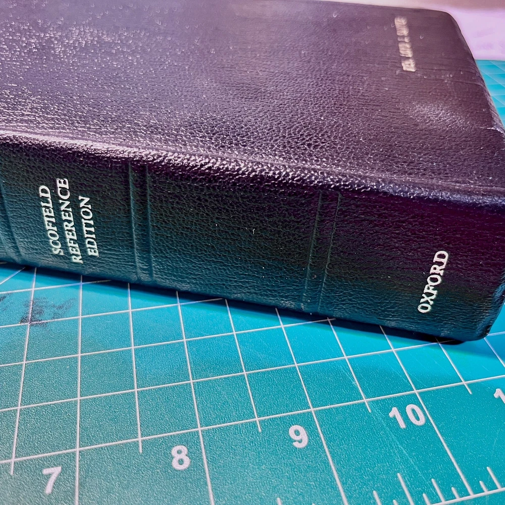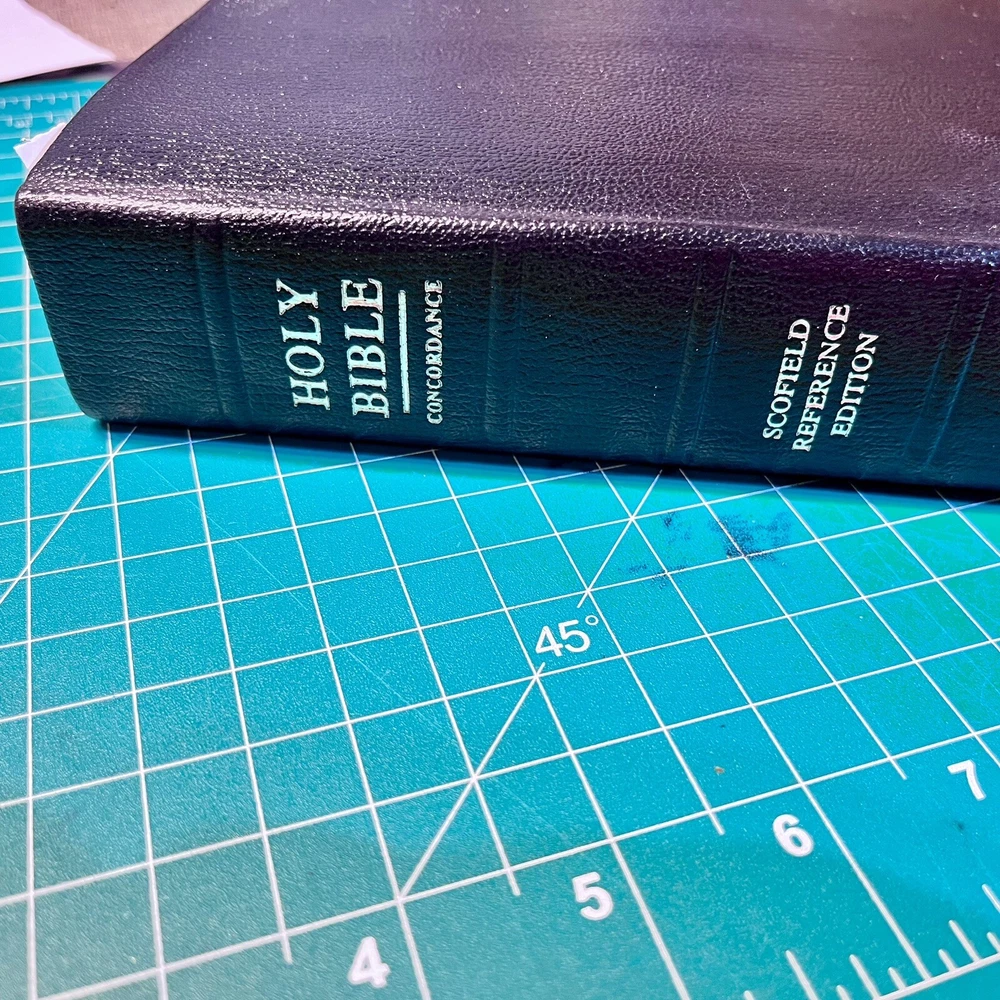 1945 The Scofield Reference Holy Bible Concordance, black leather. Owned by Rev. Loyd J. Sawyer. Schofield Facsimile Series No. 2. Contains the Old and New Testaments, authorized King James Version. Features new system of annotations, revised marginal renderings, summaries, definitions, chronology and index. Features maps of early Christian places of interest. Oxford University Press, New York publisher. Rev. Sawyer’s name is inscribed in gold on the cover of the Bible. An inside page has been written on, “To Loyd From Dorothy Father’s Day June 16, 1985.” There are some papers & notes from the pastor included. This Bible is in very good condition—the exception is some pages have passages struck through with red pencil or ink. See photos for condition details. Sold As Is.