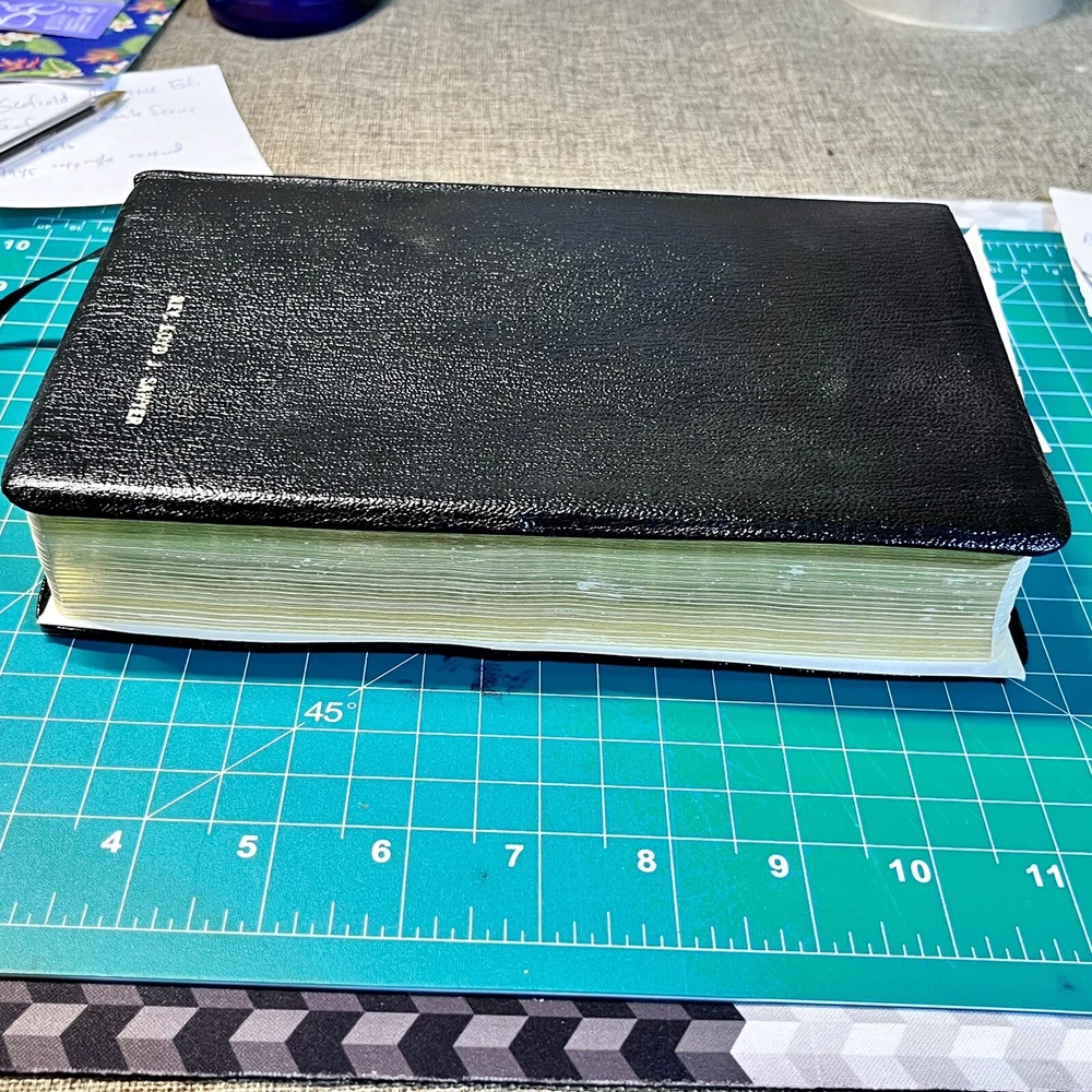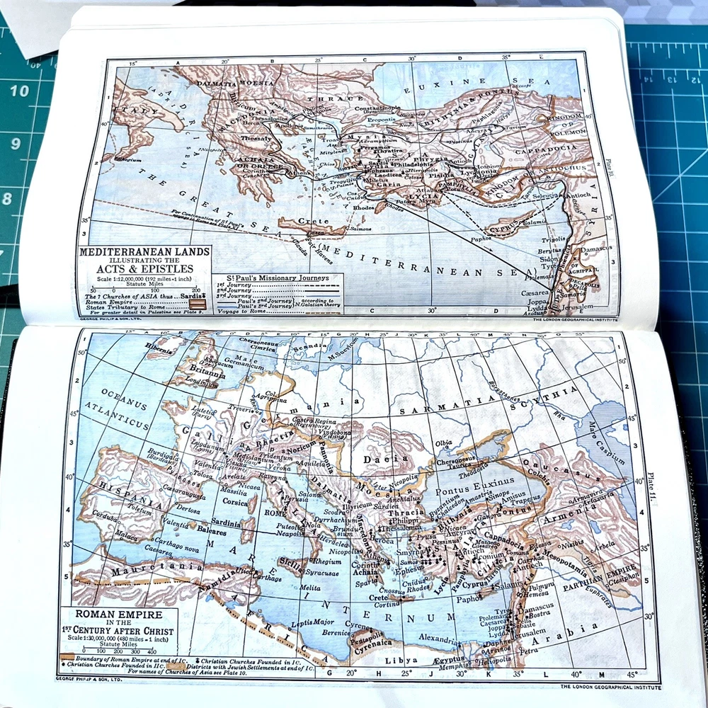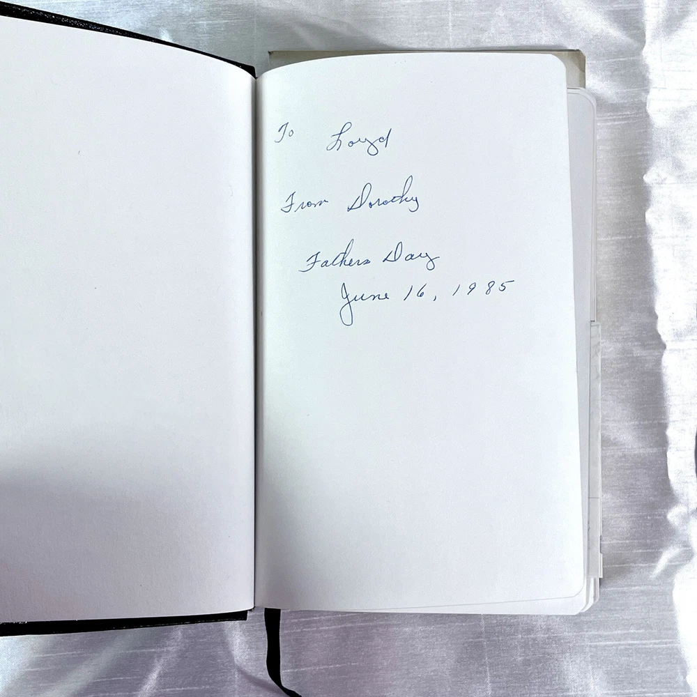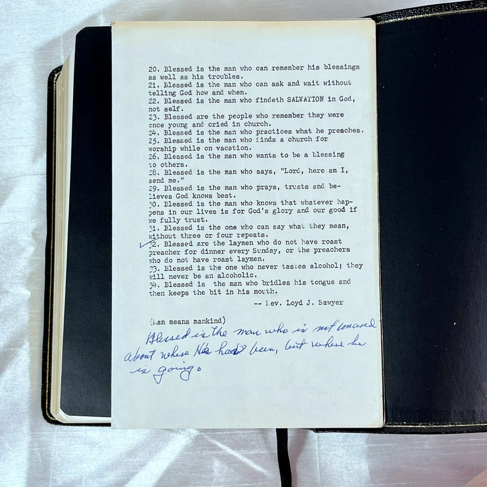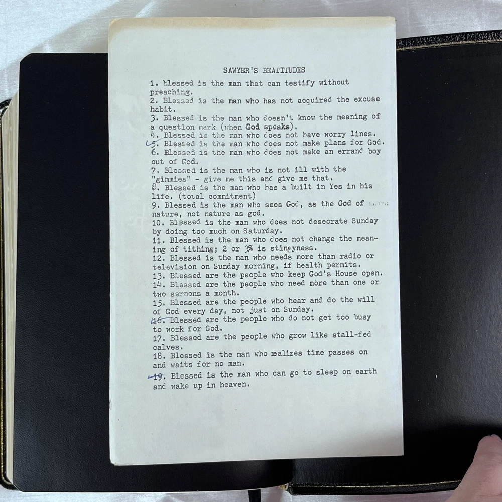 1945 The Scofield Reference Holy Bible Concordance, black leather. Owned by Rev. Loyd J. Sawyer. Schofield Facsimile Series No. 2. Contains the Old and New Testaments, authorized King James Version. Features new system of annotations, revised marginal renderings, summaries, definitions, chronology and index. Features maps of early Christian places of interest. Oxford University Press, New York publisher. Rev. Sawyer’s name is inscribed in gold on the cover of the Bible. An inside page has been written on, “To Loyd From Dorothy Father’s Day June 16, 1985.” There are some papers & notes from the pastor included. This Bible is in very good condition—the exception is some pages have passages struck through with red pencil or ink. See photos for condition details. Sold As Is.