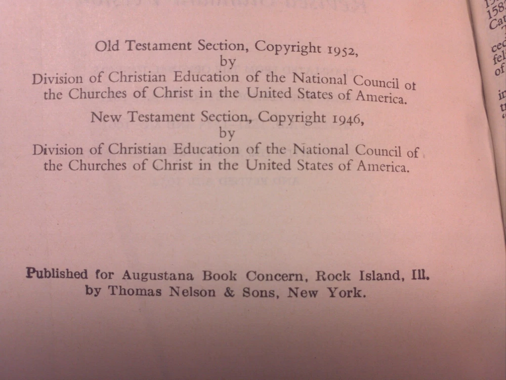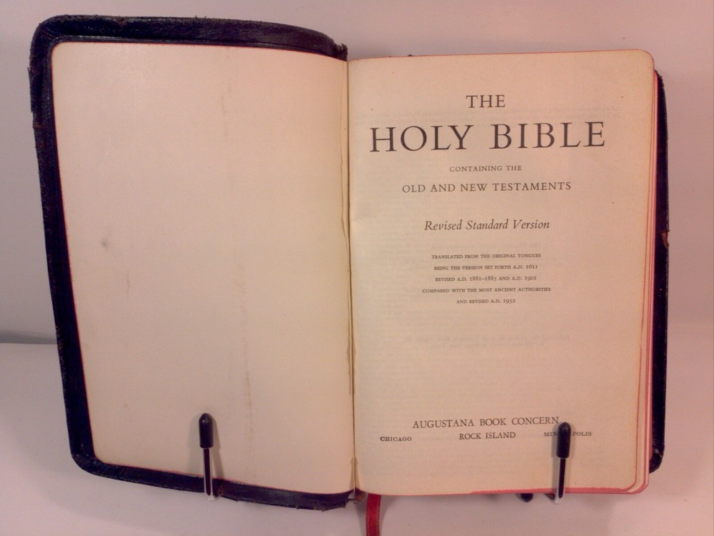 Holy Bible Augustana Revised Standard Version with Helps Black Leather-Bound Published in 1952 by Augustana Book Concern Conditional: Acceptable: The pictures give a good overview of the condition, but in general, the condition rating of this book means it has obvious wear. It has some damage to the cover but integrity still intact. The binding may be slightly damaged but integrity is still intact. Possible writing in margins, possible underlining and highlighting of text, but no missing pages or anything that would compromise the legibility or understanding of the text. Specific comments regarding the condition: Leather covers are somewhat worn, scratched and scuffed, corners and edges cracked. Spine somewhat worn, chipped on top and bottom, gilt lettering bright and not flaked. Endpapers lightly soiled, unmarked. Inside pages clean, unmarked, thumb and corner creased. #3068