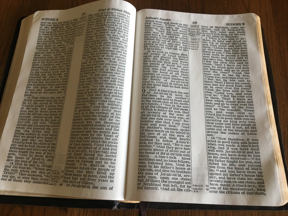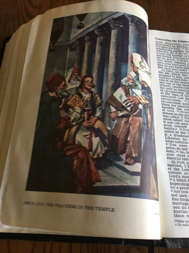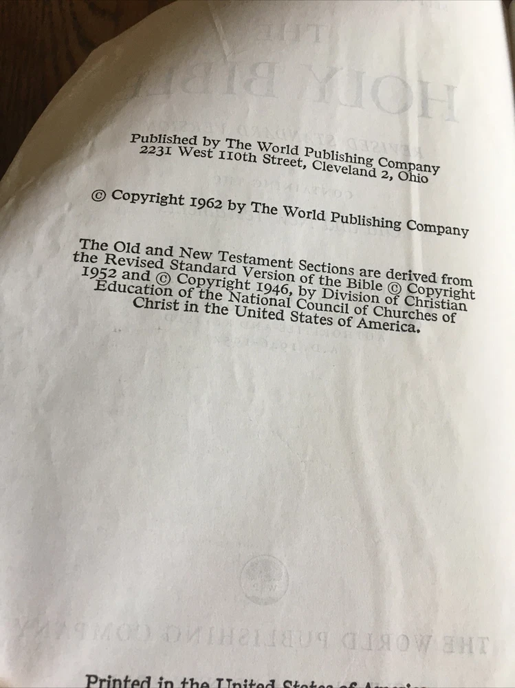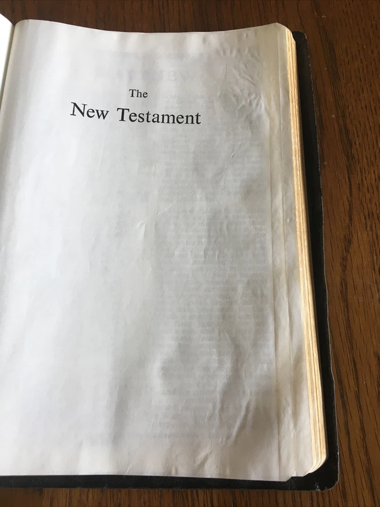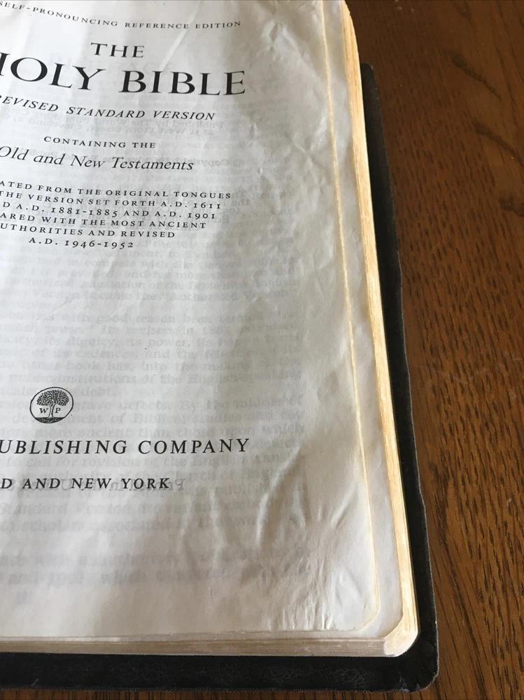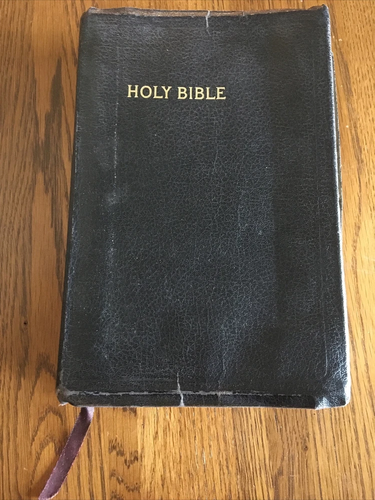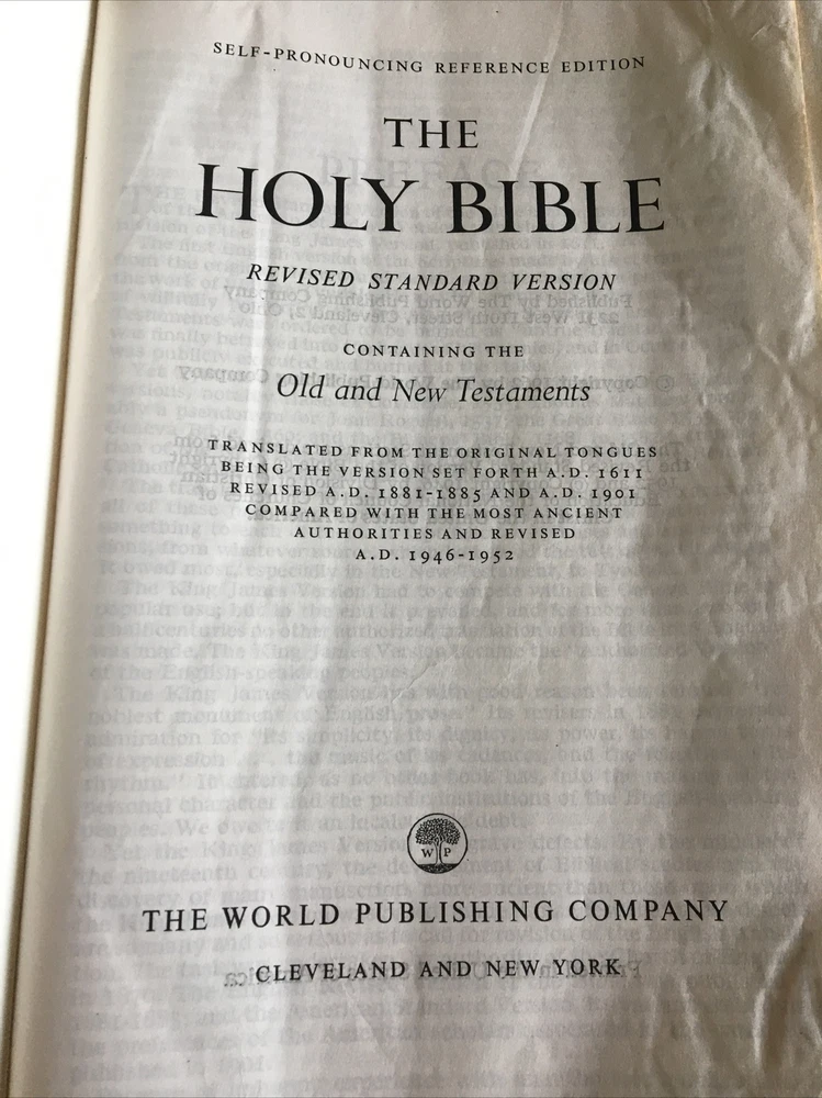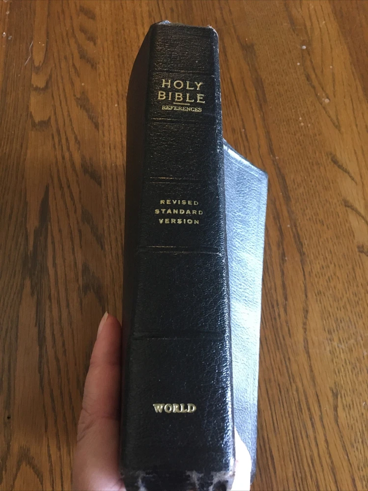 Up for grabs... Holy Bible ~ Black Leather ~ RSV Revised Standard Version from 1962, World Publishing. This Bible has some condition issues, including some wear on the leather edges, some pages have water or tear wrinkles, there are some marking on the pages, wear on the gold edging. This item will come to you via USPS Media Mail from a smoke free home. Happy Shopping!