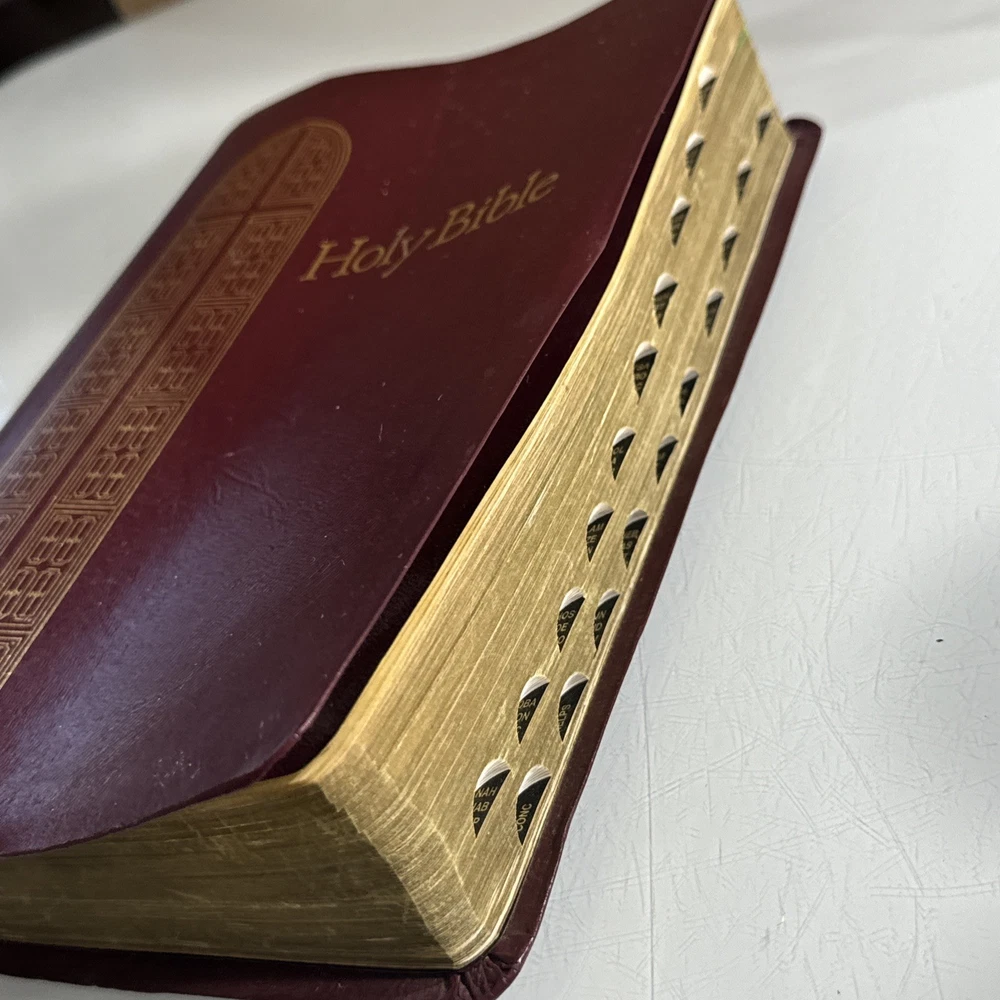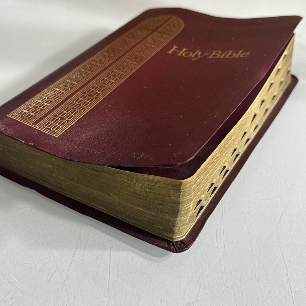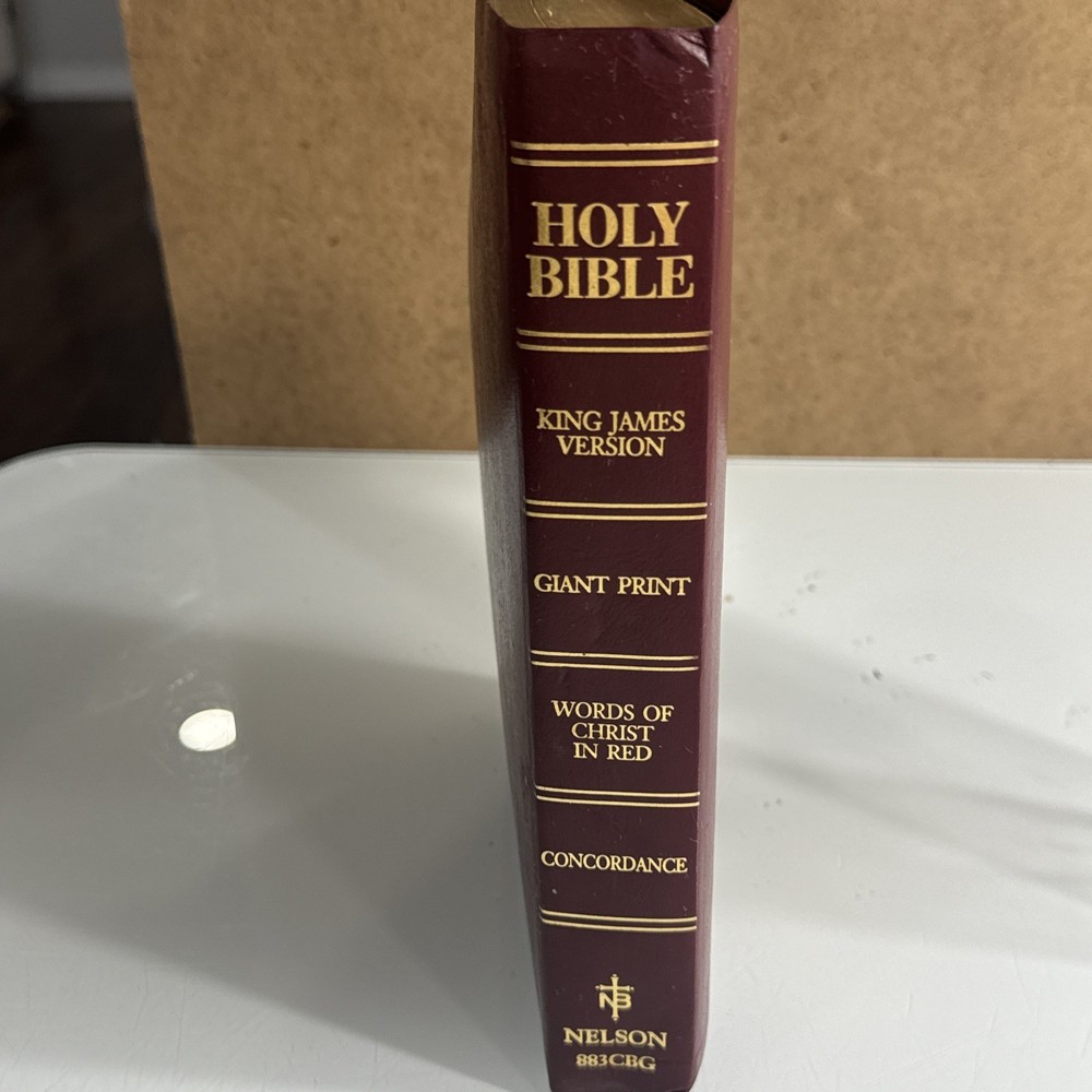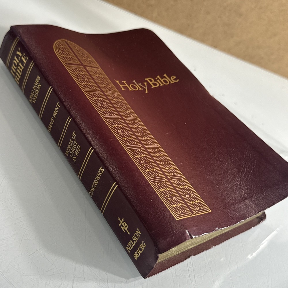 Some family names in front, otherwise in good condition. Slight bend to cover from use The Holy Bible KJV Giant Print with Red Letter Concordance Thumb Index by Thomas Nelson is a vintage Bible edition published in 1976. This Bible is part of the Giant Print Reference Bible series and features a red letter edition, making it easy to identify important passages. It includes a comprehensive concordance, thumb index, and maps, making it a valuable resource for young adults and adults interested in religious and spiritual topics. The English language Bible is inscribed and bound in bonded leather, making it a durable and meaningful addition to any collection.
