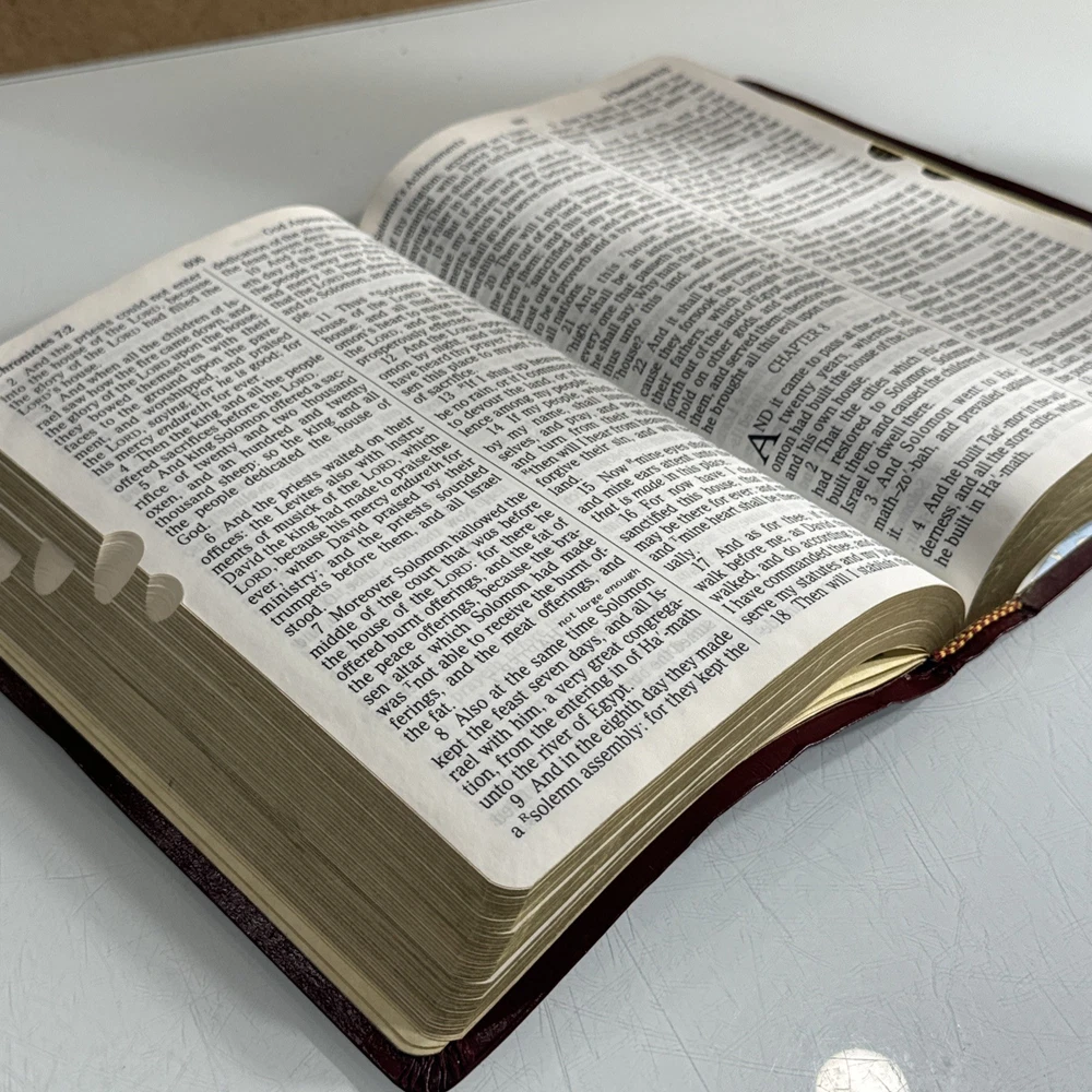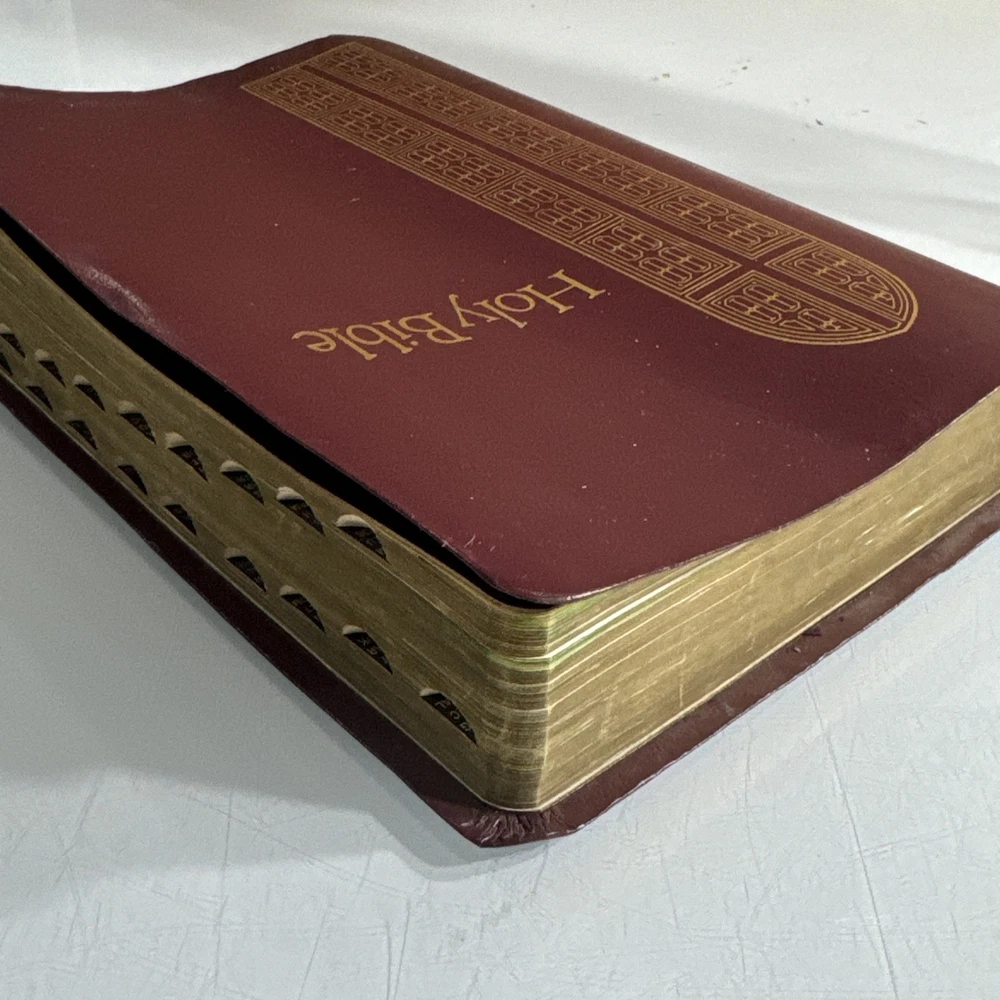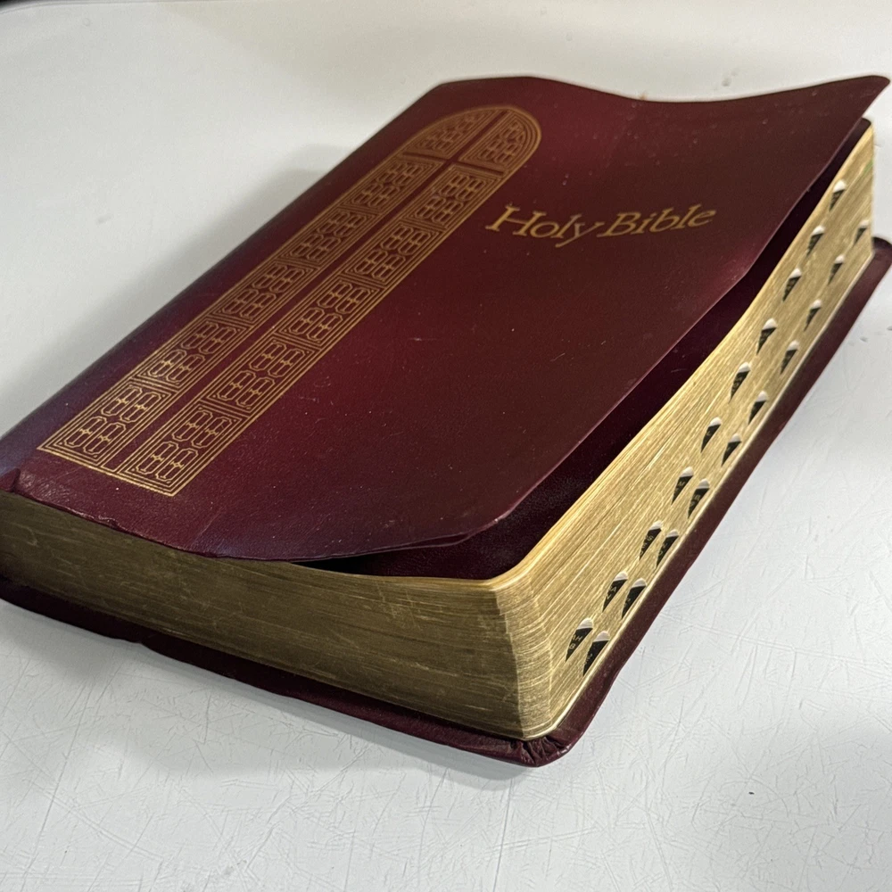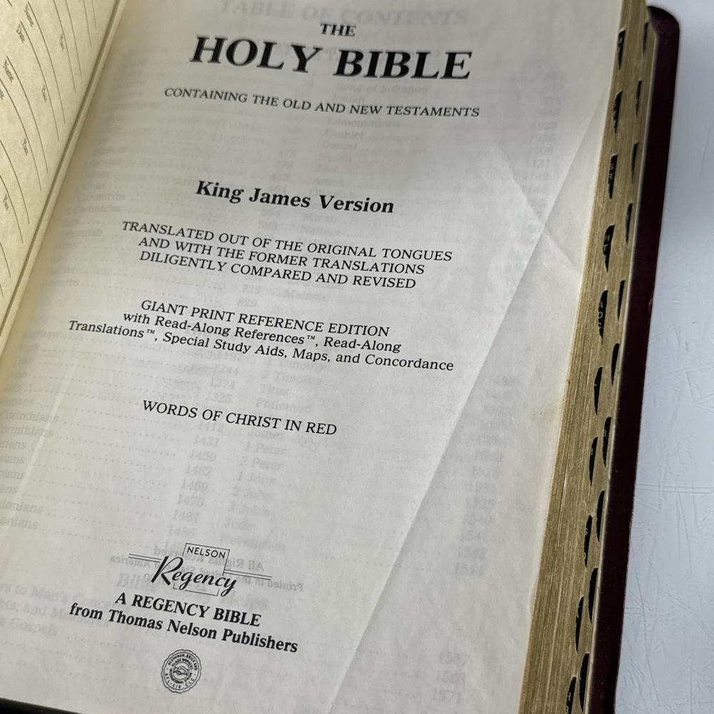 Some family names in front, otherwise in good condition. Slight bend to cover from use The Holy Bible KJV Giant Print with Red Letter Concordance Thumb Index by Thomas Nelson is a vintage Bible edition published in 1976. This Bible is part of the Giant Print Reference Bible series and features a red letter edition, making it easy to identify important passages. It includes a comprehensive concordance, thumb index, and maps, making it a valuable resource for young adults and adults interested in religious and spiritual topics. The English language Bible is inscribed and bound in bonded leather, making it a durable and meaningful addition to any collection.
