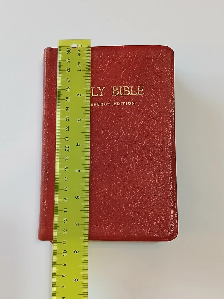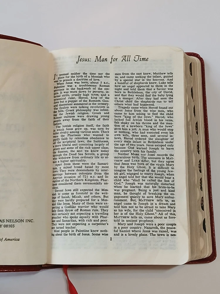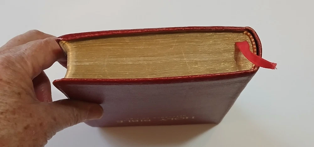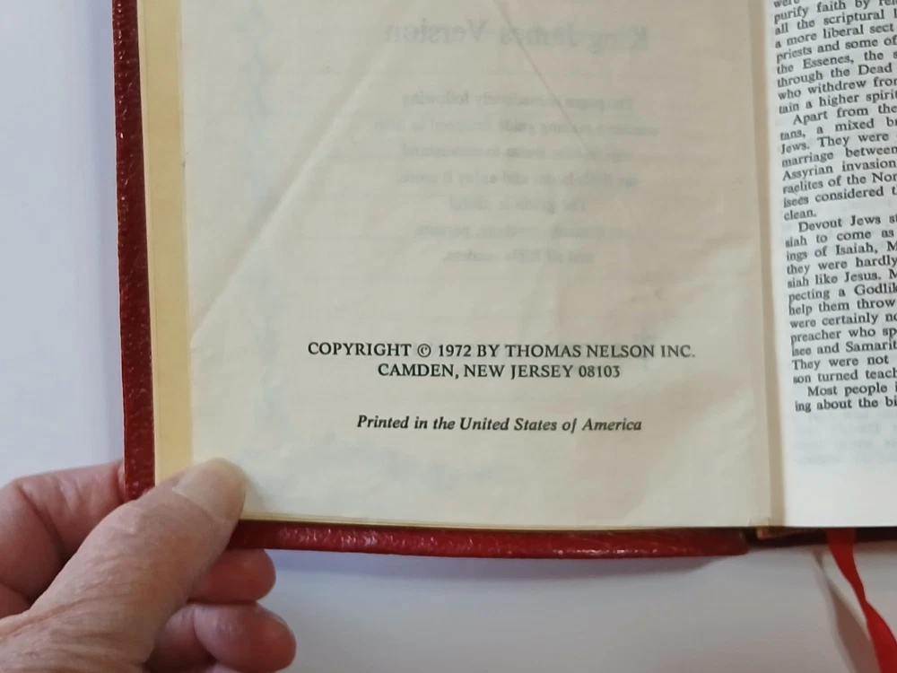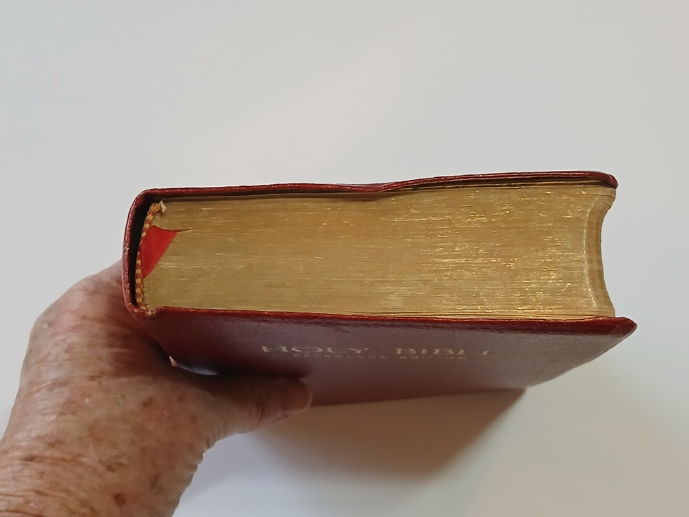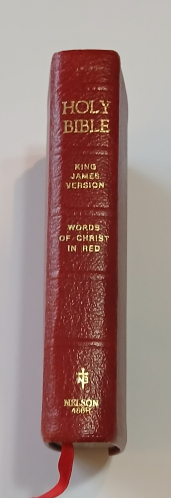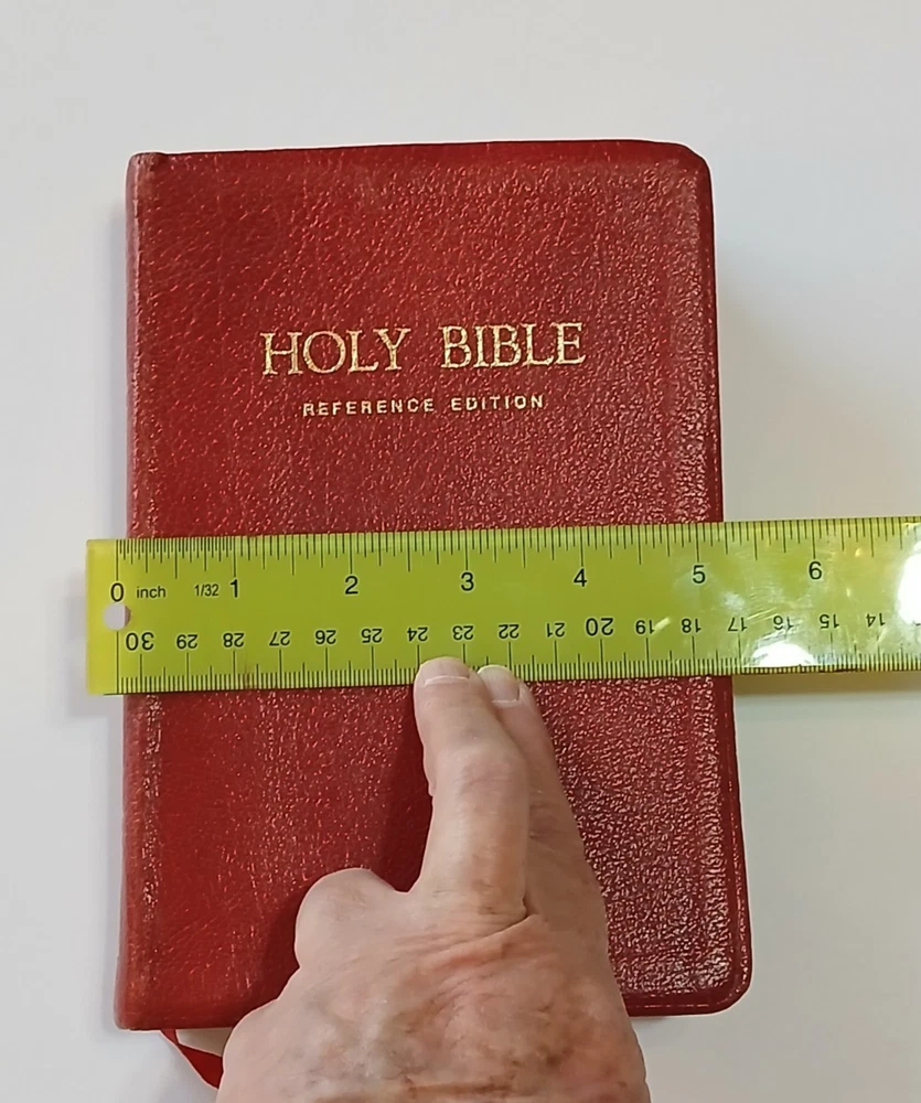 We think this is the perfect personal carry-size KJV Bible! ©1972 by Thomas Nelson Inc. 486R King James Version Bible Reference Edition. Printed in the USA. Red leather cover shows a few scuffs and scrapes from age, use and storage, but feels good in the hand. This Bible was originally a gift so the presentation page is neatly inscribed in ink (dated 1980). Words of Christ are in red. Has convenient tabs, a ribbon, Concordance, full-color maps, and gilded page edges. We did a quick scan (so may have missed something) and this is what we found: This is a lovingly used Bible so some of the pages are a bit crumpled/pleated, and a few pages have small stains of unknown origin, some of the page corners are bent from storage, but we found no deliberately bent page corners or pen/pencil markings other than the presentation inscription. Except for places shown in photos, the binding is tight. Measures about 7-5/8 by 5-1/4 by 1-3/8, and weighs about 1-pound, 5-ounces. Measurements and weights provided are approximates. Photos are part of the description so please examine them to determine condition before bidding. Being sold as-is. All sales are final.