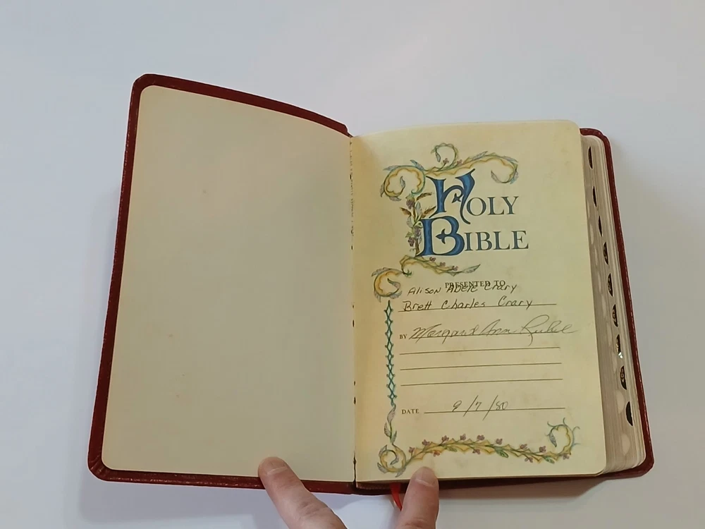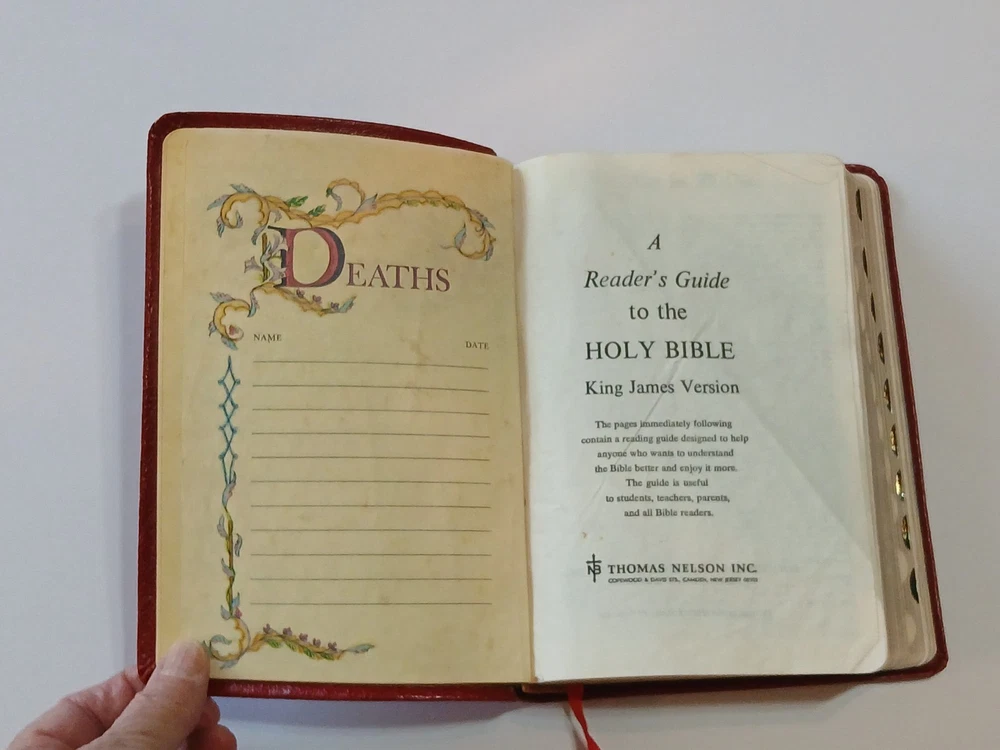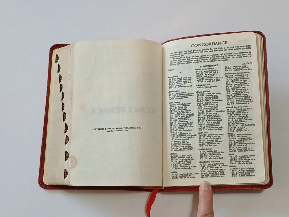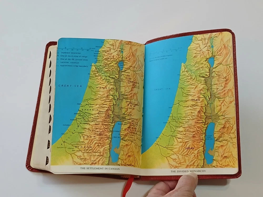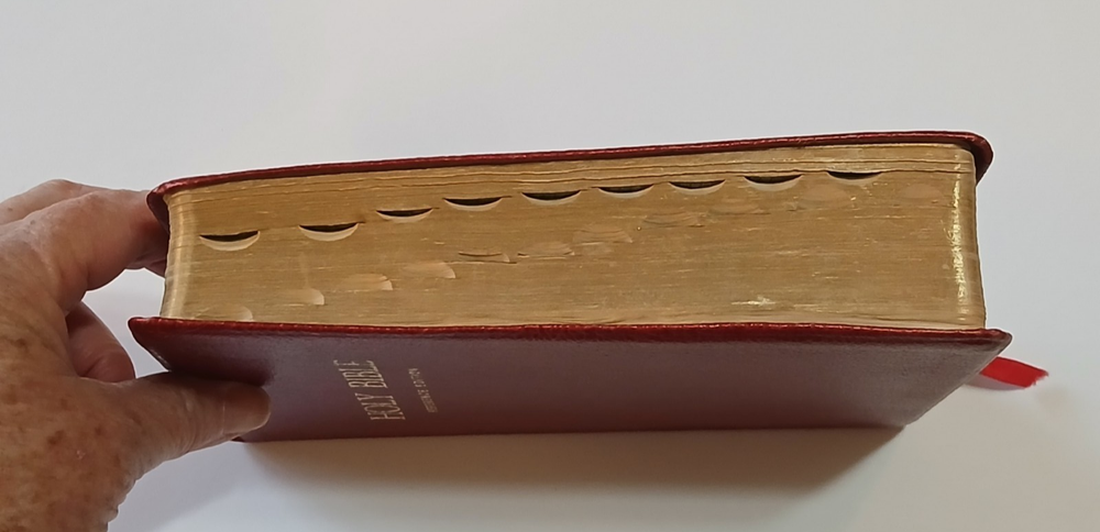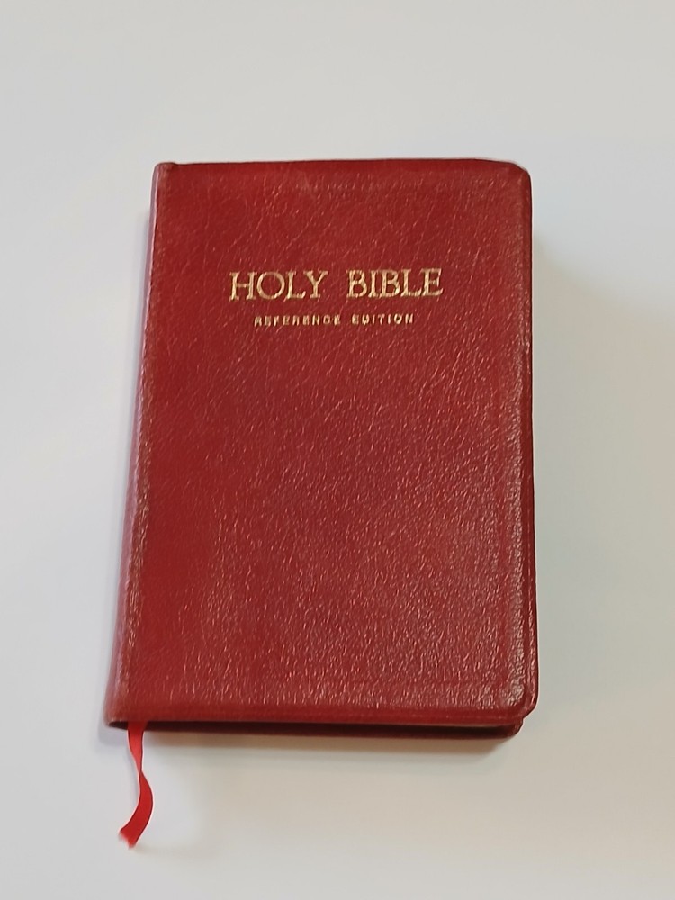 We think this is the perfect personal carry-size KJV Bible! ©1972 by Thomas Nelson Inc. 486R King James Version Bible Reference Edition. Printed in the USA. Red leather cover shows a few scuffs and scrapes from age, use and storage, but feels good in the hand. This Bible was originally a gift so the presentation page is neatly inscribed in ink (dated 1980). Words of Christ are in red. Has convenient tabs, a ribbon, Concordance, full-color maps, and gilded page edges. We did a quick scan (so may have missed something) and this is what we found: This is a lovingly used Bible so some of the pages are a bit crumpled/pleated, and a few pages have small stains of unknown origin, some of the page corners are bent from storage, but we found no deliberately bent page corners or pen/pencil markings other than the presentation inscription. Except for places shown in photos, the binding is tight. Measures about 7-5/8 by 5-1/4 by 1-3/8, and weighs about 1-pound, 5-ounces. Measurements and weights provided are approximates. Photos are part of the description so please examine them to determine condition before bidding. Being sold as-is. All sales are final.