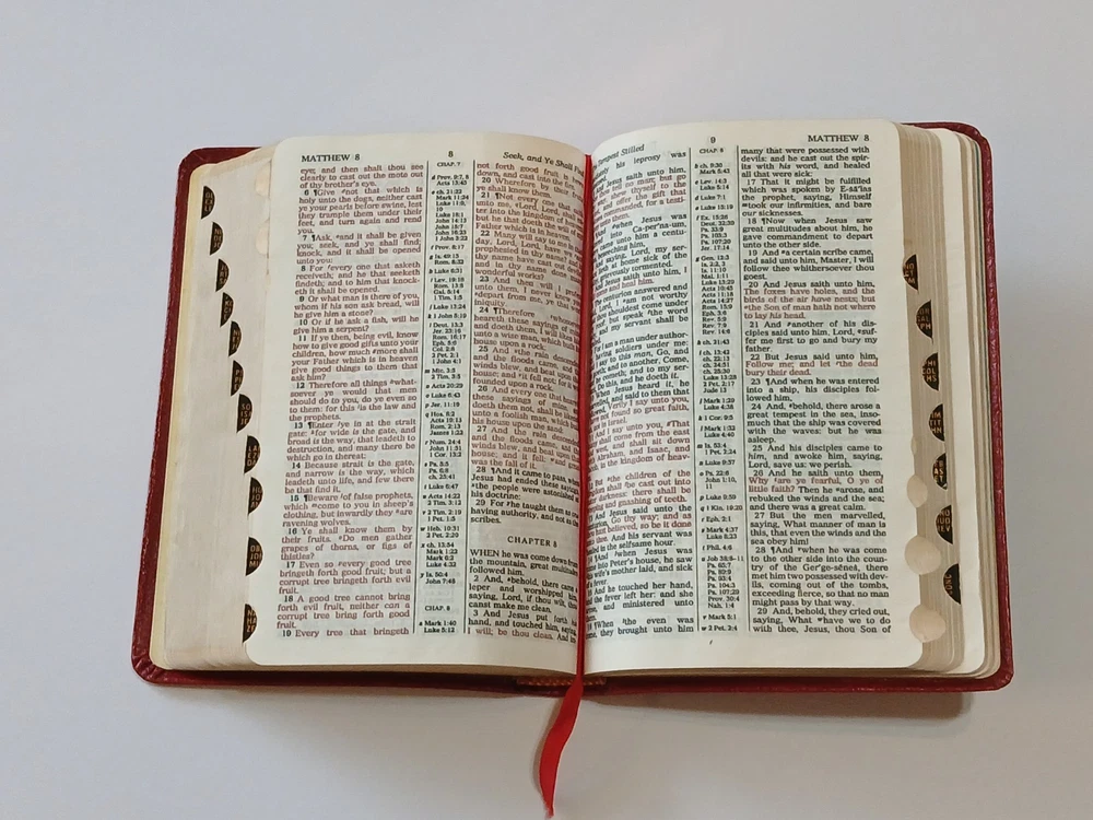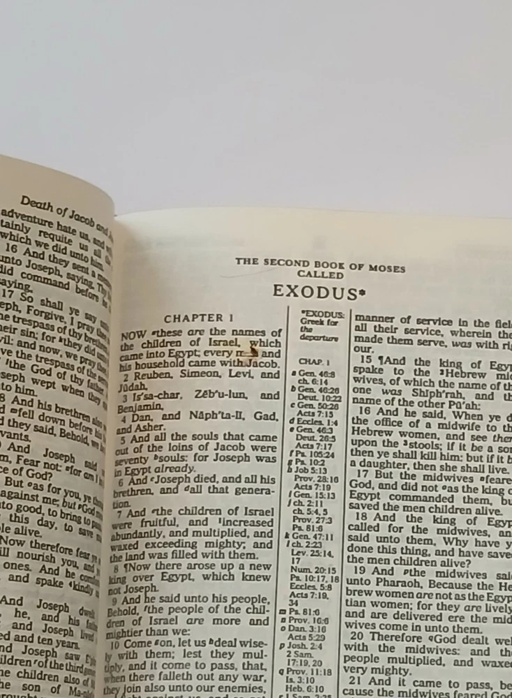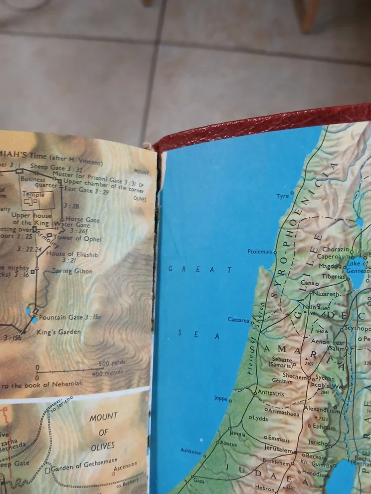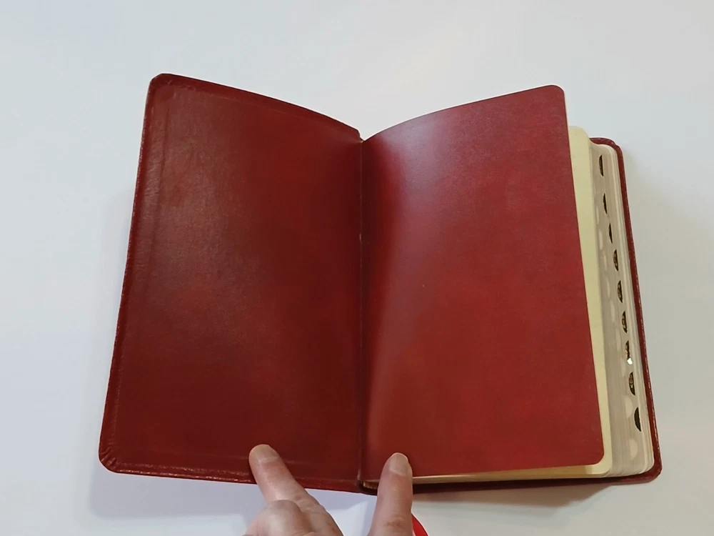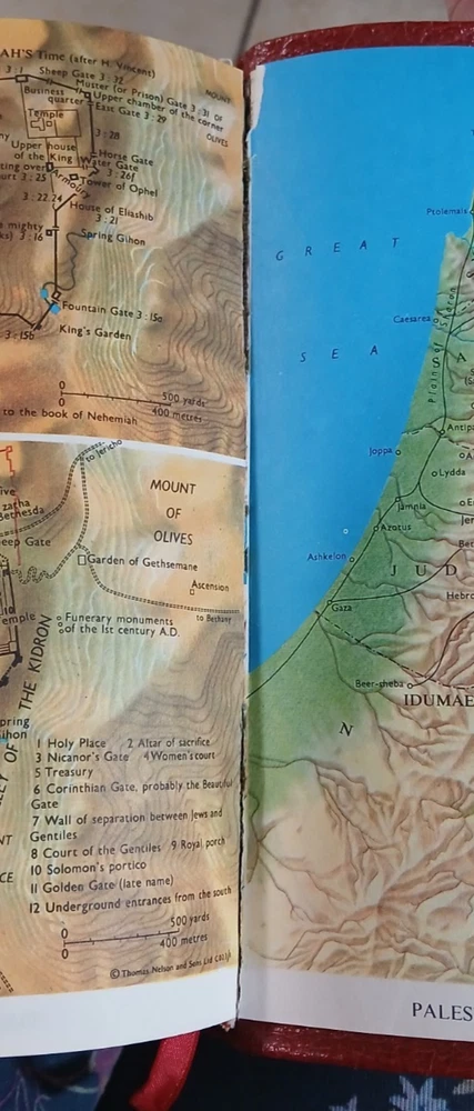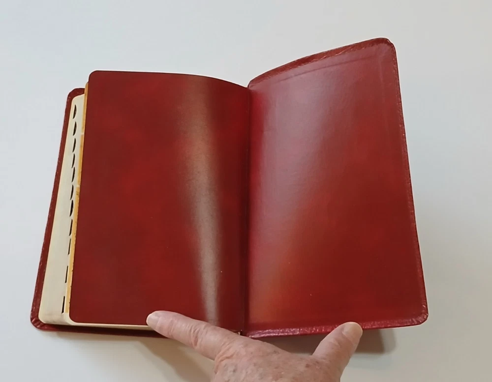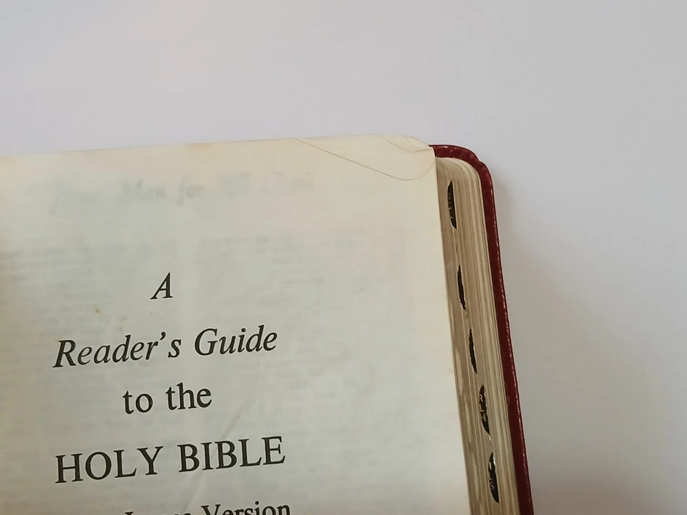 We think this is the perfect personal carry-size KJV Bible! ©1972 by Thomas Nelson Inc. 486R King James Version Bible Reference Edition. Printed in the USA. Red leather cover shows a few scuffs and scrapes from age, use and storage, but feels good in the hand. This Bible was originally a gift so the presentation page is neatly inscribed in ink (dated 1980). Words of Christ are in red. Has convenient tabs, a ribbon, Concordance, full-color maps, and gilded page edges. We did a quick scan (so may have missed something) and this is what we found: This is a lovingly used Bible so some of the pages are a bit crumpled/pleated, and a few pages have small stains of unknown origin, some of the page corners are bent from storage, but we found no deliberately bent page corners or pen/pencil markings other than the presentation inscription. Except for places shown in photos, the binding is tight. Measures about 7-5/8 by 5-1/4 by 1-3/8, and weighs about 1-pound, 5-ounces. Measurements and weights provided are approximates. Photos are part of the description so please examine them to determine condition before bidding. Being sold as-is. All sales are final.