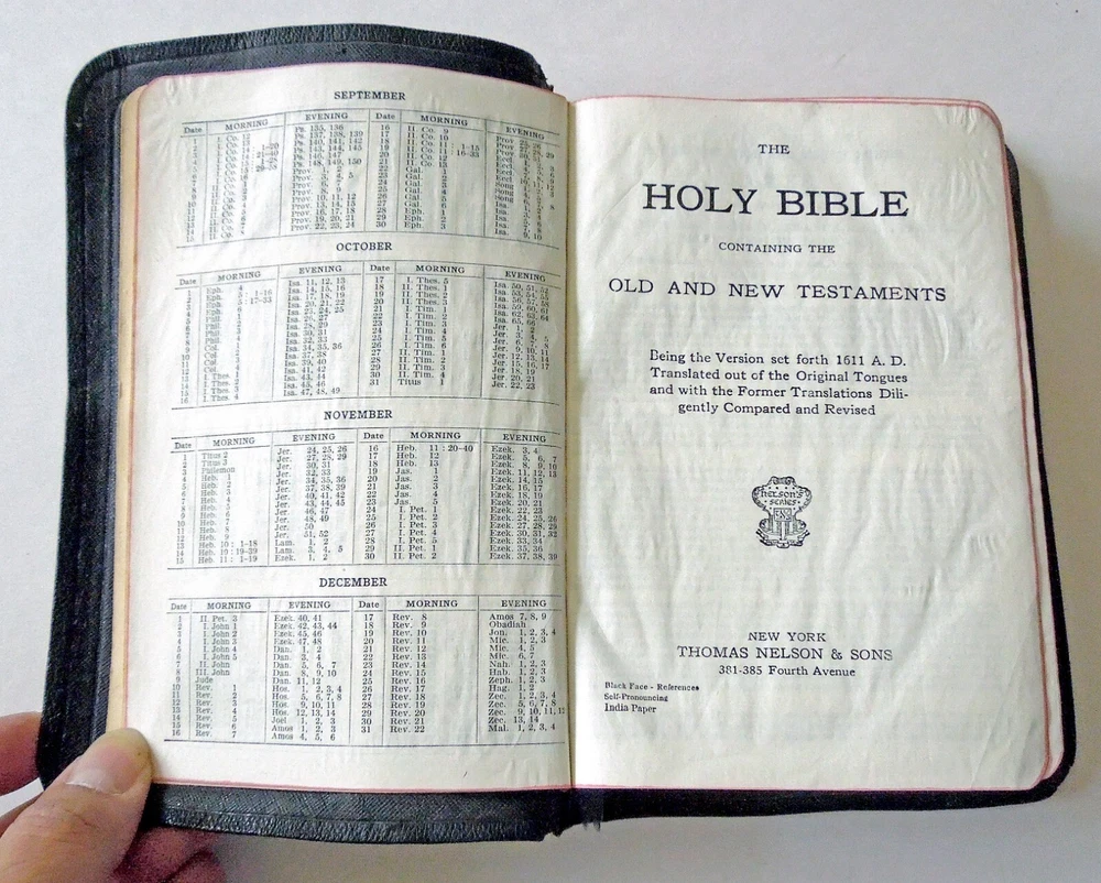 HOLY BIBLE 1,629pgs+. Softcover edition (leather bound). Published by Thomas Nelson. Good; some cover/spine wear. Some pen markings. Approx: 5" x 7 1/2" x 1 3/8", 1lb 5oz. Complete and Unabridged. King James Version (KJV). Cloth marker. India paper. Center Reference Column. Bible reading schedule. Self-pronouncing. Concordance. Maps. Not a stock photo. Please read entire listing and inspect item photo(s), before bidding. Please bid only if serious. All items sold "as is". All Sales Final. SHIPPING METHOD: Media Mail. Shipping total is calculated by Ebay. Late or non-payment may result in an unpaid claim with Ebay. I will ship your item(s) as fast as I can after payment has been received. - See something in the listing that needs correction? Want more photos, or have a question? Write me a note! :) INFORMATION: I ship only to addresses in the United States. Handling time is five (5) business days, though often less. I try my best to describe each item, though please bare in mind I am not a professional expert/appraiser. Please make sure your mailing address is correct before you buy. I cannot ship on weekends (Saturdays & Sundays) or federal holidays. THANKS FOR LOOKING AT MY ITEM! I INVITE YOU TO TAKE A PEEK AT ALL OF THE MANY OTHER ITEMS I'M SELLING ON EBAY! HAVE A GREAT DAY! :)