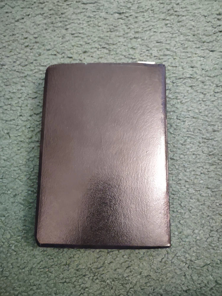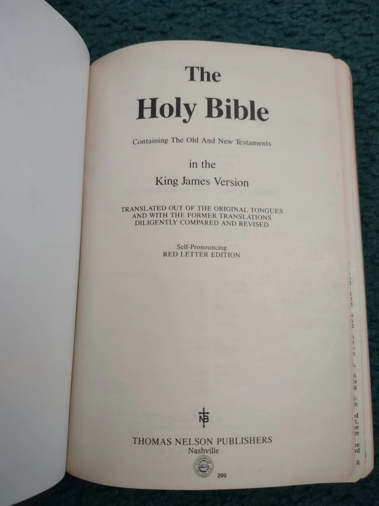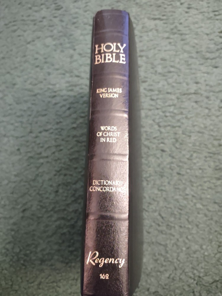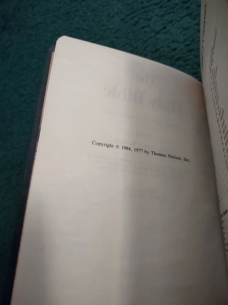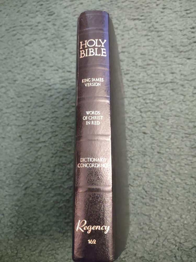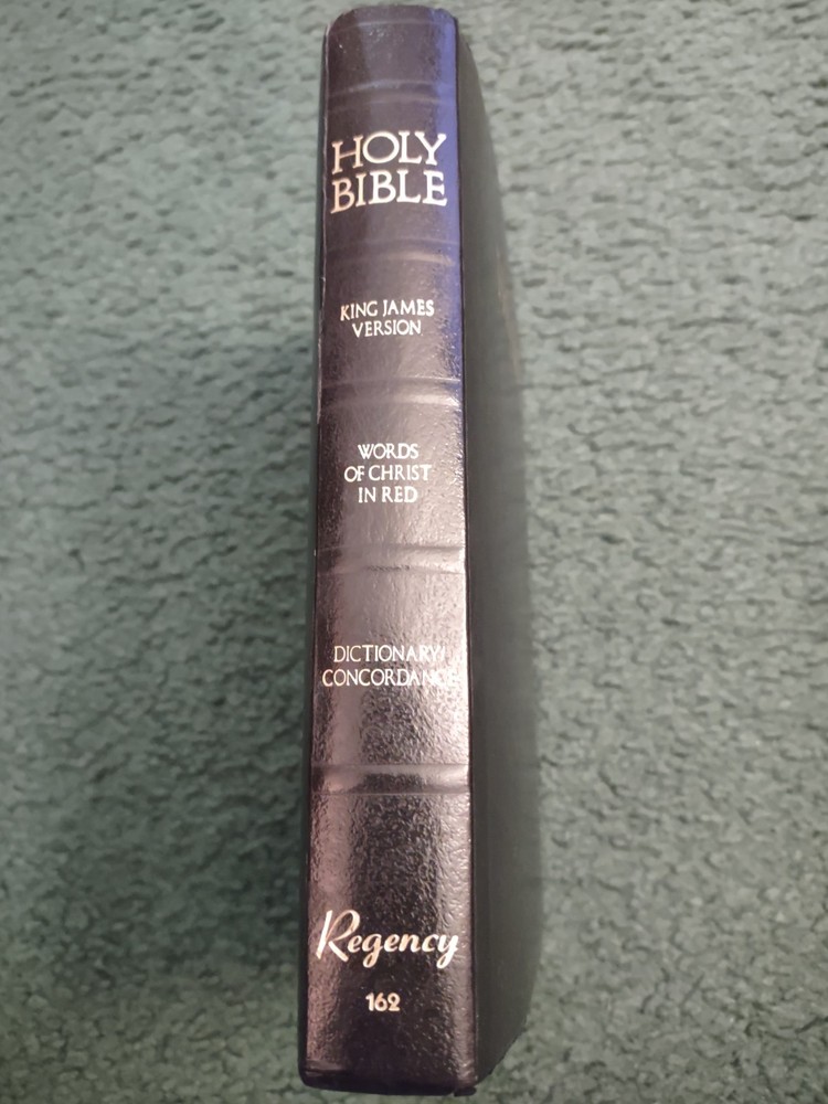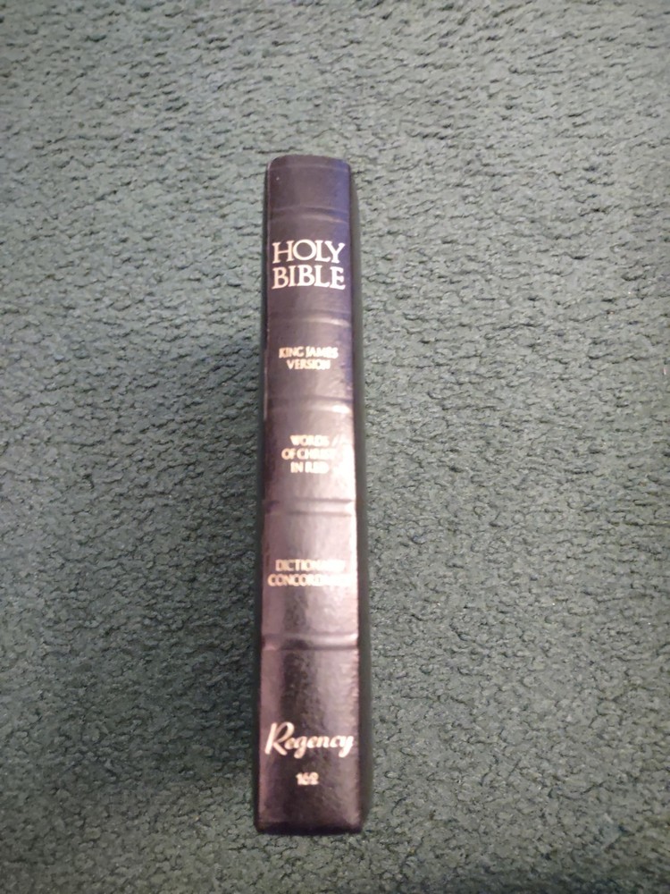 This is a beautiful, compact copy of the King James Version of the Bible, published in 1984 by Thomas Nelson Publishers. It is a red-letter edition with a dictionary and concordance, and has a beautiful photo of the Dead Sea at sunrise on the inside front cover and a lovely map of St. Paul's journeys on the inside back cover. This copy is in very good condition, with only some remnants of a label on the "presented to" page, making it easily giftable.