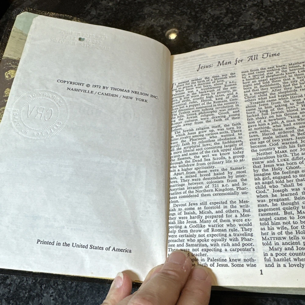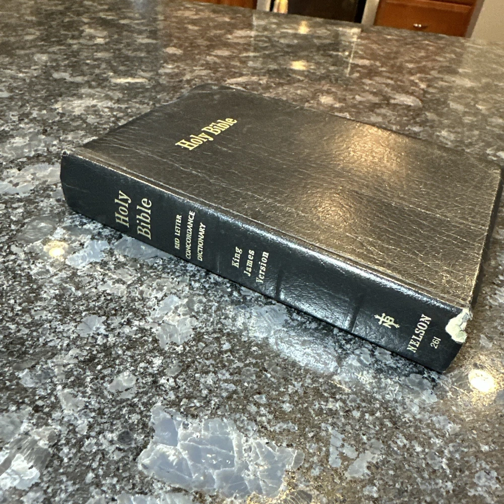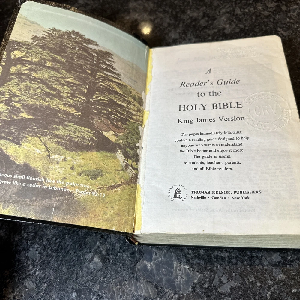 This is a vintage Holy Bible King James Version published by Thomas Nelson in 1983. It features a faux leather bound and a map. The book has 569 pages and is written in English. The intended audience is young adults, ages 2-3, ages 4-8, ages 9-12, adults, and under 2 years old. The book is a part of the God's word book series and is perfect for those interested in Christianity. It is not personalized, inscribed, or signed. The book is suitable for personal use and is a great addition to any collection.