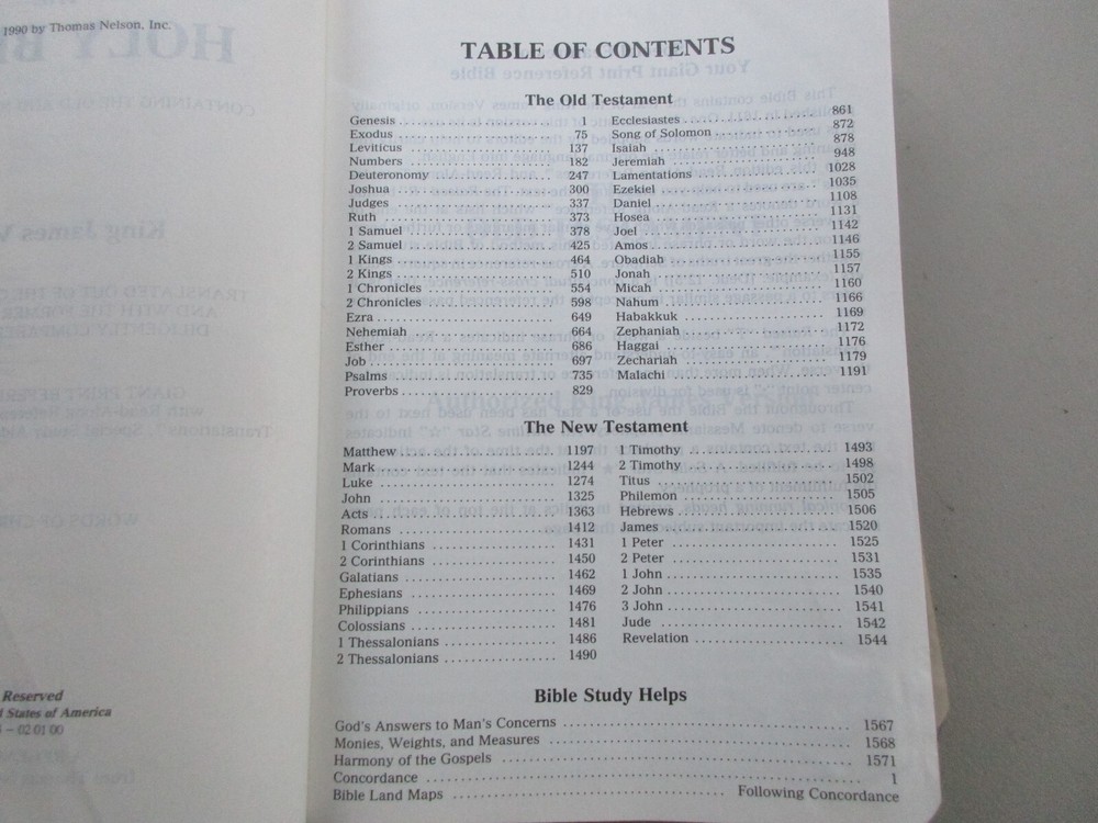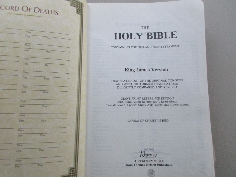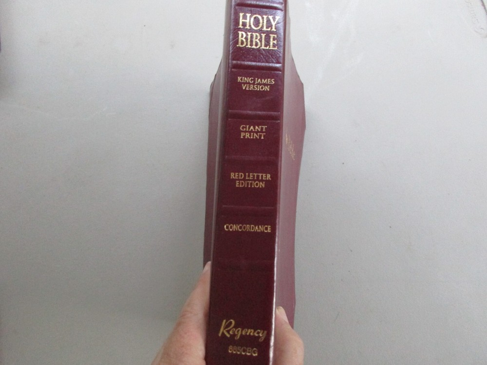 Nice copy of the Holy Bible - GIANT PRINT King James Version Red Letter Edition Concordance REGENCY 885 CBG Regency Bible piblished by Thomas Nelson, USA No markings, staining or smoke odor. Some pages at the end are loose Still a useable, readable Bible BX-BK-RED