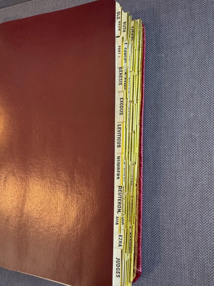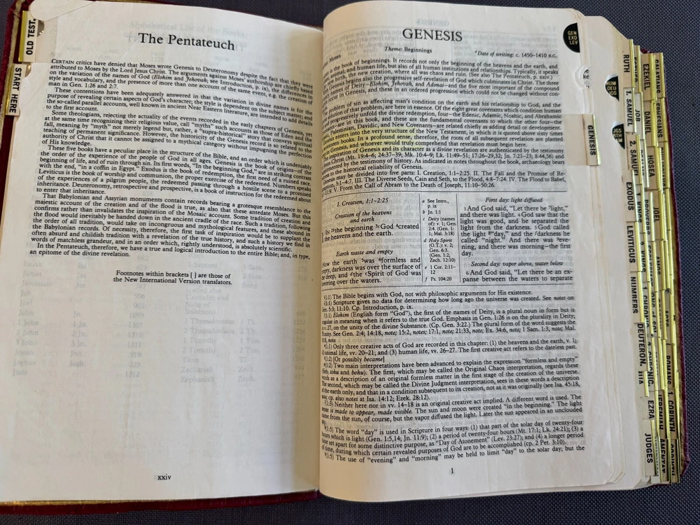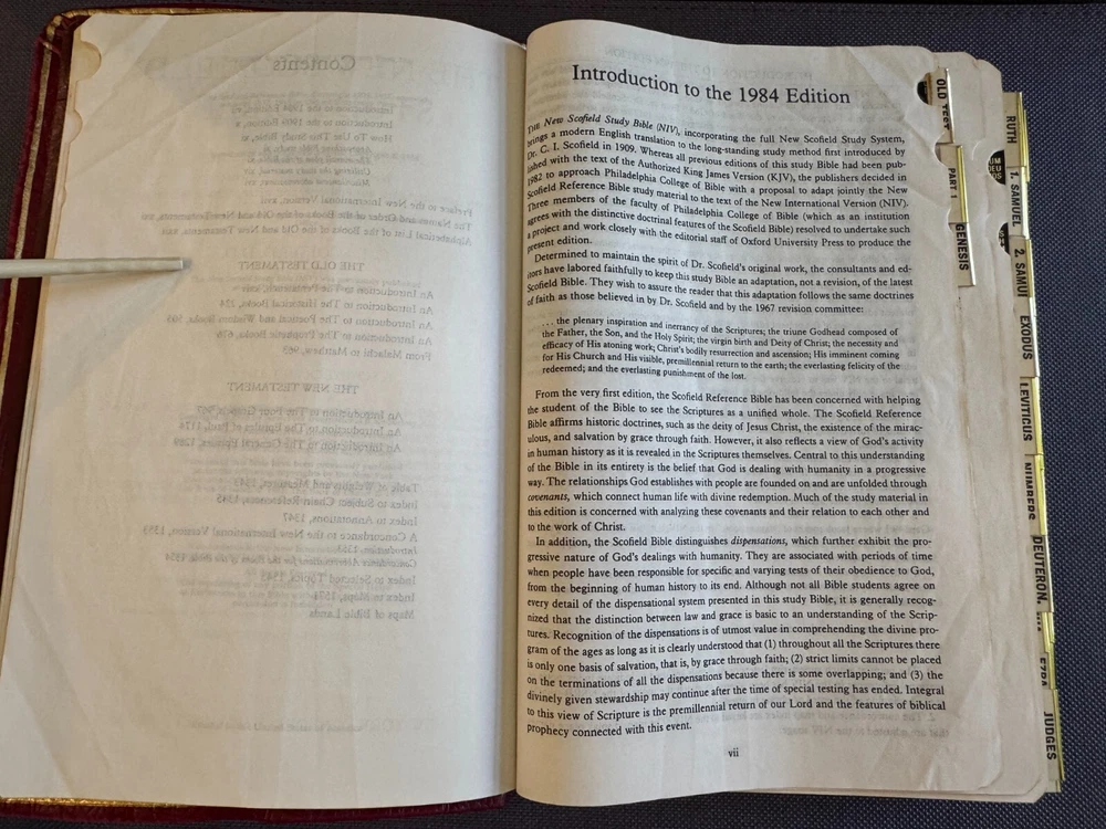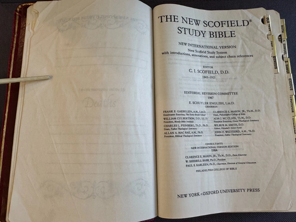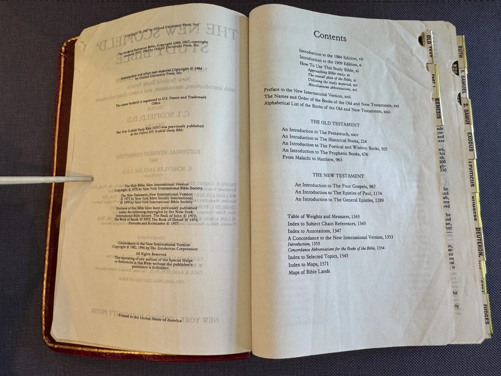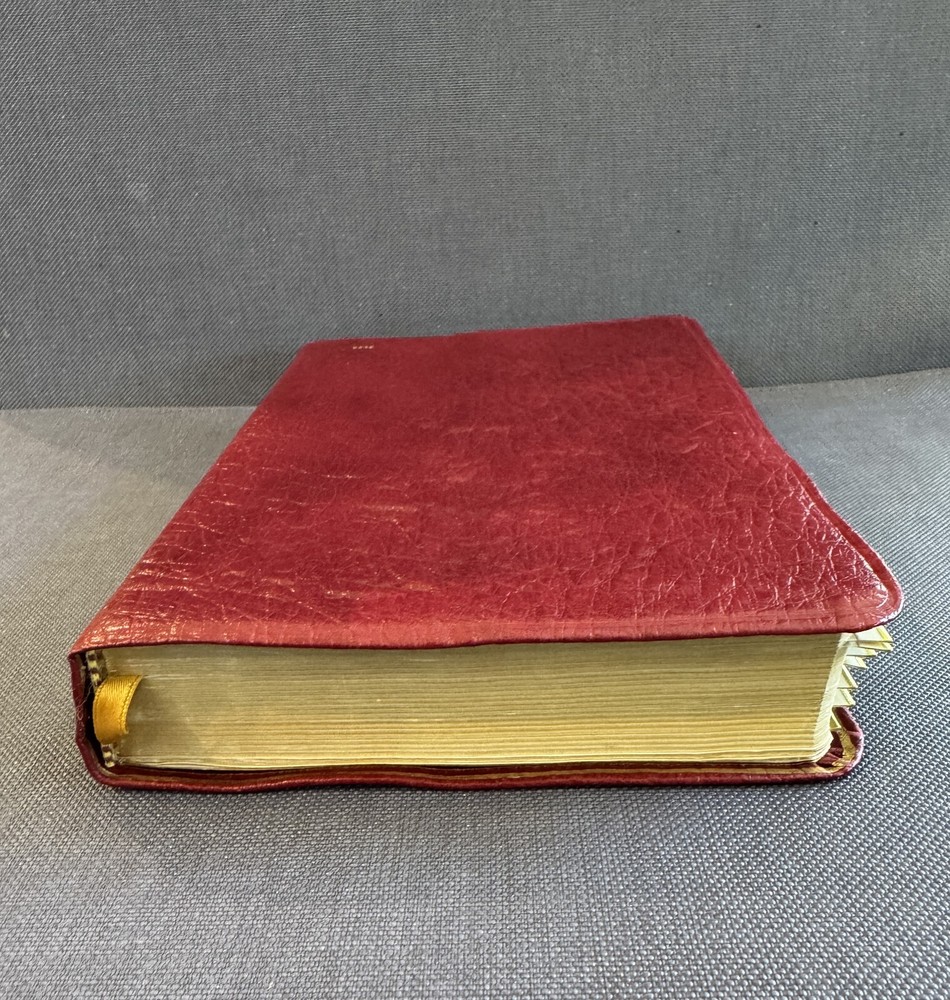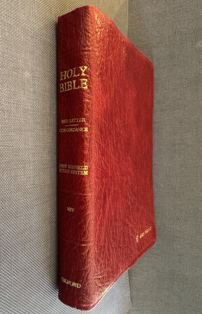 Holy Bible New International Version Red Letter Concordance New Scoffield Study System bound in burgundy leather published by Oxford University Press NY 1984. The bible is in acceptable condition with a clean cover embossed with the original owner's name, a blank "Presented To' pages but it has many pages with highlighting and some ink underlining. These can be seen in the pictures. It is model 6274, is 9-1/2" by 6-3/8" with 1,575 numbered pages and has both thumb indexes & tabs. Please view all the pictures for more information.