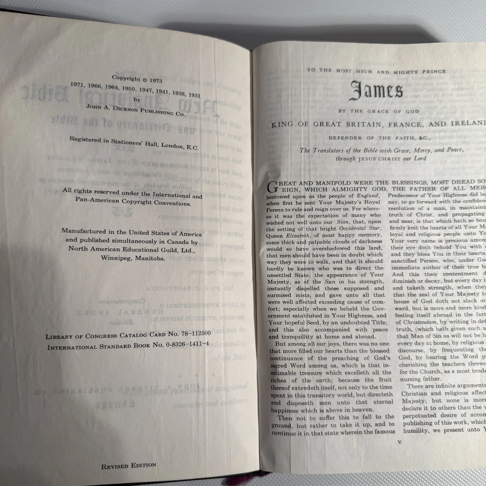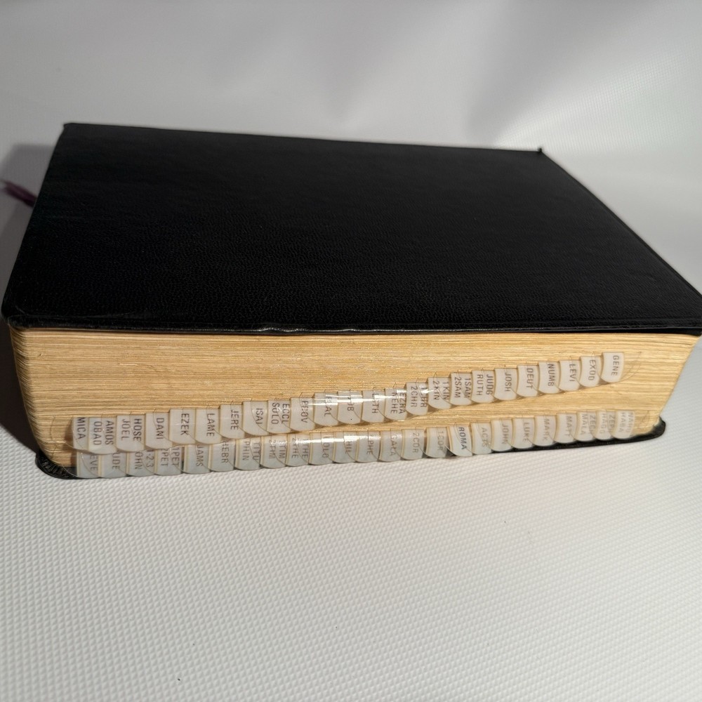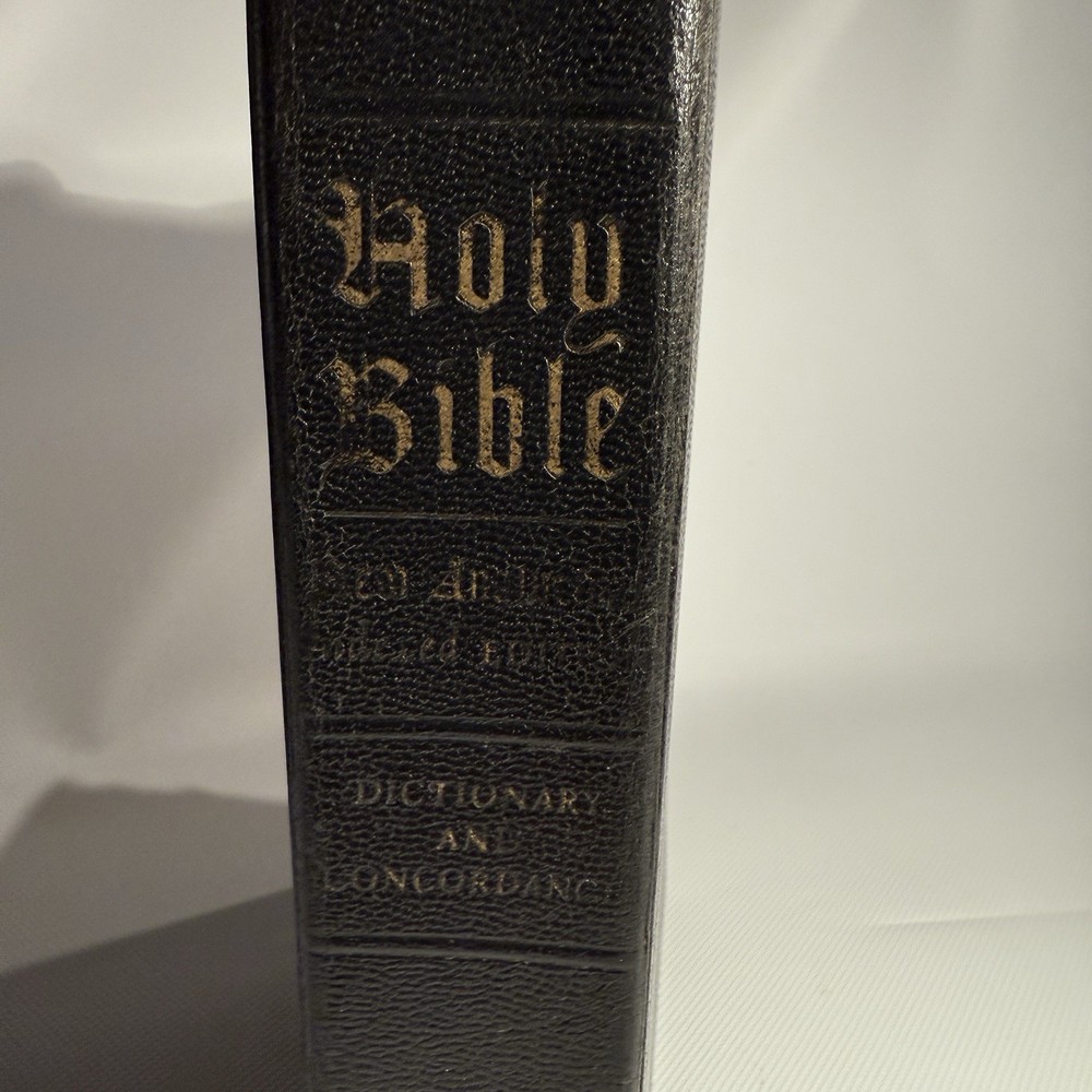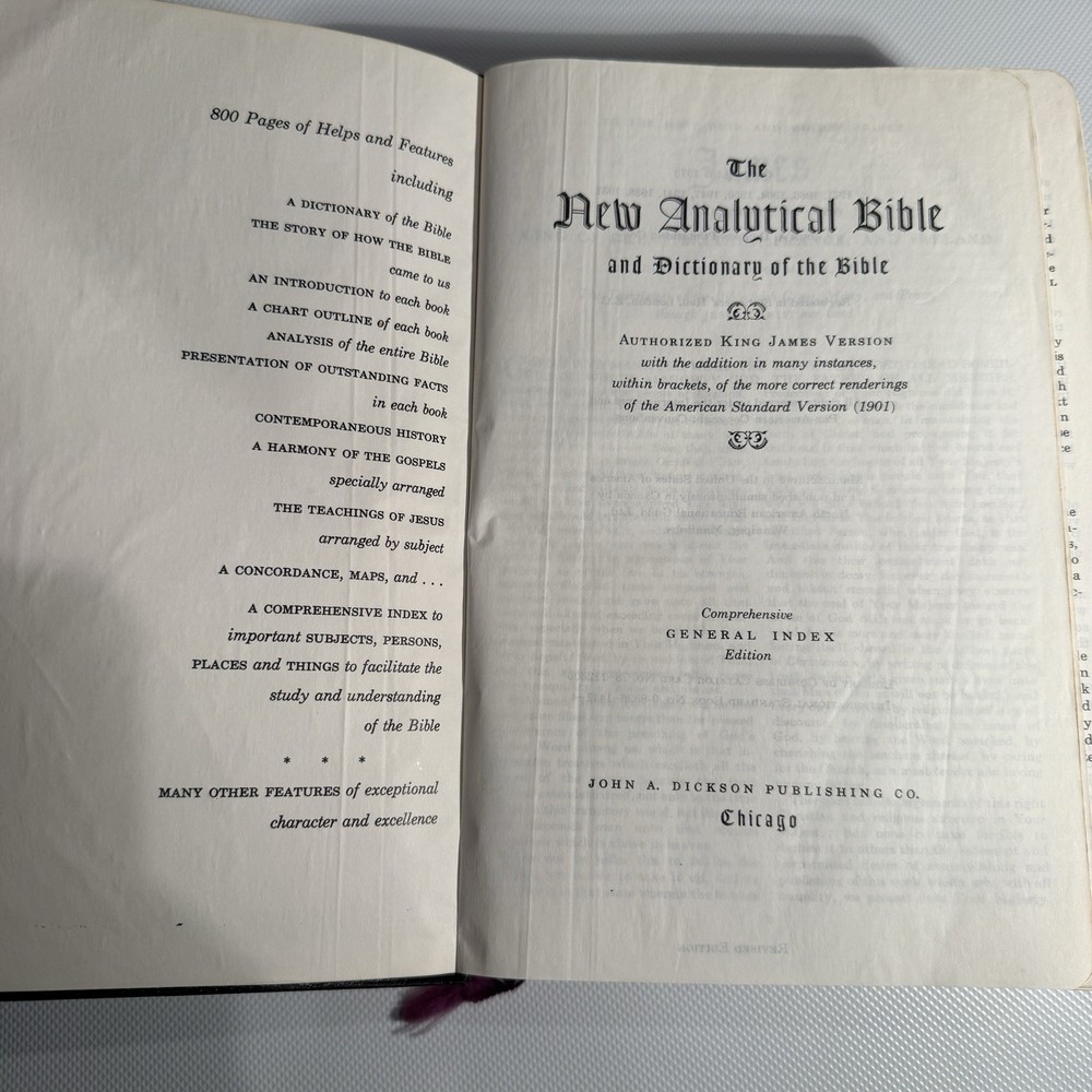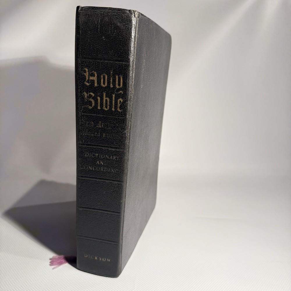 Holy Bible New Analytical Indexed Edition 1971 Morocco Leather John A Dickson It is the Authorized King James Version with added renderings from the American Standard Version (1901). It contains 800 pages of features, including (according to Google): -A Dictionary of the Bible -The Story of How the Bible Came to Us -An Introduction and Chart Outline for Each Book -Analysis of the Entire Bible -Presentation of Outstanding Facts -Contemporaneous History -A Harmony of the Gospels -The Teachings of Jesus -A Concordance and Maps -A Comprehensive Index In excellency used condition but does have some writing inside. Minimal highlighting, see photos.