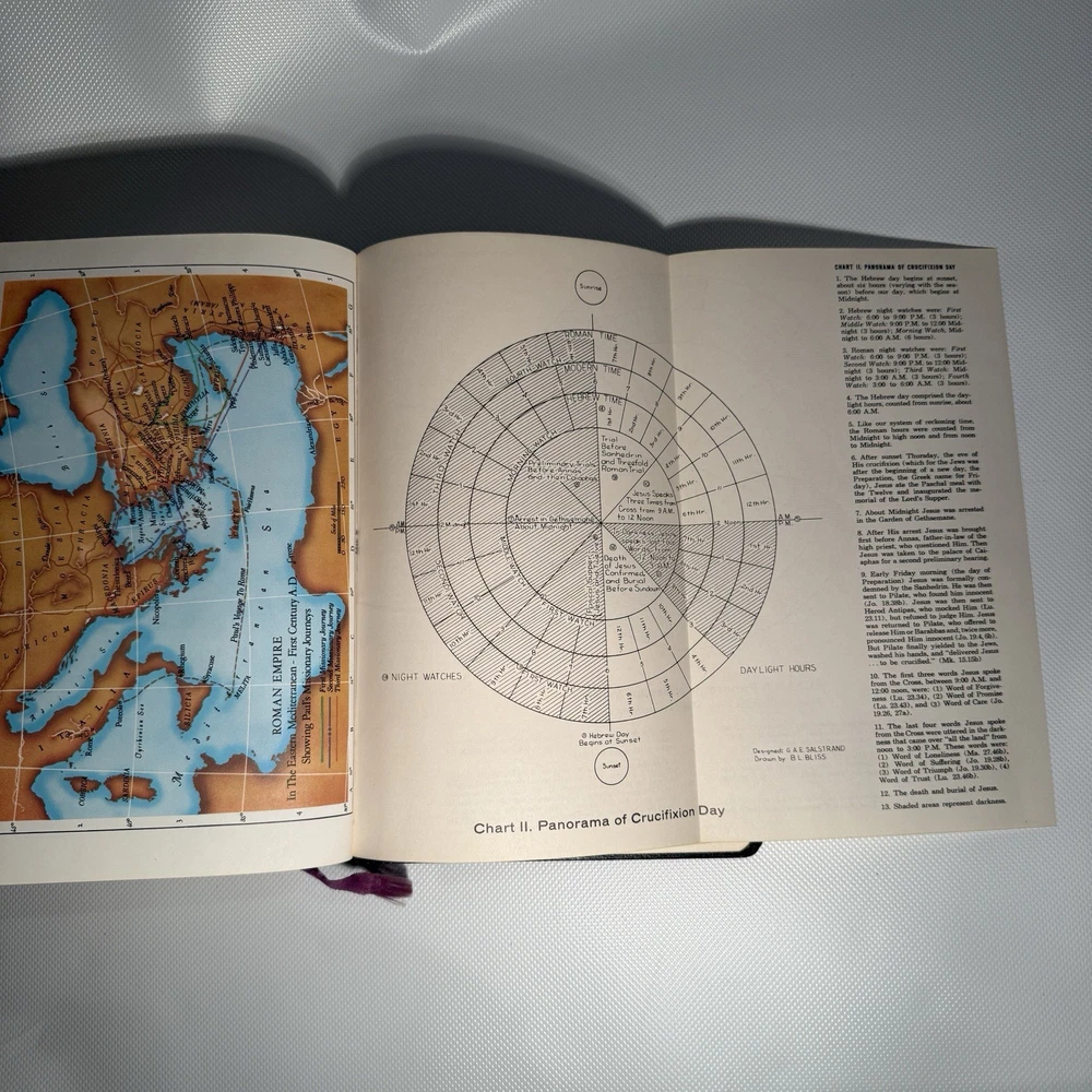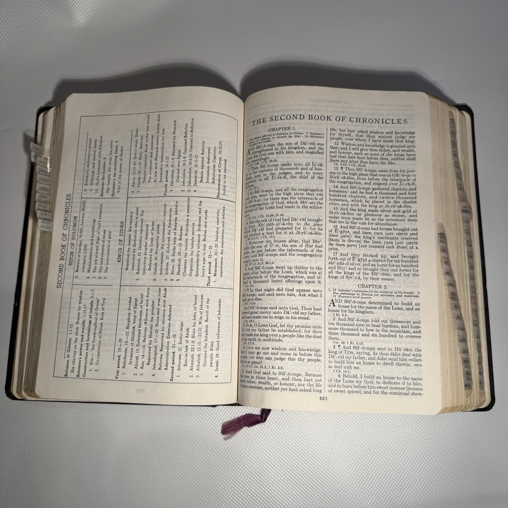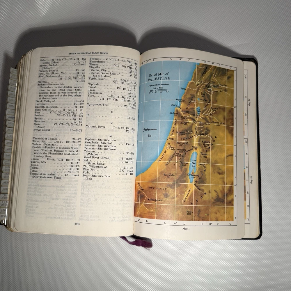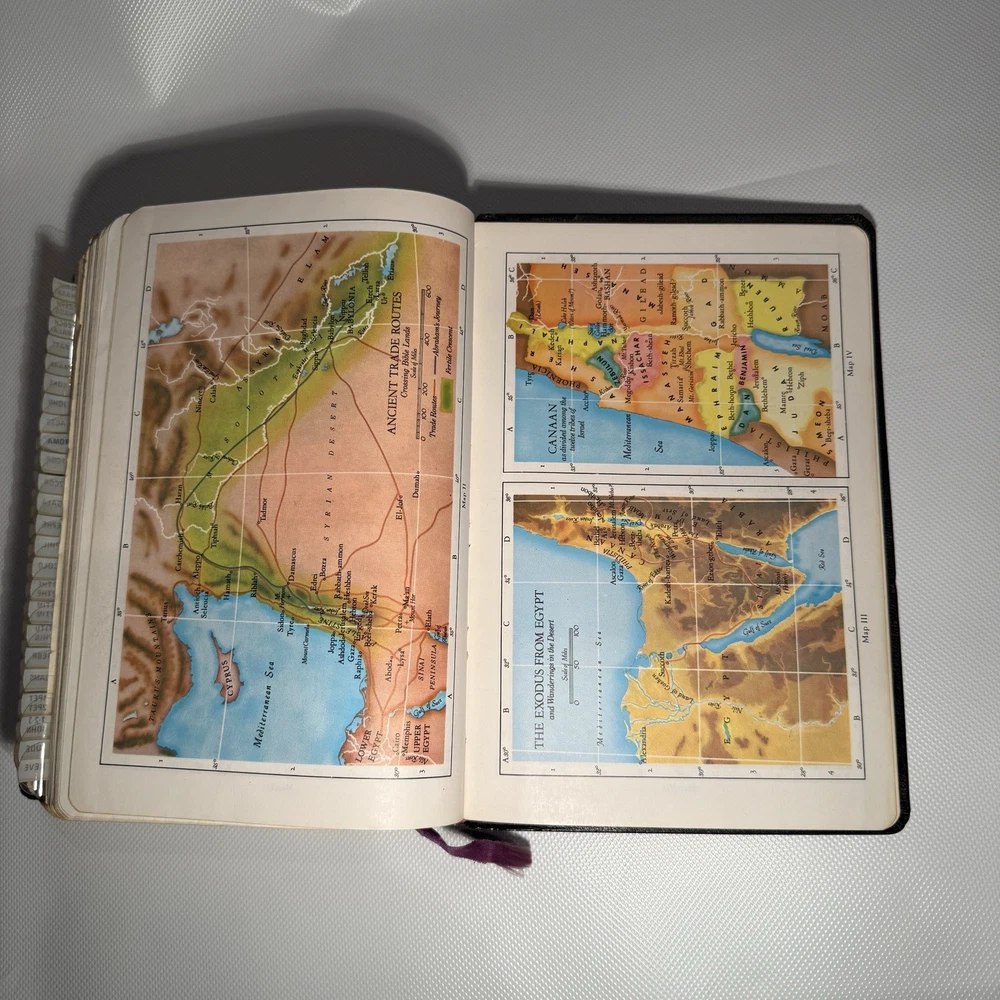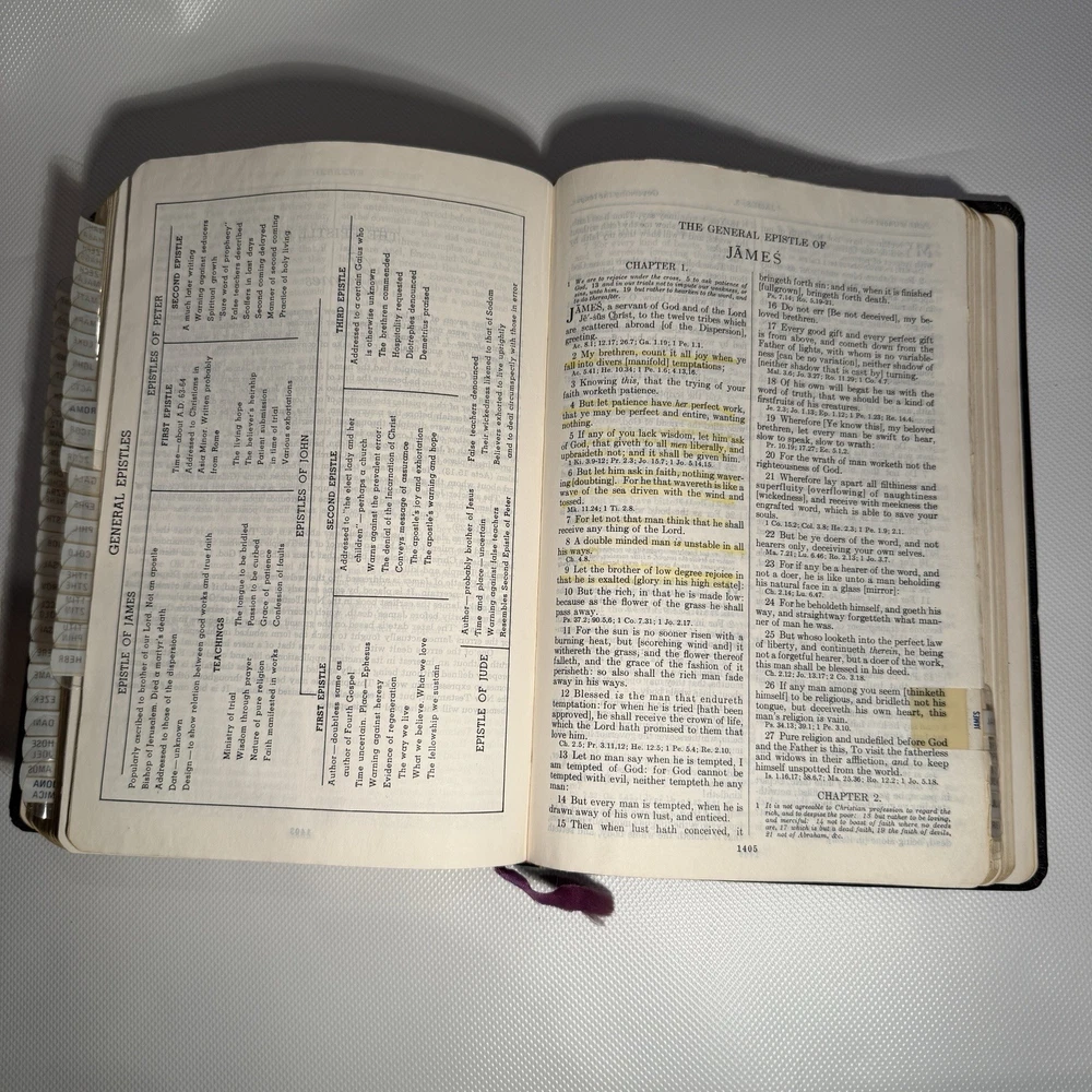 Holy Bible New Analytical Indexed Edition 1971 Morocco Leather John A Dickson It is the Authorized King James Version with added renderings from the American Standard Version (1901). It contains 800 pages of features, including (according to Google): -A Dictionary of the Bible -The Story of How the Bible Came to Us -An Introduction and Chart Outline for Each Book -Analysis of the Entire Bible -Presentation of Outstanding Facts -Contemporaneous History -A Harmony of the Gospels -The Teachings of Jesus -A Concordance and Maps -A Comprehensive Index In excellency used condition but does have some writing inside. Minimal highlighting, see photos.
