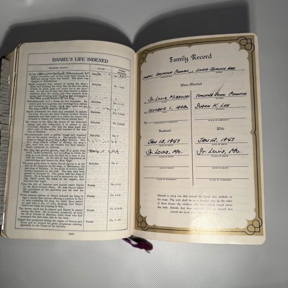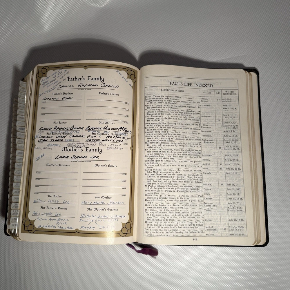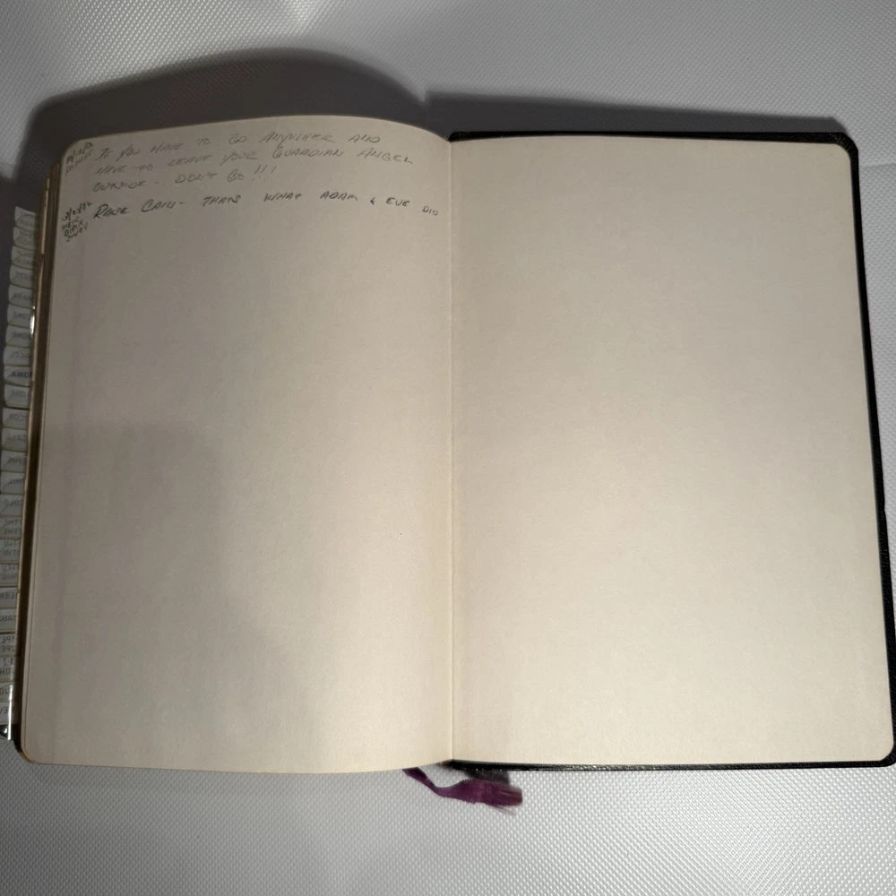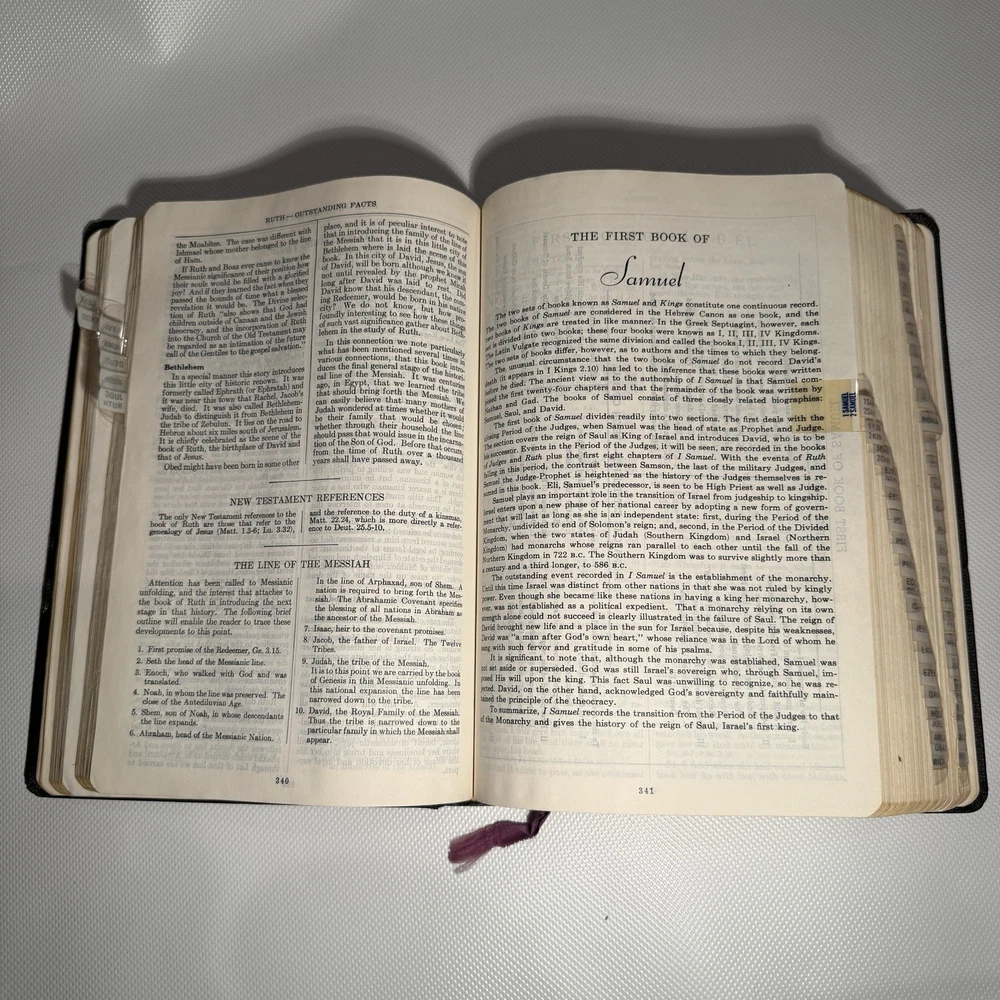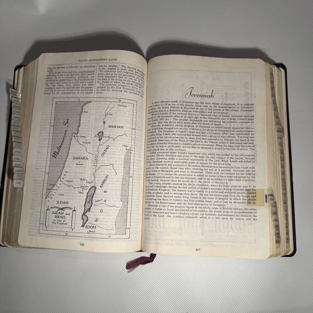 Holy Bible New Analytical Indexed Edition 1971 Morocco Leather John A Dickson It is the Authorized King James Version with added renderings from the American Standard Version (1901). It contains 800 pages of features, including (according to Google): -A Dictionary of the Bible -The Story of How the Bible Came to Us -An Introduction and Chart Outline for Each Book -Analysis of the Entire Bible -Presentation of Outstanding Facts -Contemporaneous History -A Harmony of the Gospels -The Teachings of Jesus -A Concordance and Maps -A Comprehensive Index In excellency used condition but does have some writing inside. Minimal highlighting, see photos.