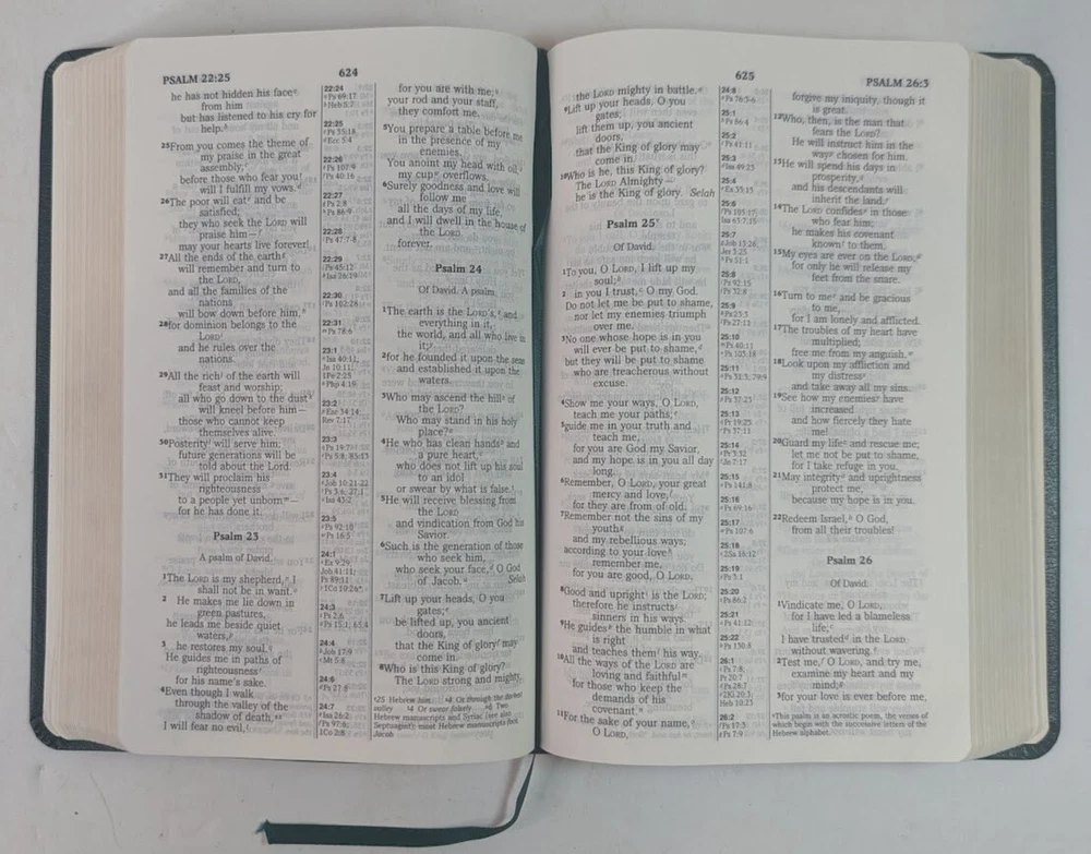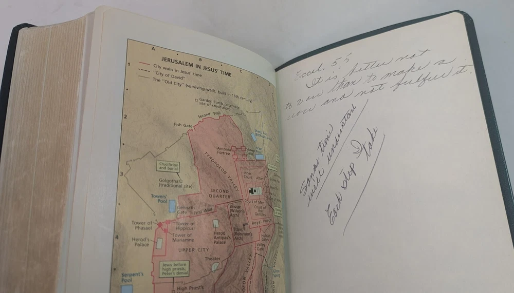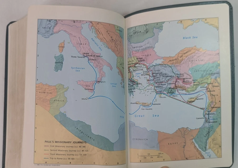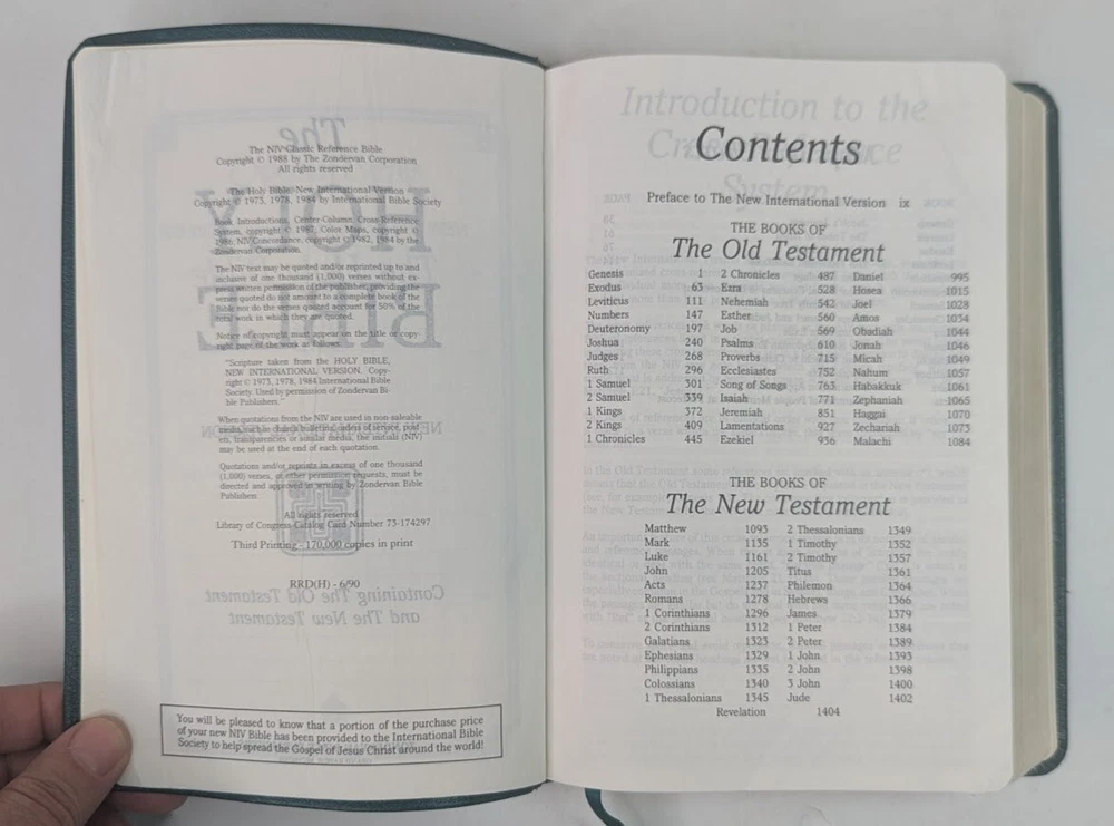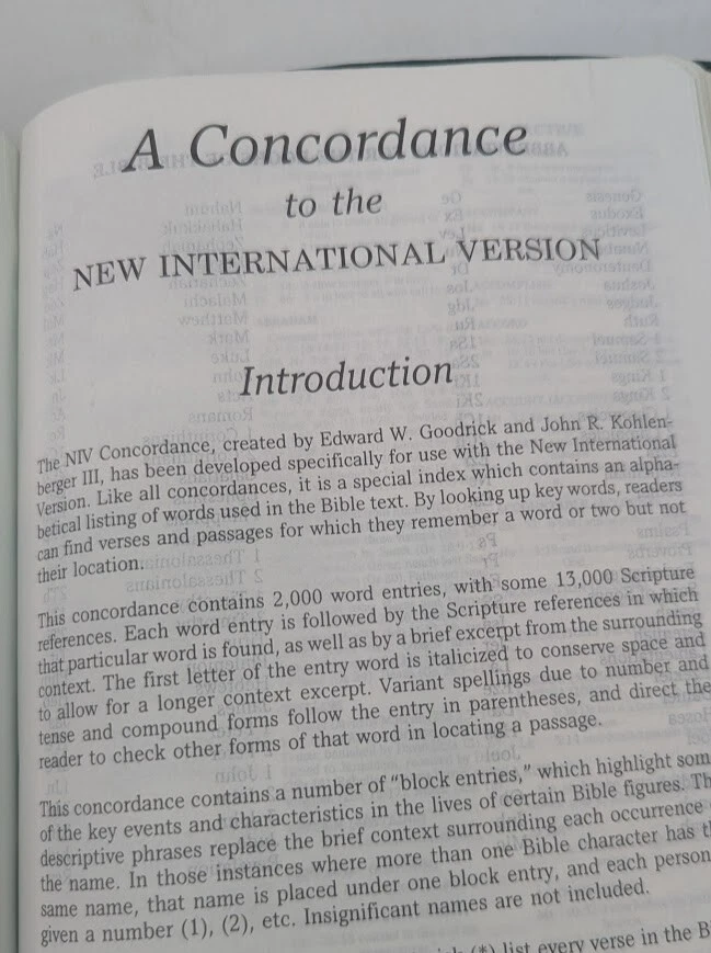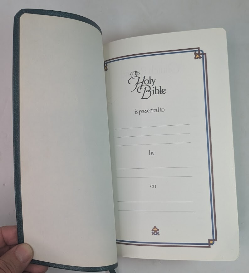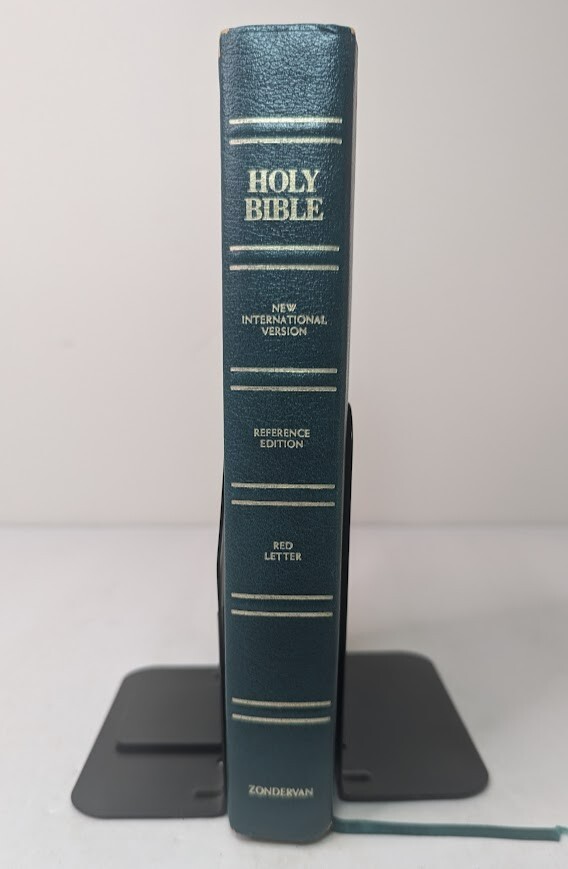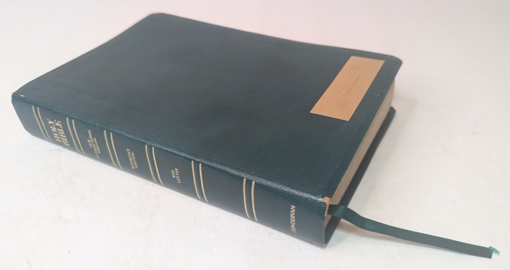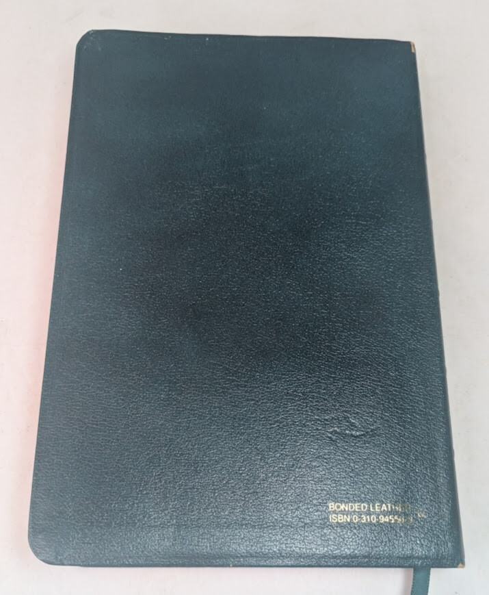 ***** HOLY BIBLE published 1988 by Zondervan ***** New International Version (NIV) Reference Edition Red-Letter Gilded Pages Unique and Stylish 'Teal Green' Bonded Leather Cover Concordance Color Maps Easy-To-Carry size (appx. 9" x 6" x 1") Front Cover has an engraved name-plate that can most likely be removed Only handwriting found is on inside back cover as shown in picture 11 +++++++++++++++++++++++++++++++++++++++++++++++++++++++++ Please visit my eBay store: Lightnin Strikes! for more cool items Ships from a pet-free, smoke-free home. Please see pictures for Visual Description. Please contact me with any questions. Enjoy and Best Wishes!