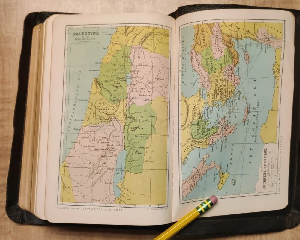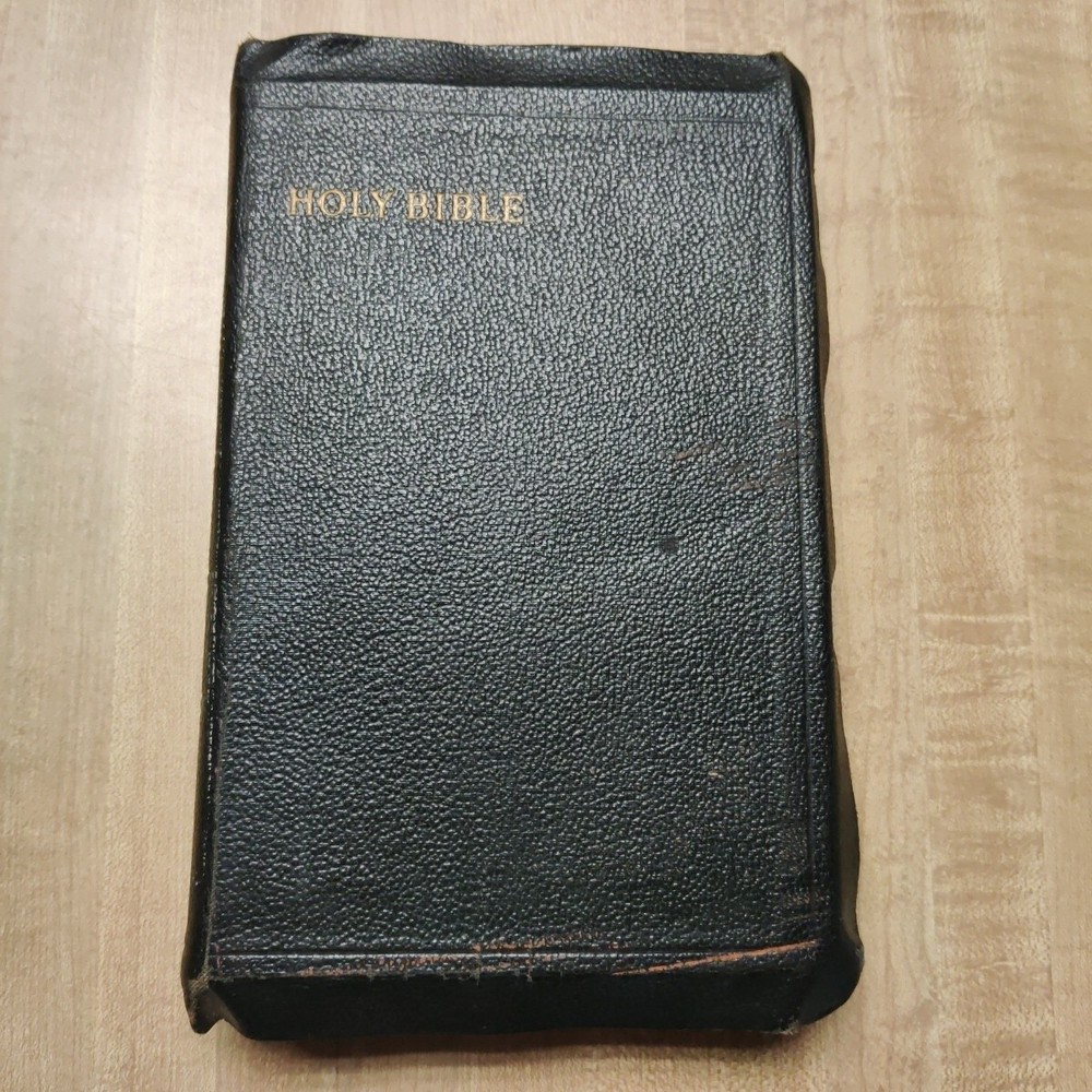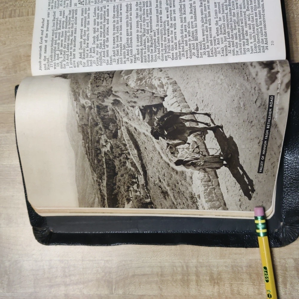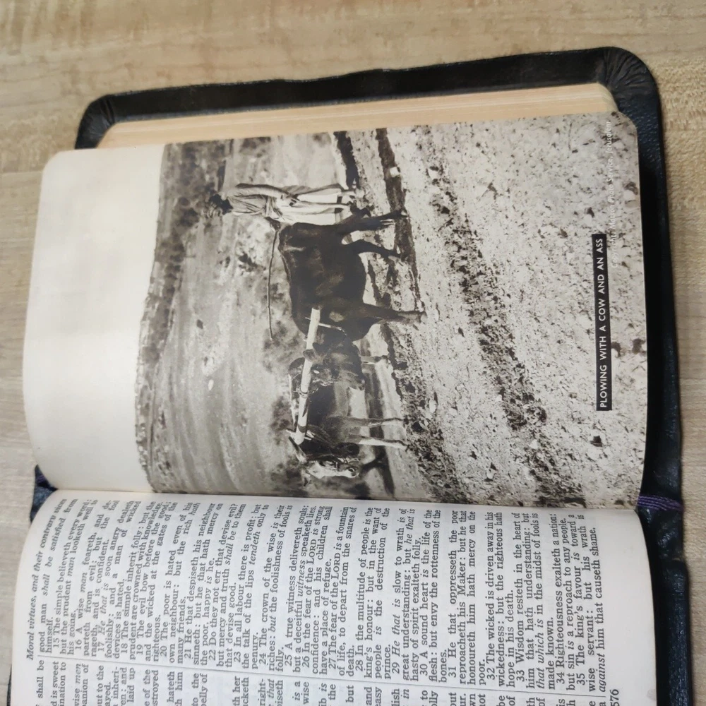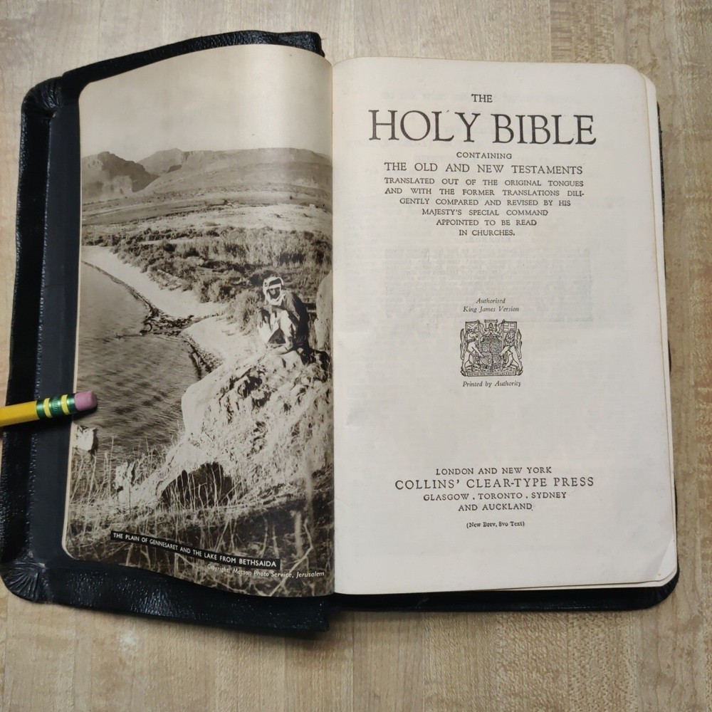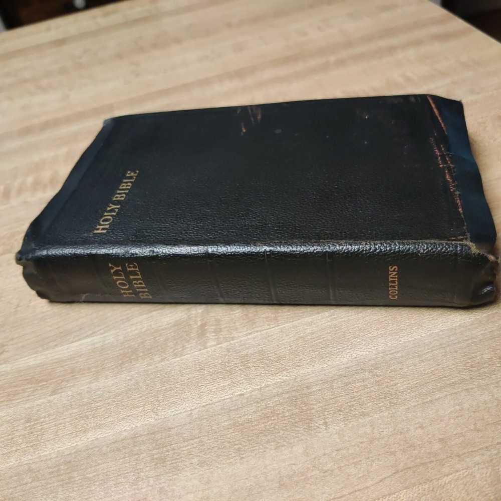 This beautiful leather-bound Holy Bible contains both the Old and New Testaments in the King James Version. Printed by Collins' Clear-Type Press in 1953, this edition features color illustrations, glossy photographs, maps & pages of supplementary material. The book measures 8'' in height, 5'' in width, and 1'' in length, making it the perfect size for young adults and adults alike. Leather is in good sturdy shape with some marking on front and bends around the edges and minor tear on inside front cover. Pages are in great shape and not underlined. Besides the "Presented to"page, there is no other ink or pencil markings I have found. Illustrated paintings are vibrant with color. Please see all pictures for best details. In addition to its religious significance, this Bible is also an impressive vintage piece, perfect for collectors or those looking to add a touch of history to their library. The book is illustrated throughout and features a variety of aspects, including its country of origin (Great Britain), intended audience (young adults and adults), and genre (religious and spiritual). This is a truly special item that would make a wonderful addition to any collection.