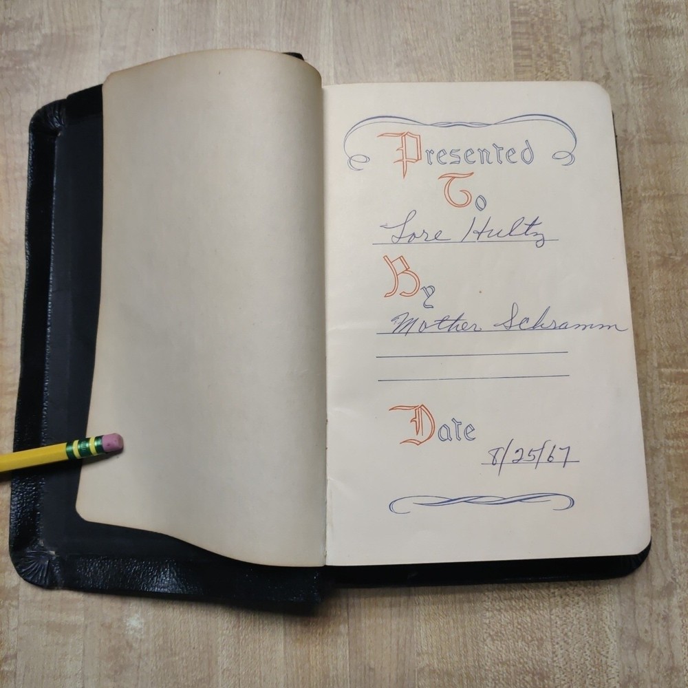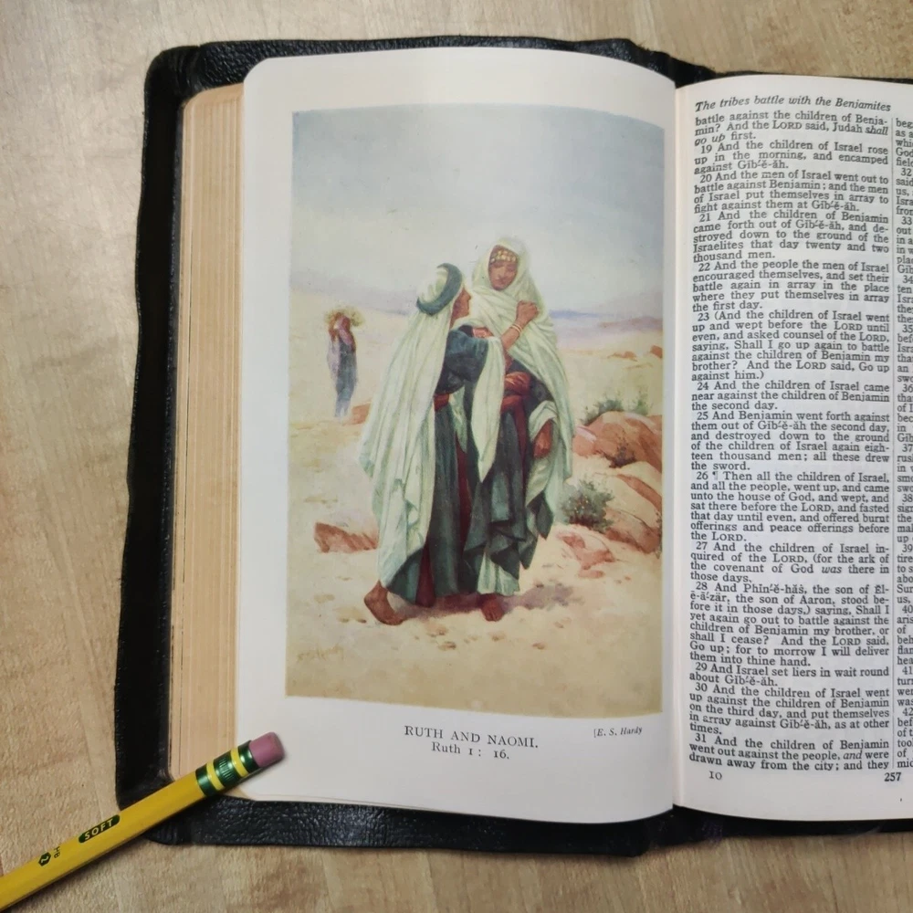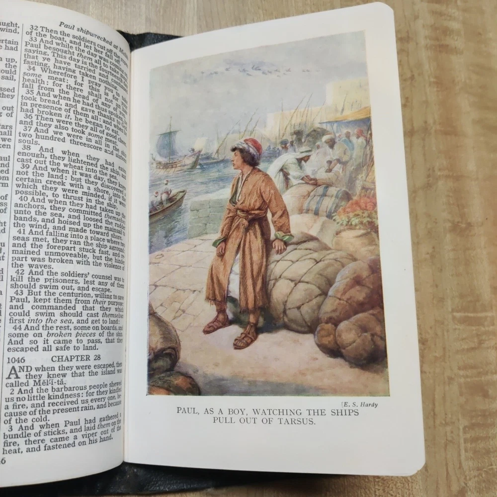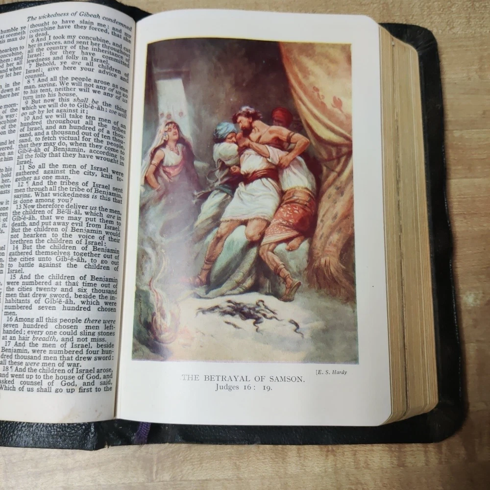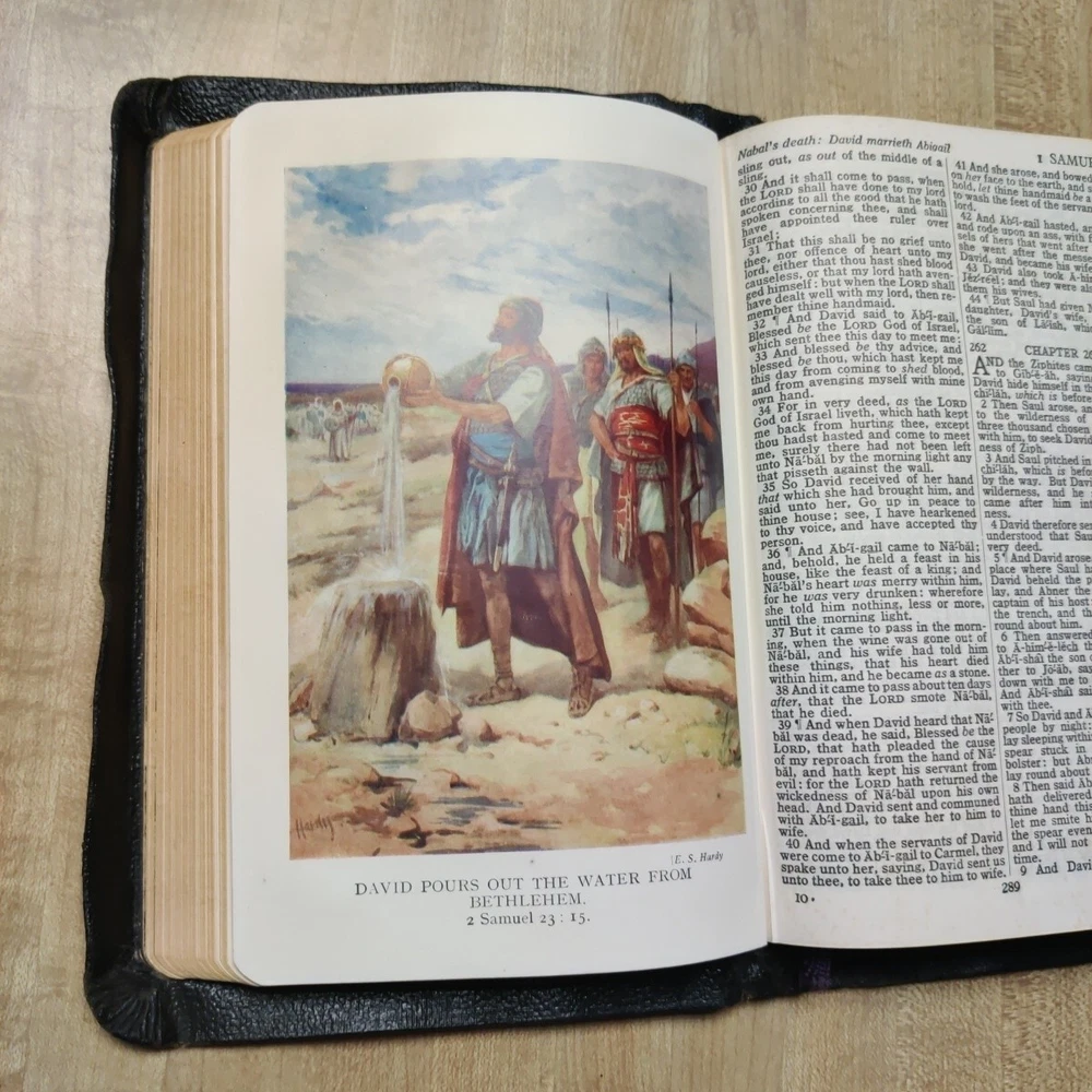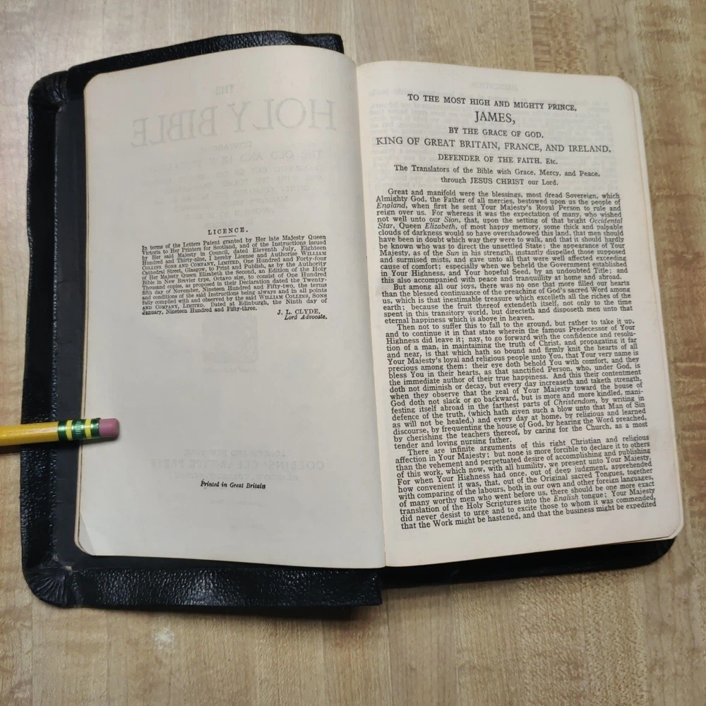 This beautiful leather-bound Holy Bible contains both the Old and New Testaments in the King James Version. Printed by Collins' Clear-Type Press in 1953, this edition features color illustrations, glossy photographs, maps & pages of supplementary material. The book measures 8'' in height, 5'' in width, and 1'' in length, making it the perfect size for young adults and adults alike. Leather is in good sturdy shape with some marking on front and bends around the edges and minor tear on inside front cover. Pages are in great shape and not underlined. Besides the "Presented to"page, there is no other ink or pencil markings I have found. Illustrated paintings are vibrant with color. Please see all pictures for best details. In addition to its religious significance, this Bible is also an impressive vintage piece, perfect for collectors or those looking to add a touch of history to their library. The book is illustrated throughout and features a variety of aspects, including its country of origin (Great Britain), intended audience (young adults and adults), and genre (religious and spiritual). This is a truly special item that would make a wonderful addition to any collection.