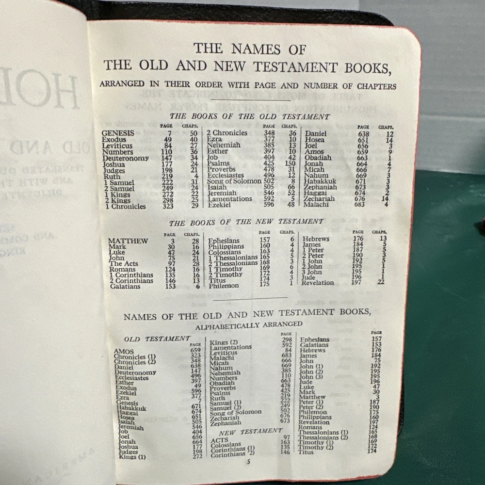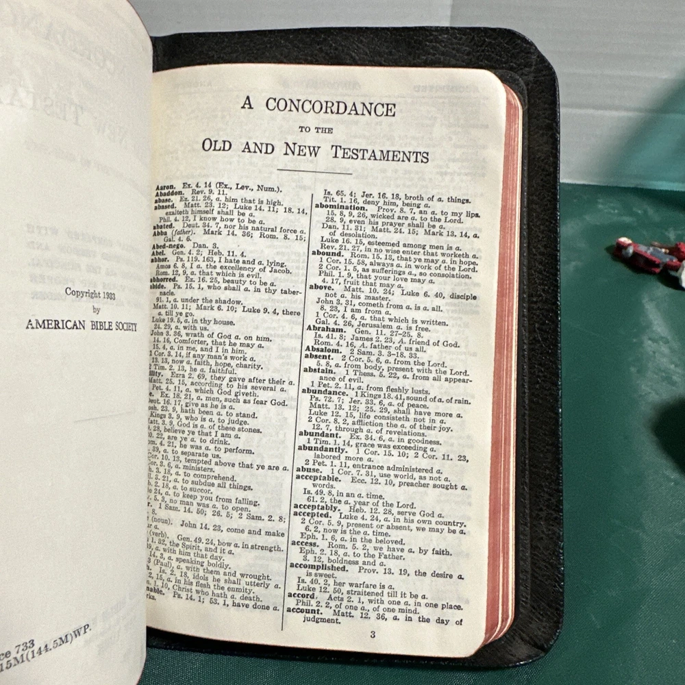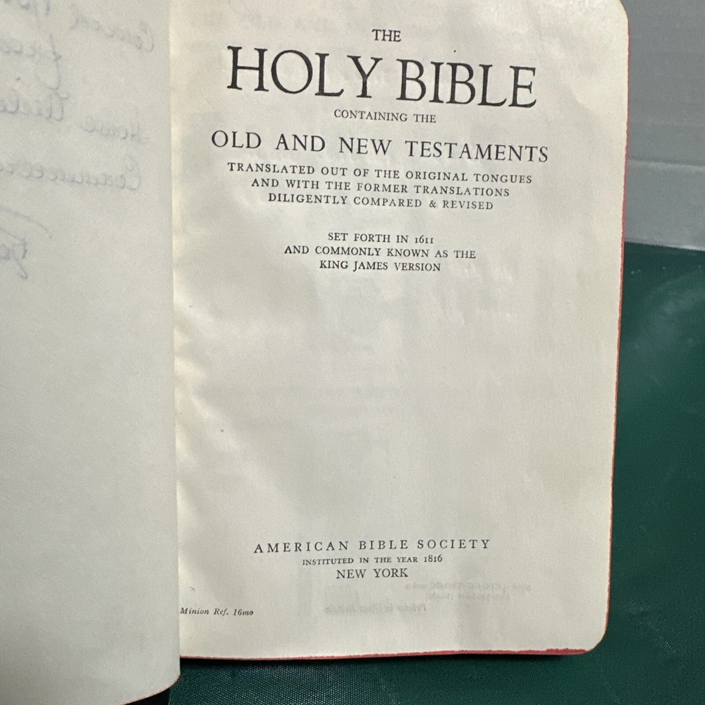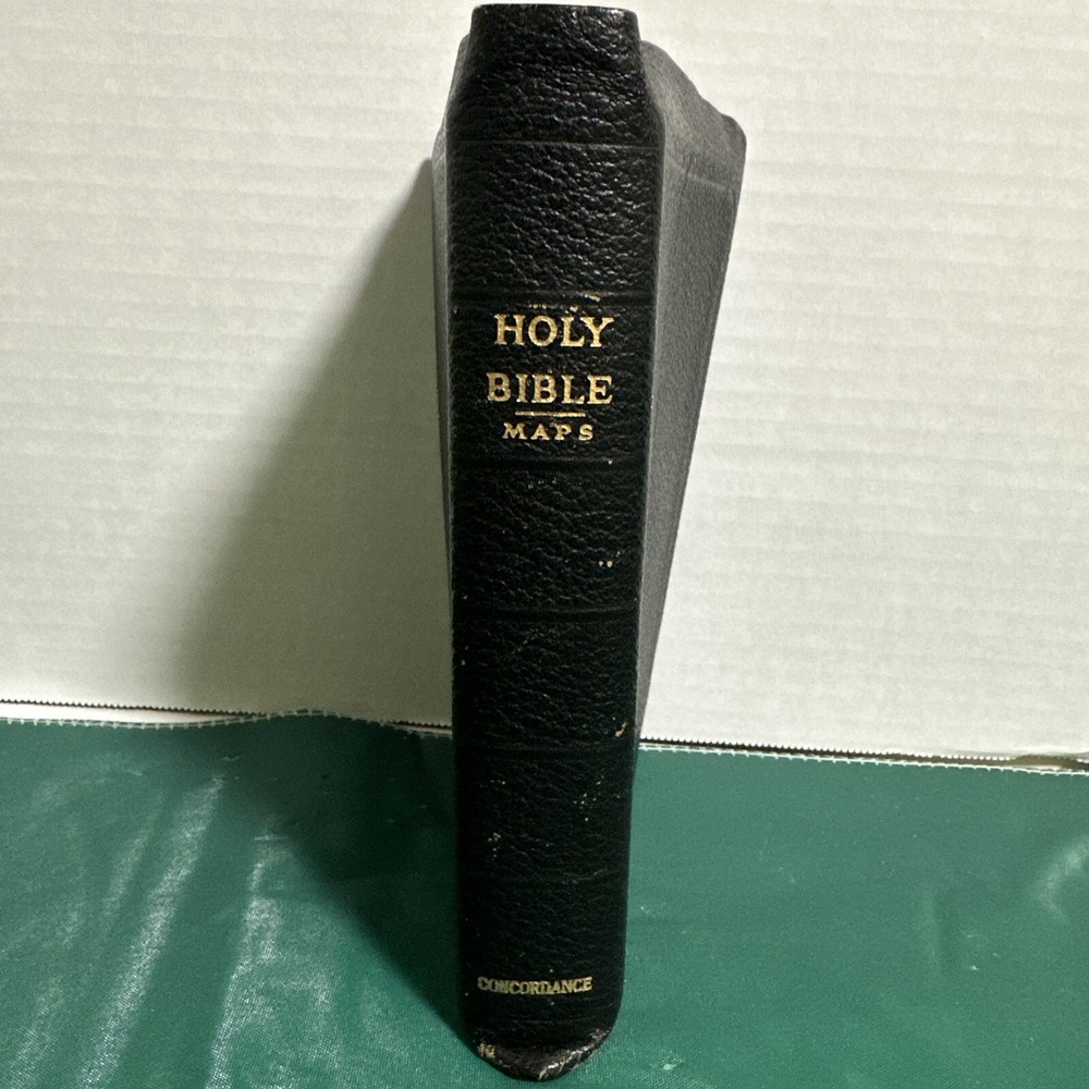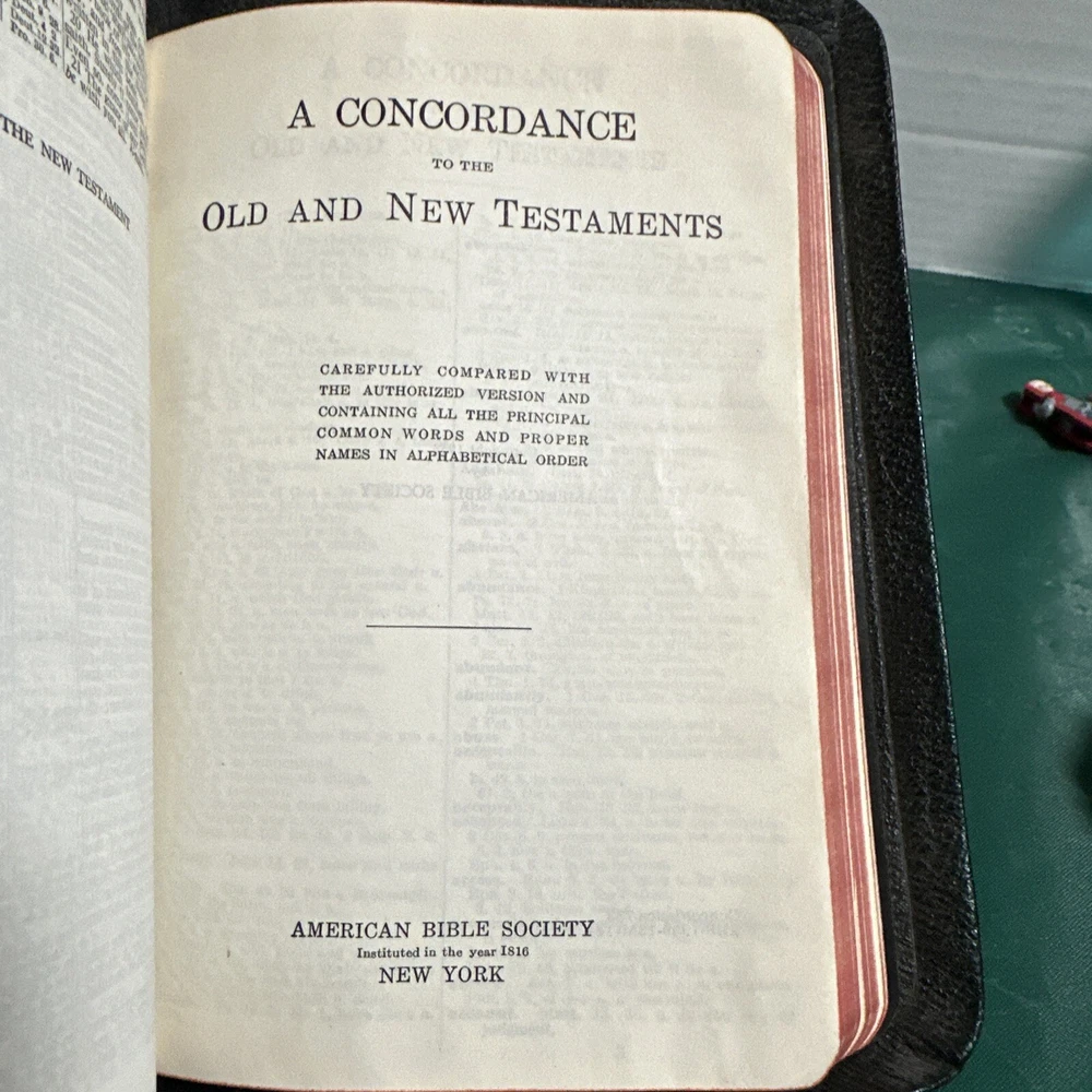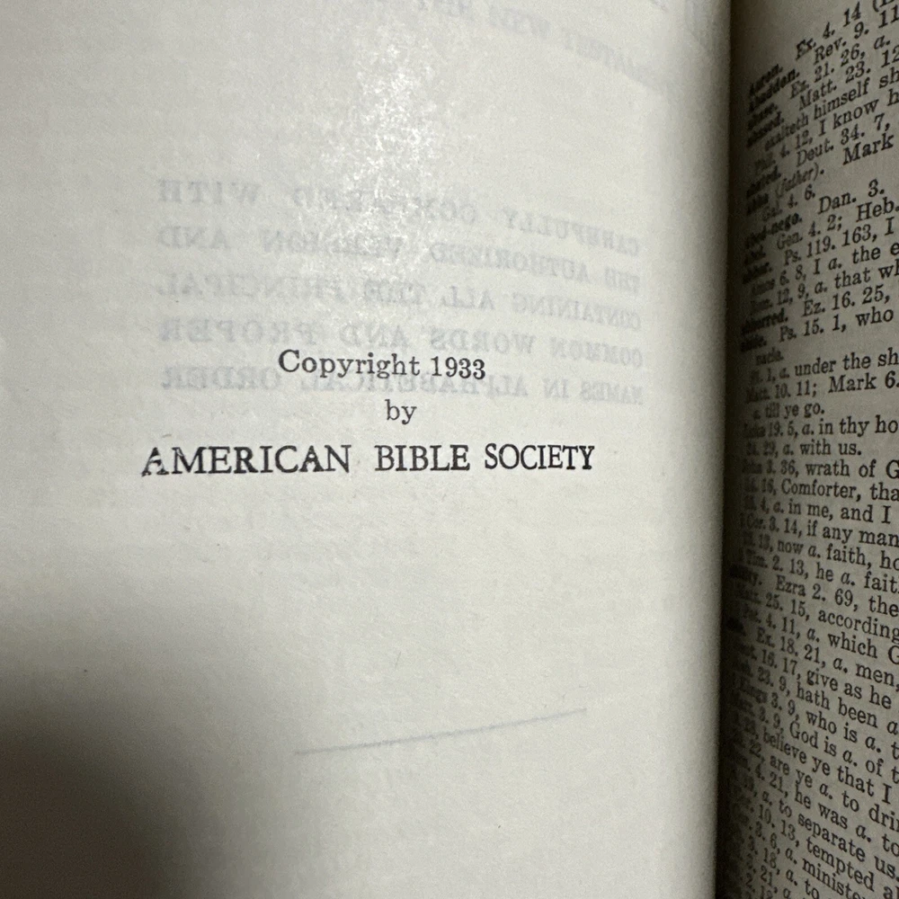 This is inscribed on the inside as seen in pictures. The only date I could find is in the back at the concordance and it is dated 1933. This bible is in really nice condition for its age. Any questions please ask. This is a rare and collectible edition of the Holy Bible, featuring both the Old and New Testaments. The leather-bound cover and English language make for a timeless addition to any collection. The book also includes special features such as maps and a concordance, which provide valuable context and insight into the text. The publisher, American Bible Society, is well-known for their dedication to producing quality religious texts. This original edition is a perfect addition for those interested in religious and spiritual subjects.