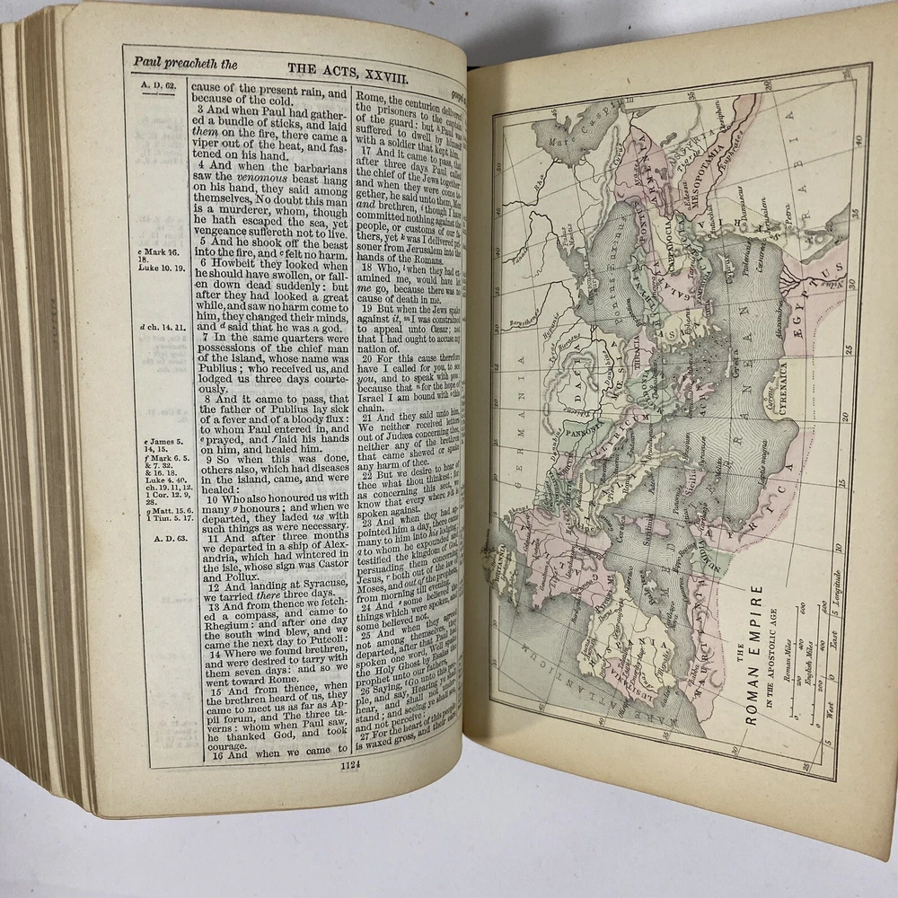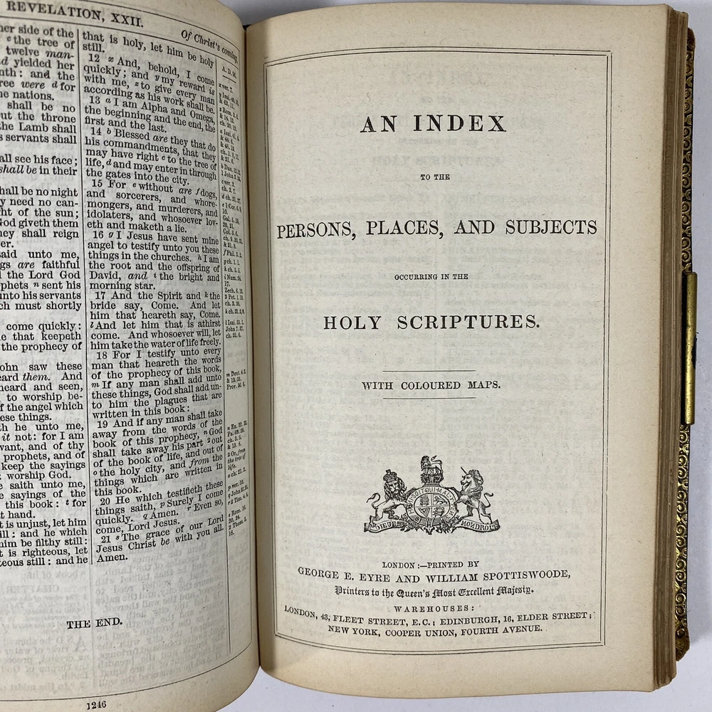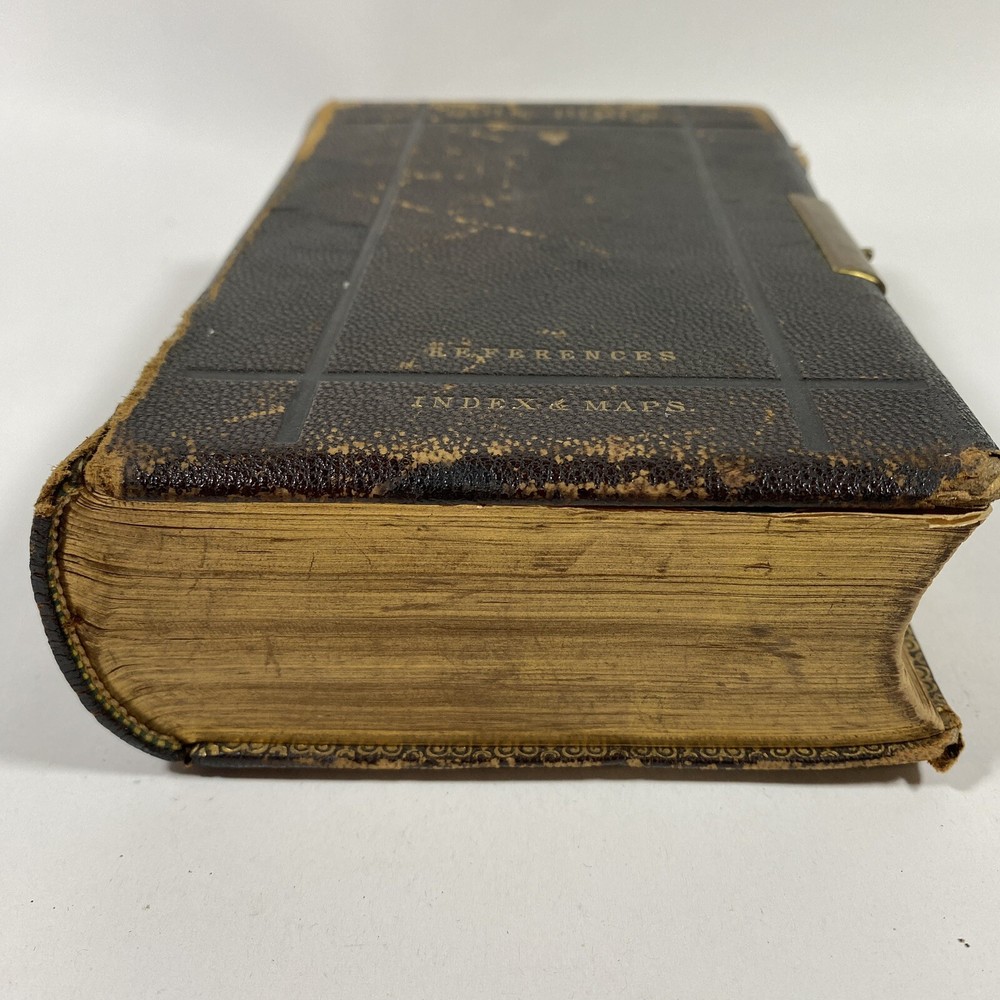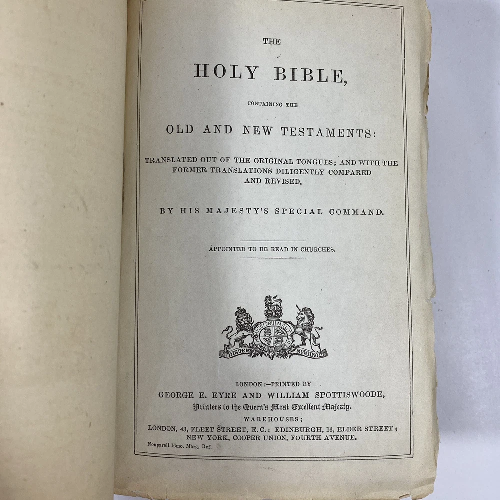 Holy Bible Printed by Eyre and Spottiswoode Late 1870s with Color Maps & Index. Several pages in the front have come loose. Clasp is missing. Please view and zoom in on all photos before buying. Shipping Your item ships within three business day after payment is received. The USPS can have delays in delivering packages. Estimated delivery times and actual delivery times for receiving packages may vary. Postal service delays are beyond our control. Please be patient. Ebay calculates the shipping charge to the buyer using information such as distance from seller to buyer, package dimensions and weight and current USPS postal rates. We use recycled packaging material on most orders. We pack securely but the Post Office sometimes damages items in transit. The cost of insurance is included as a handling charge for all items over $100. Signature confirmation is required for high dollar items. We only ship to the verified address associated with your eBay account. Some large or fragile items are local pick up only. Return Policy Domestic returns accepted. Buyer pays return shipping fees. Item(s) must be returned unused, in its original condition or in its unopened package if applicable. Numbered inventory bands are attached to some items. Band must be intact, in its original position for return to be accepted. Thanks for Shopping!