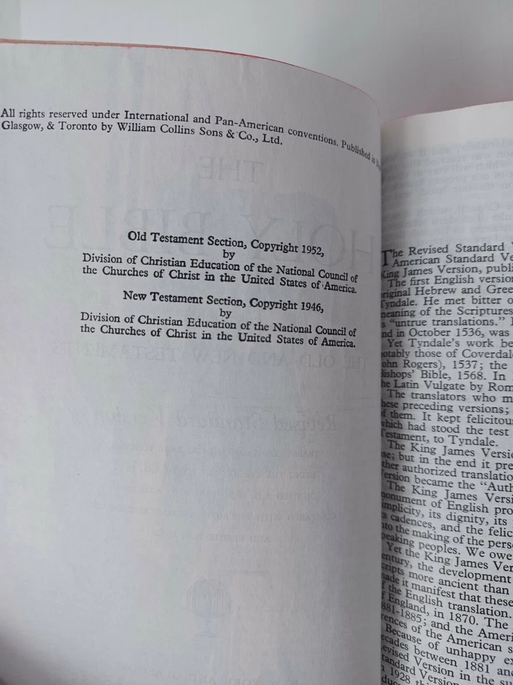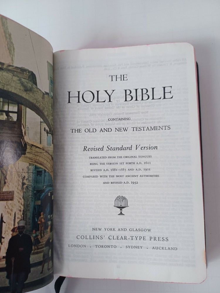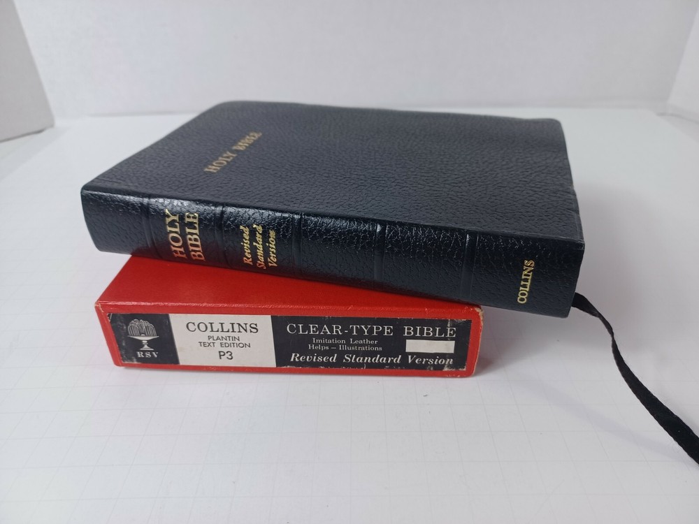 Holy Bible: RSV Old & New, 1952 Collins' Clear-Type Press, Faux Leather P3 Box good / very good condition, writing on presentation page and the Acts section, see pictures for details many other books and bibles in our store Buy with confidence , shipped with care Shipped USPS